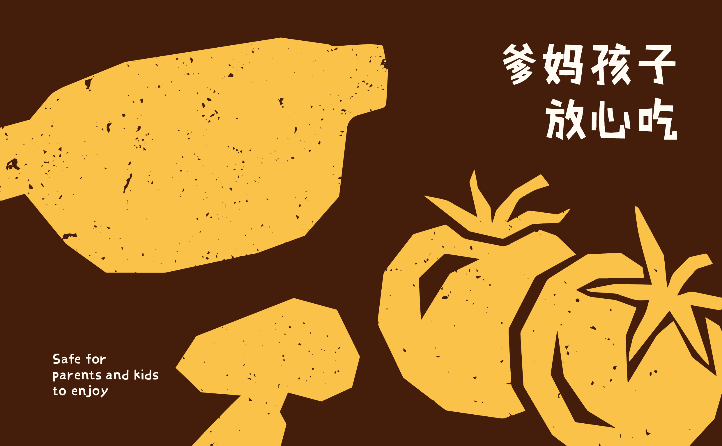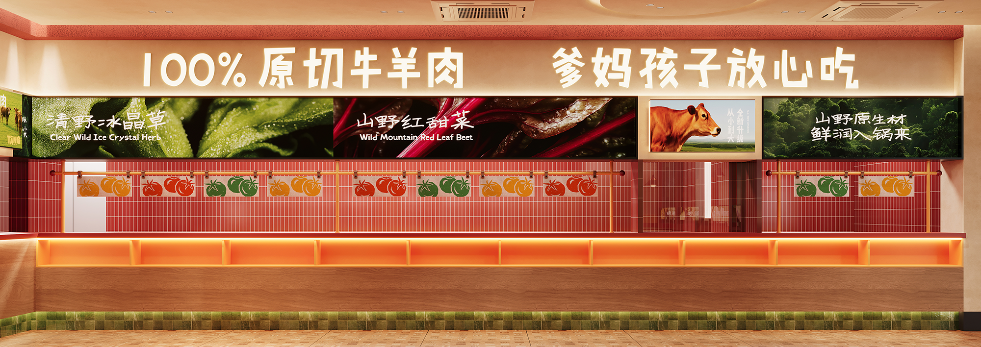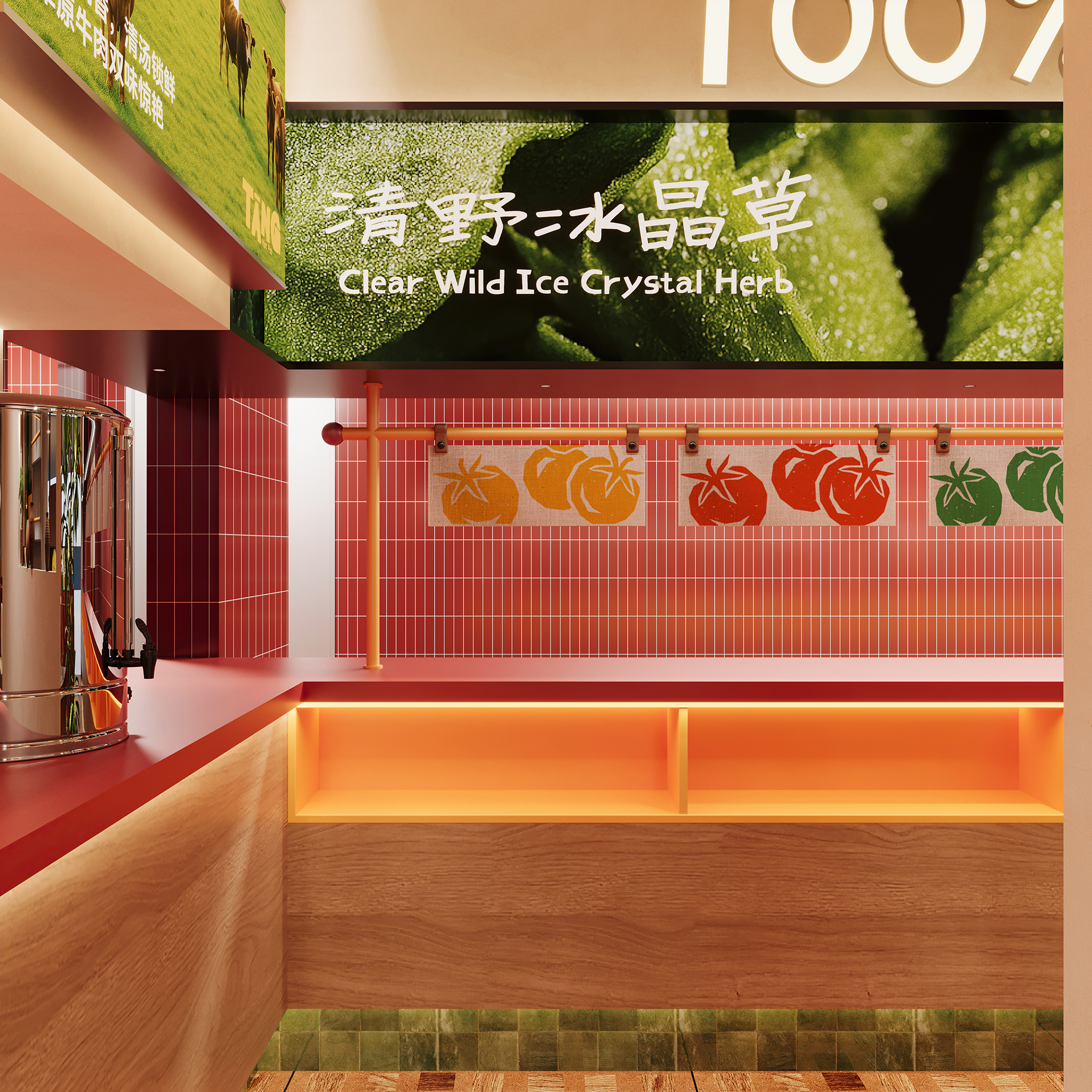门头区域以敞开式的姿态,将店内场景温和地呈现于外。「放心」与「新鲜」被转化为可触摸的场景:中心区域的器物与绿植,以自然松散的姿态层叠环绕着标识,形成一种生动粗朴的秩序感;侧墙则通过明黄色砖块与立体红色番茄的体量碰撞,在色彩与形态上交叠出鲜活、有机的视觉印象。在步入空间前,就让人可以感知品牌承诺的安心与本味。