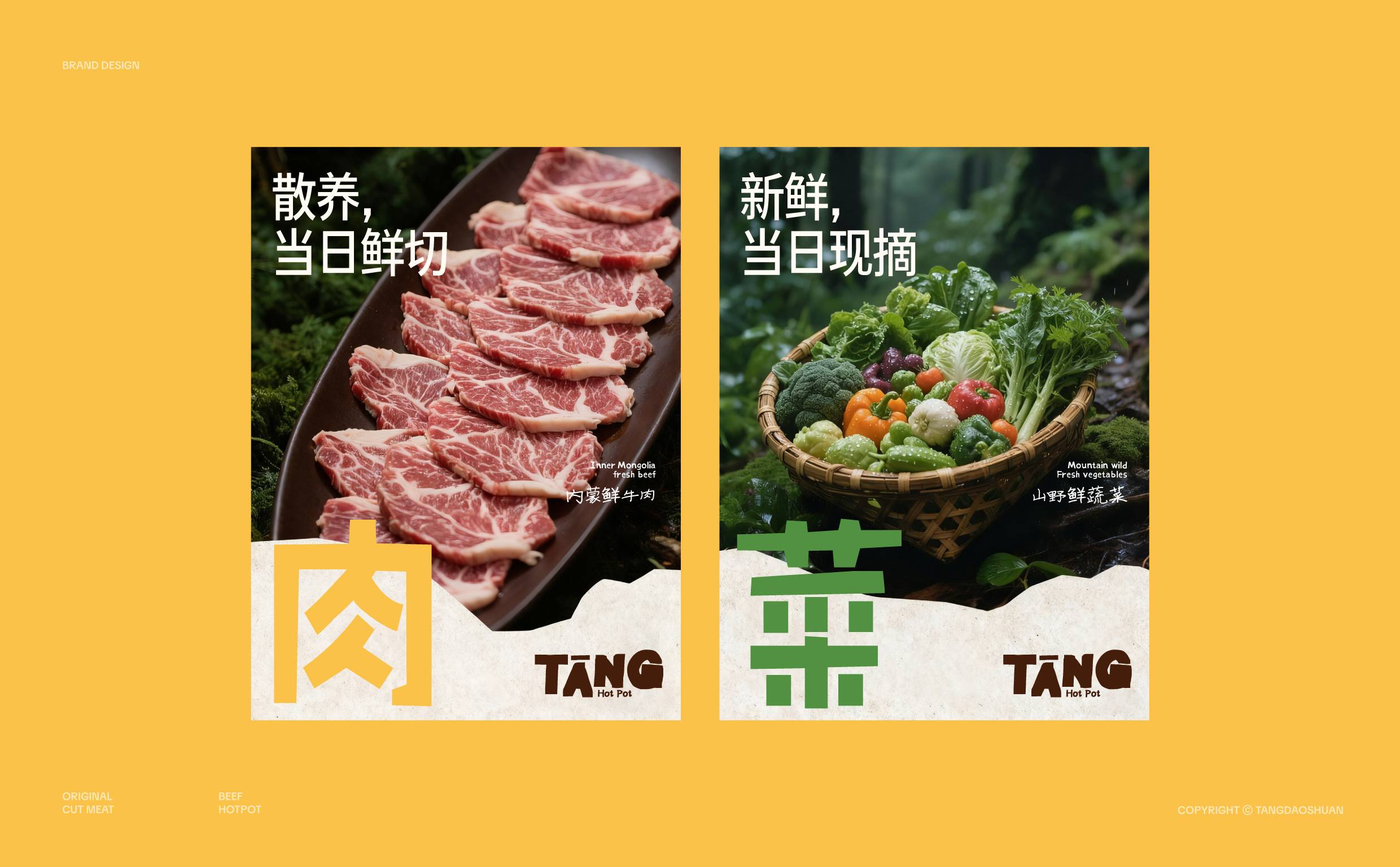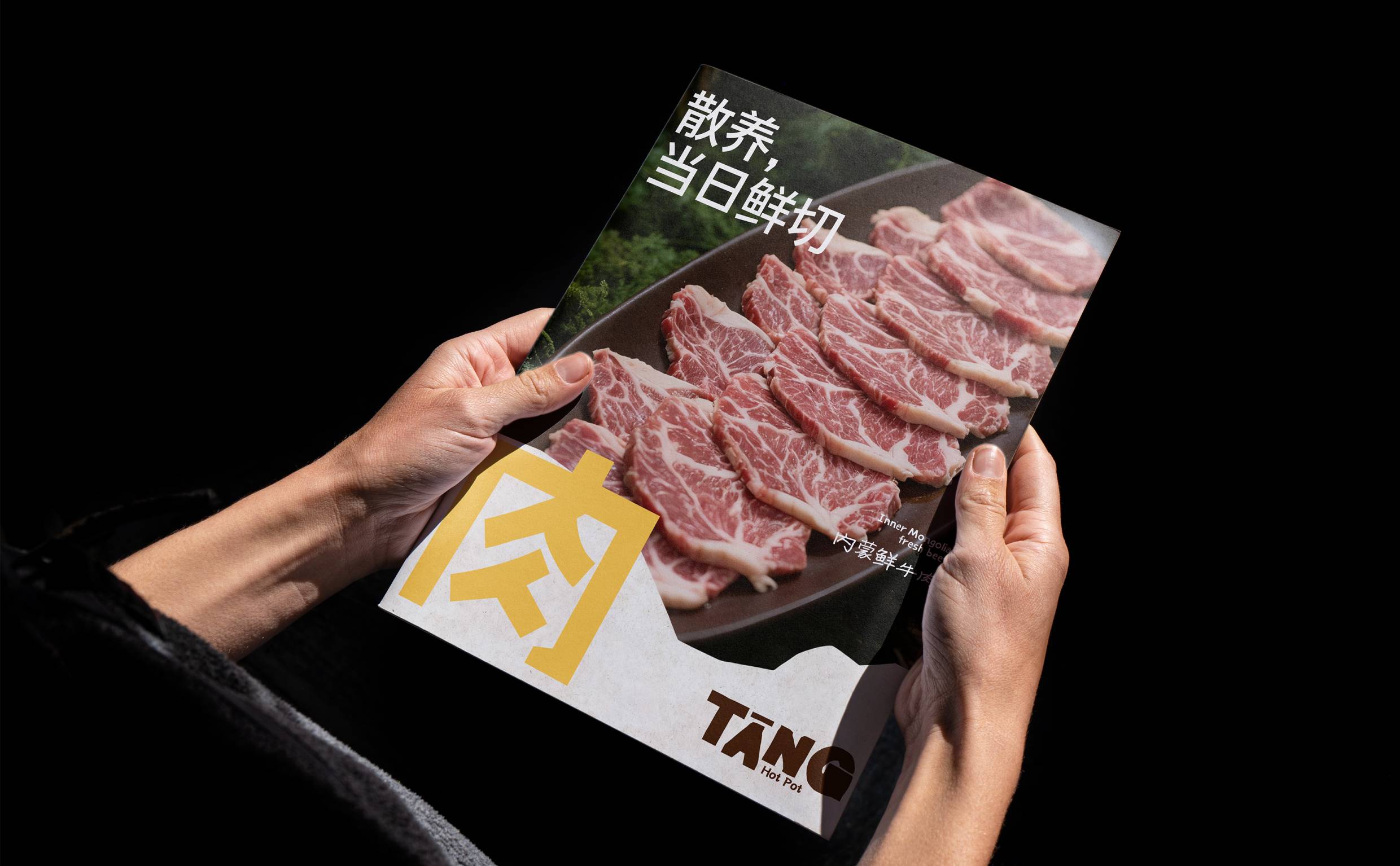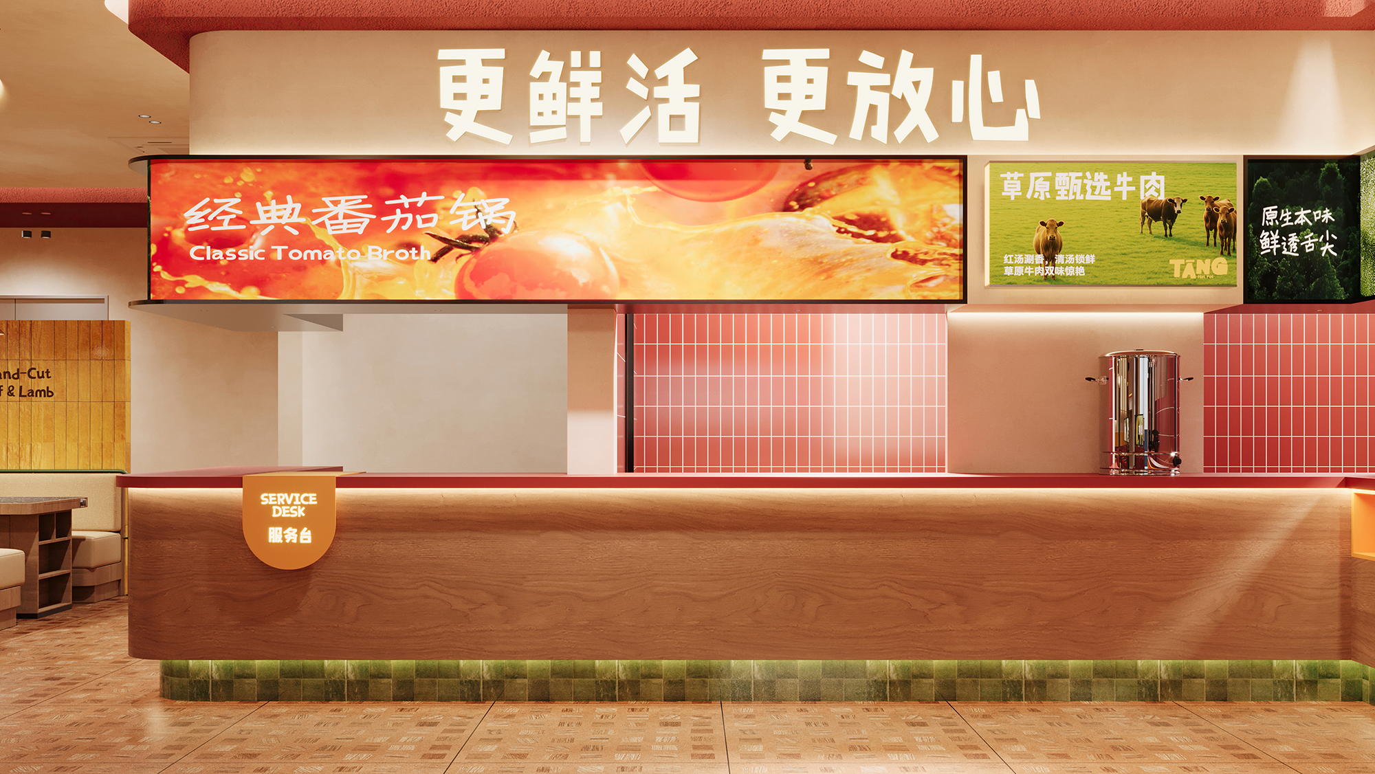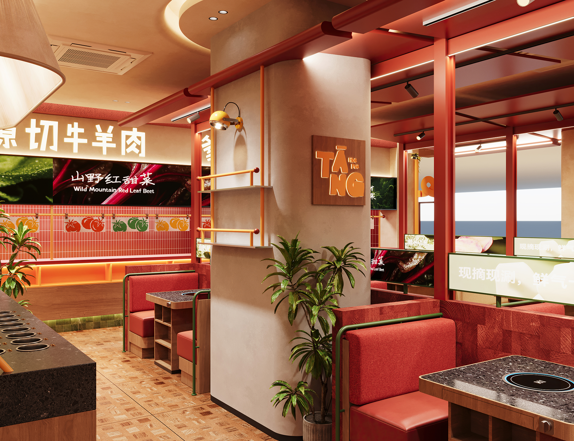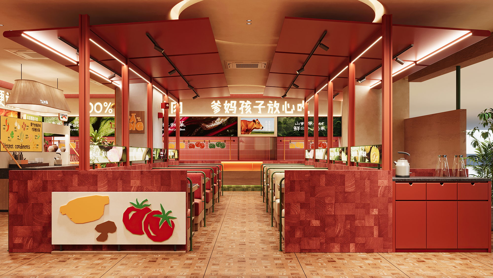 走进汤岛涮,空间被一种沉静的红色包裹。从卡座蔓延至立柱与墙面,利用砖块、织物与金属的不同质感,碰撞交织成一片温暖而沉稳的氛围。视线自然落向明档,备餐的过程清晰可见——食材被现场处理、分切、摆放,一切井然有序,让「鲜活」与「安心」不再是文字。