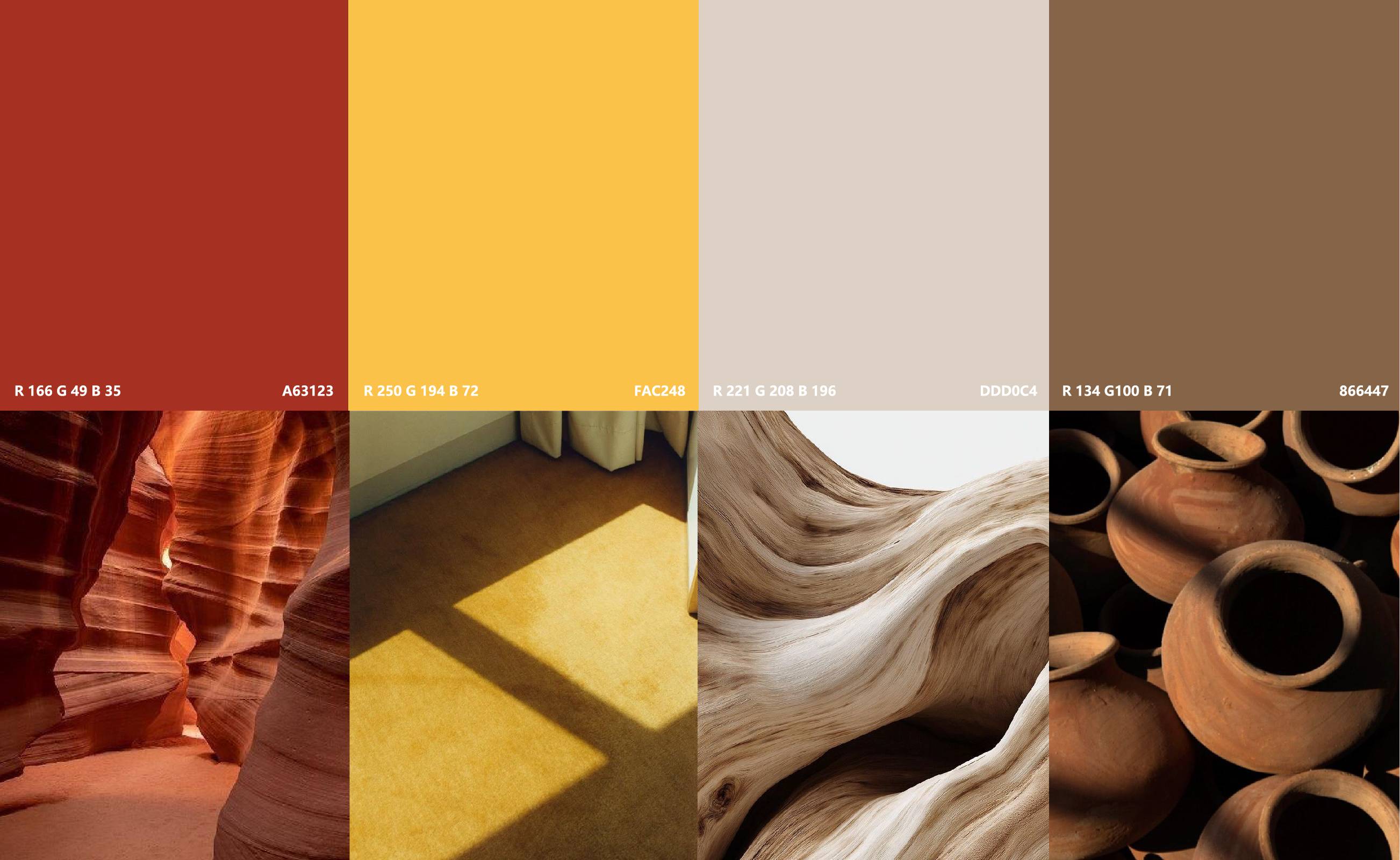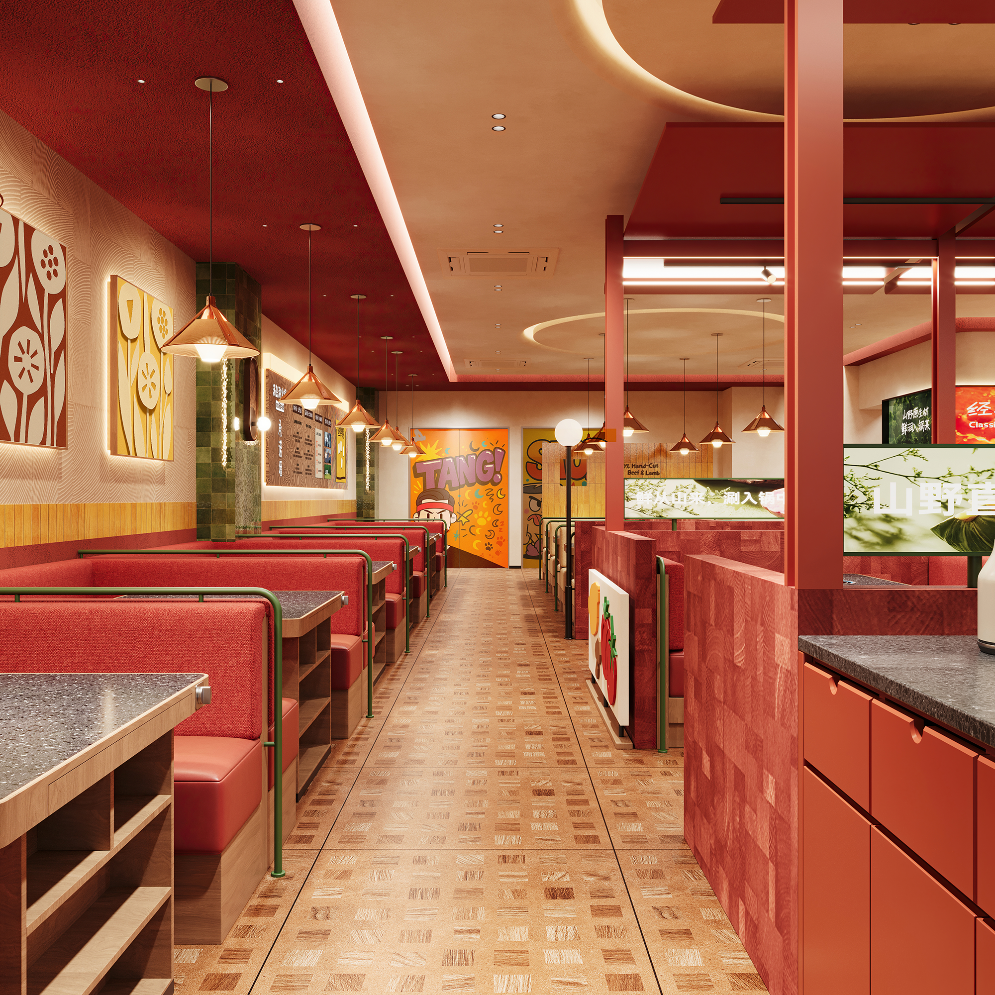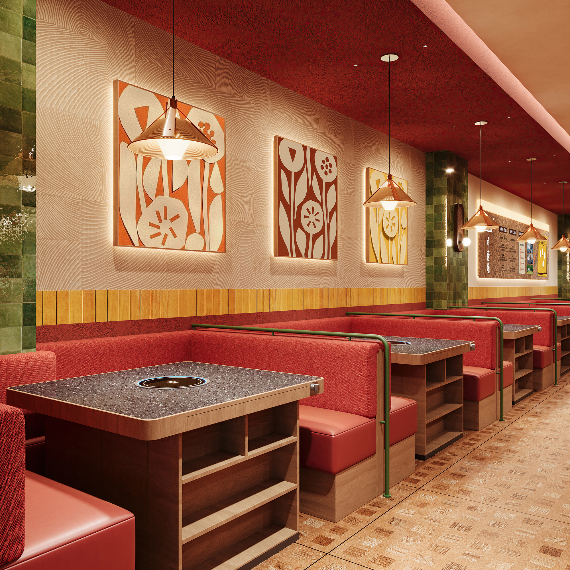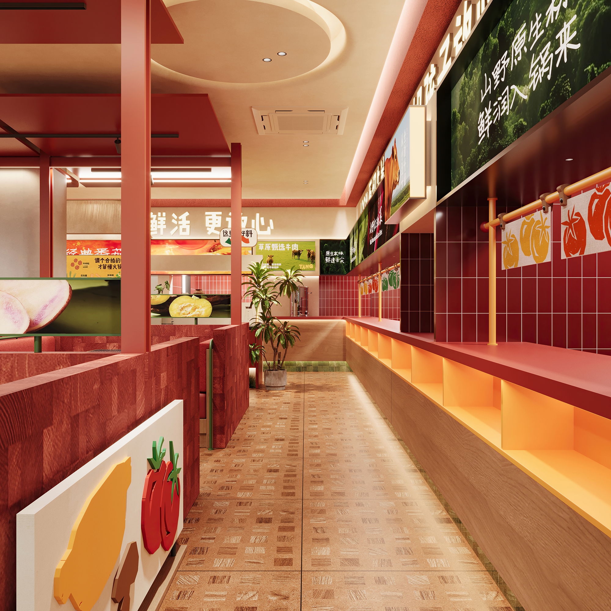 色彩上,红色成为热烈的主题,呼应着火锅的烟火气;米白与浅棕是温润而柔和的,包容着整体氛围,带来舒展的呼吸感。黄色点缀其中,为空间注入明亮活力,与红色碰撞出鲜活生机。
