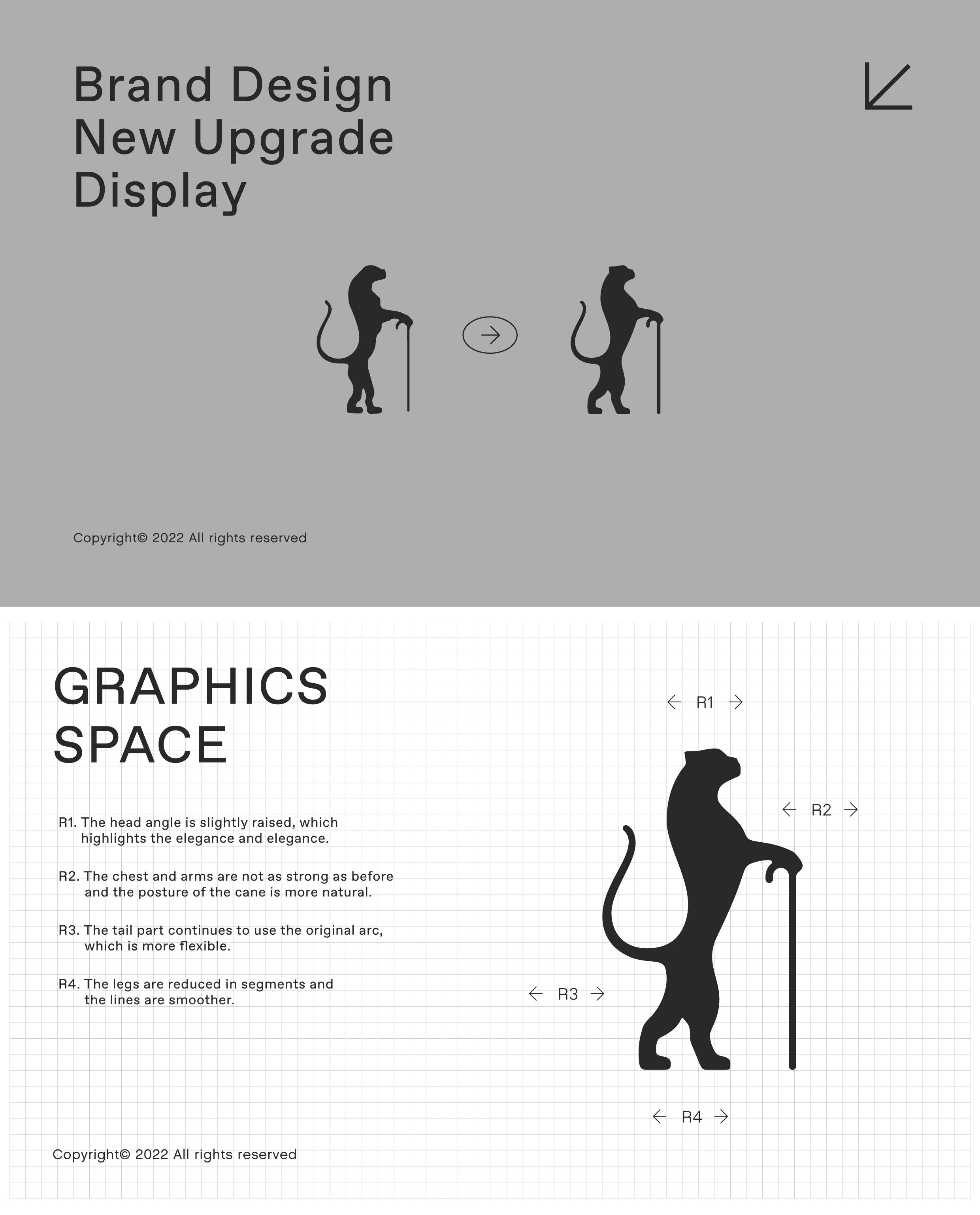 新形象在旧版上进行优化升级,增加下垂的耳朵,调整嘴部结构,头部角度微抬,前胸部分向外调节,曲线更灵动顺滑,从而对比旧形象→形态上:更像豹、更绅士、更耐看;风格上:更年轻、更自信、更现代。