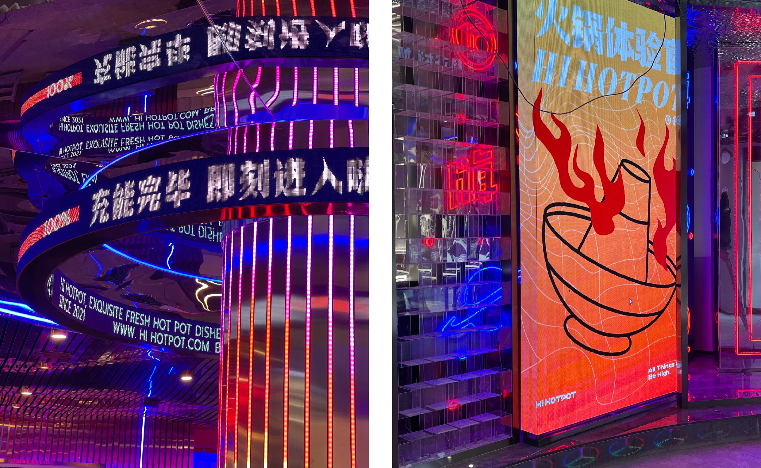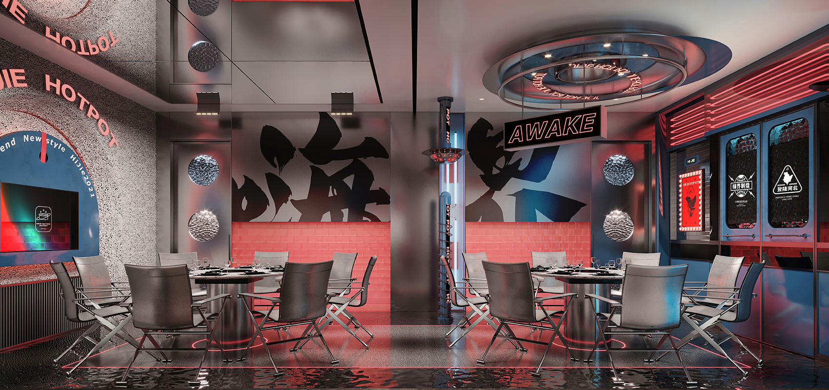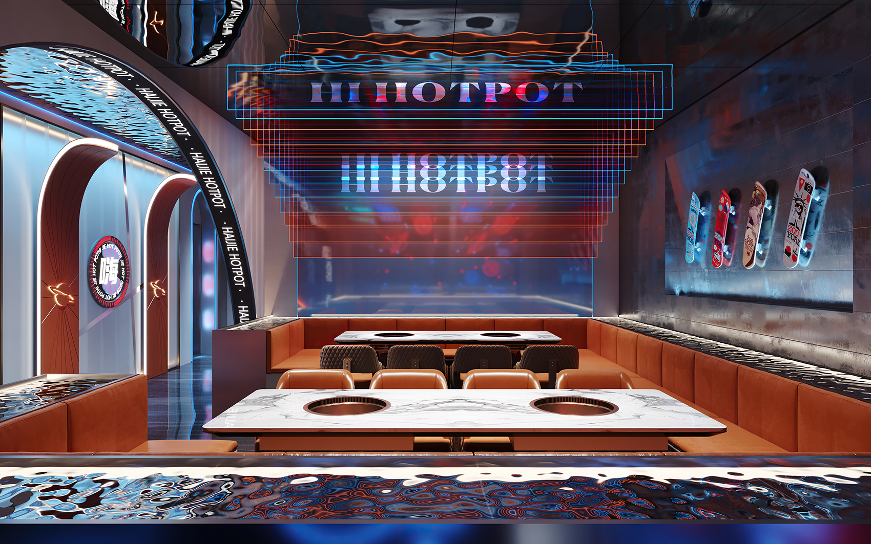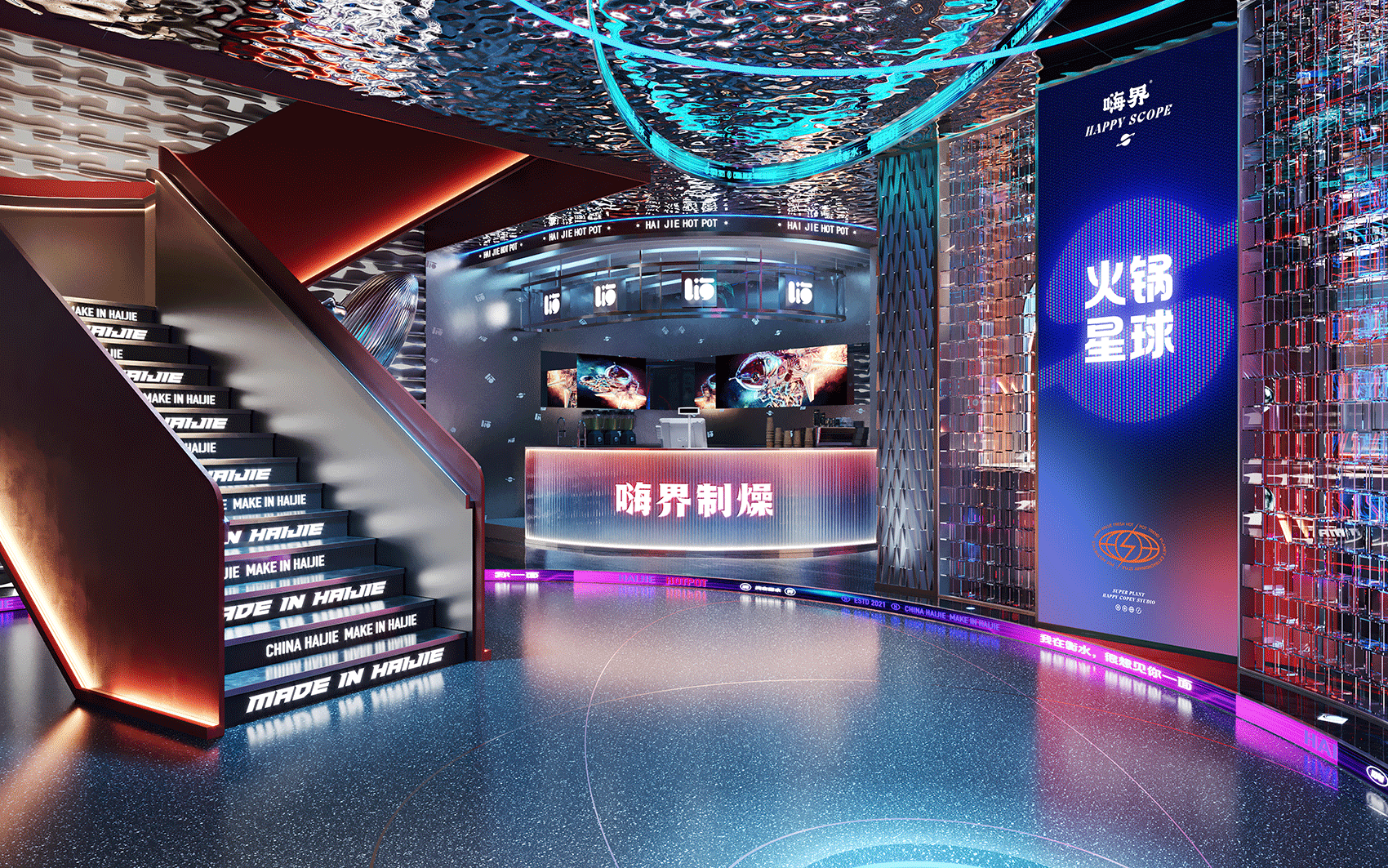 因此,我们将嗨界聚焦于年轻人扎堆的“潮玩”话题+川渝火锅这个超级品类,注入潮流基因,构成嗨界火锅的独特吸睛点;大众美食+差异化标签,时尚设计+未来感氛围,打造不一样的“潮食空间”。