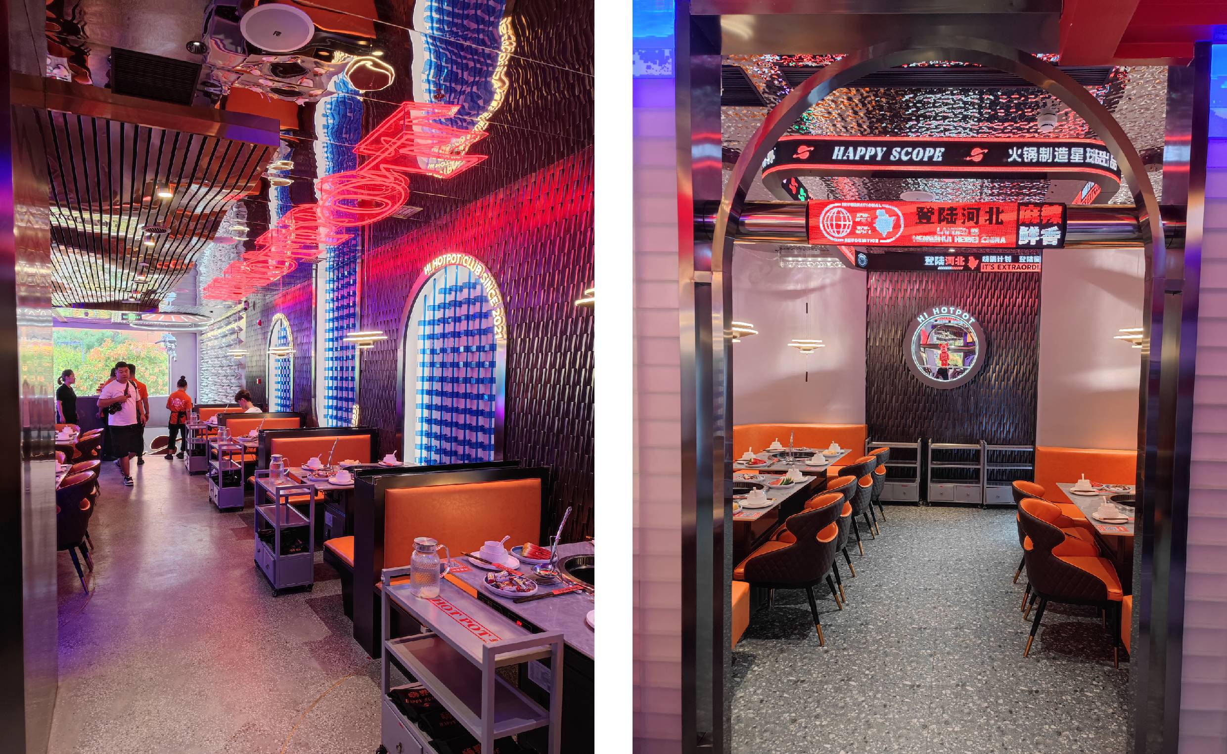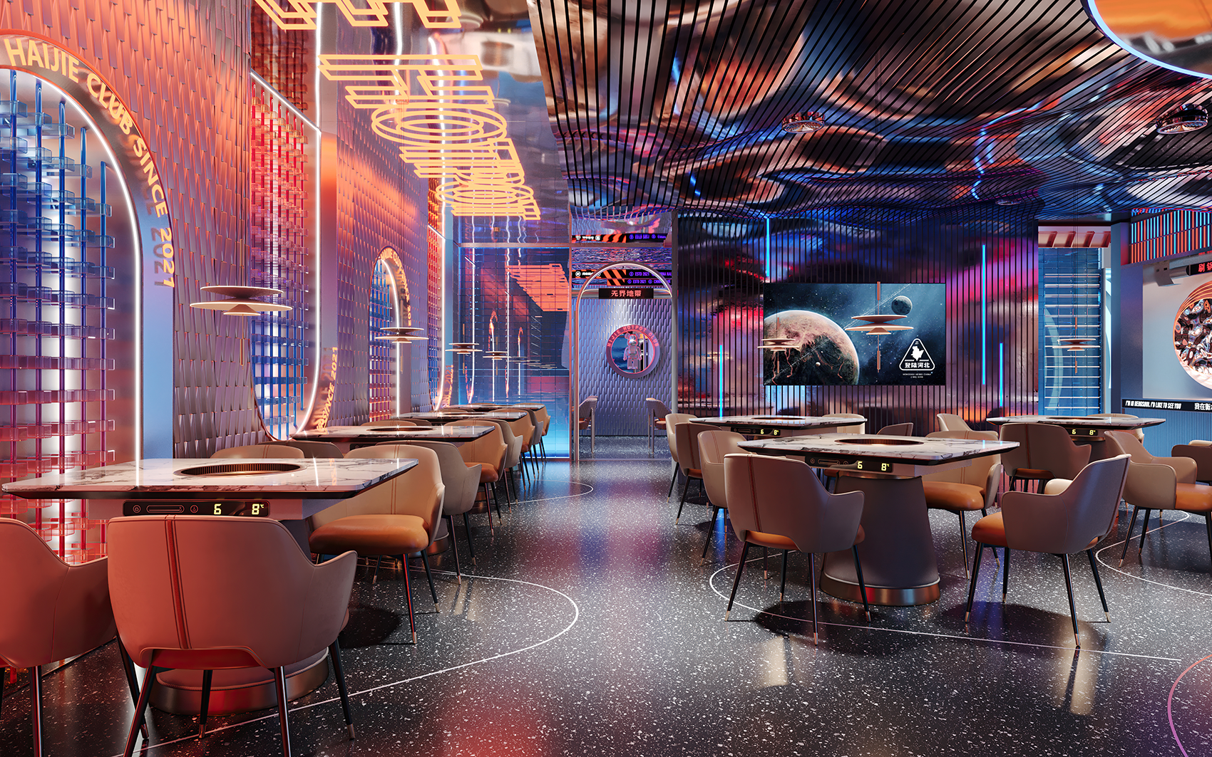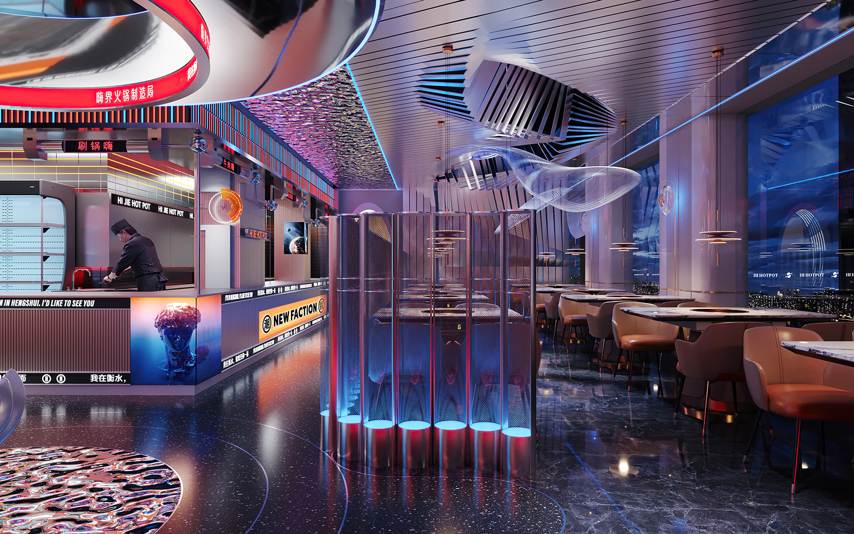 因此,我们将嗨界聚焦于年轻人扎堆的“潮玩”话题+川渝火锅这个超级品类,注入潮流基因,构成嗨界火锅的独特吸睛点;大众美食+差异化标签,时尚设计+未来感氛围,打造不一样的“潮食空间”。