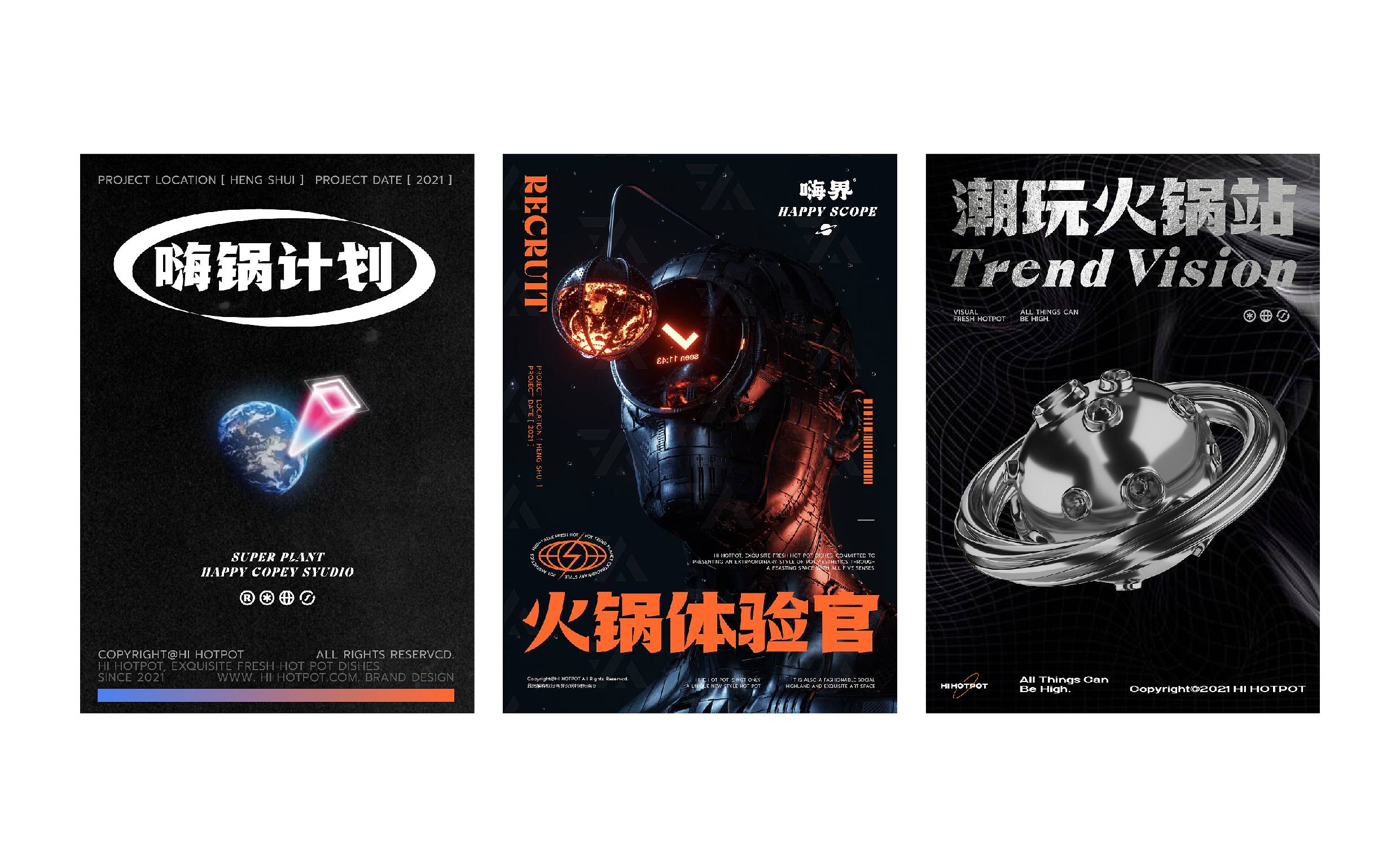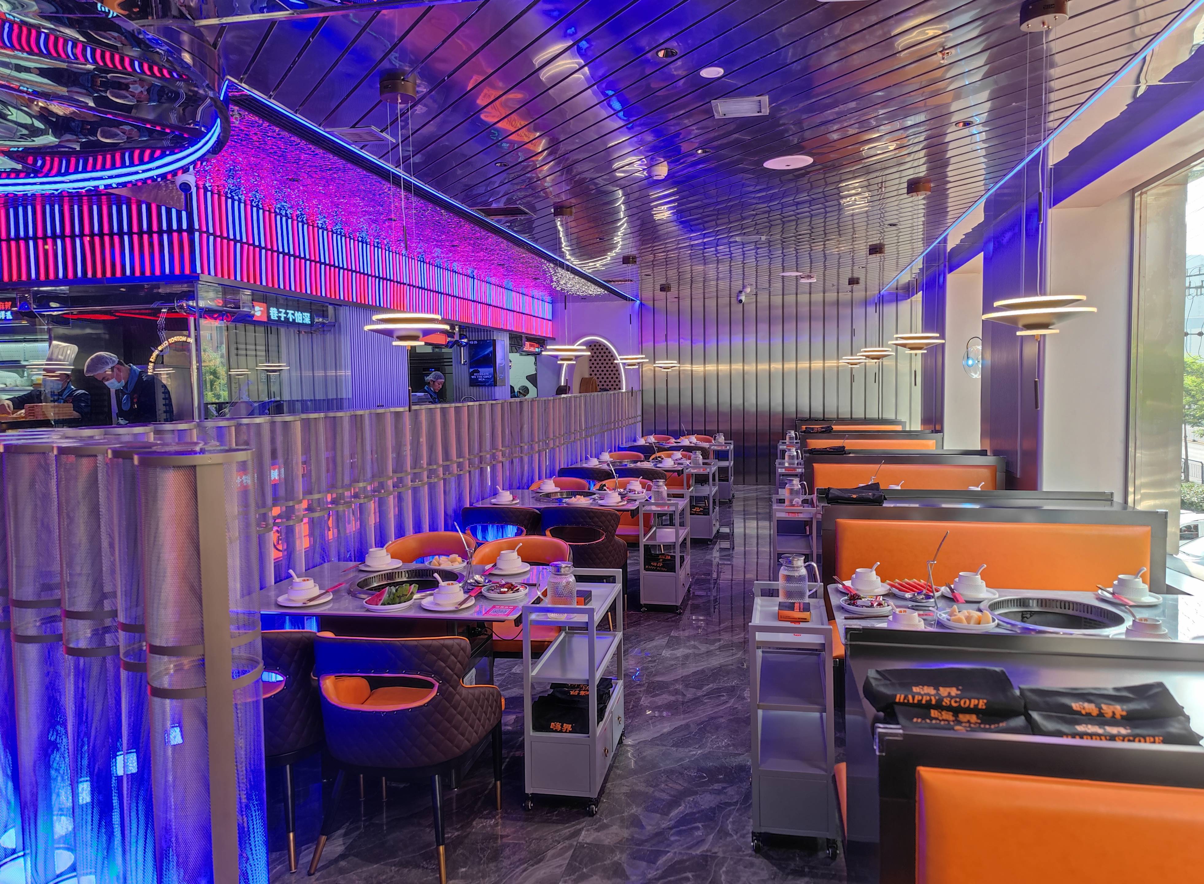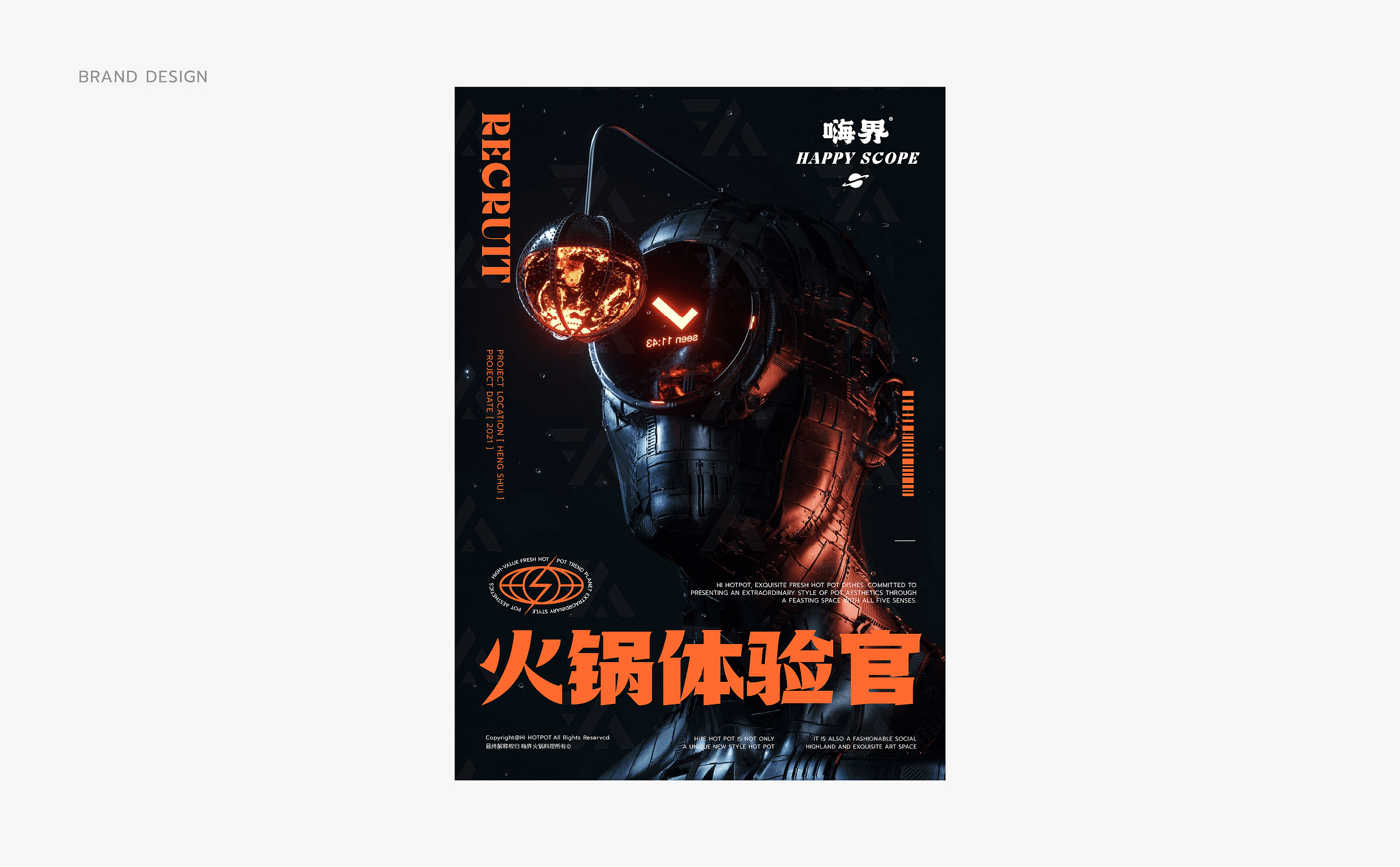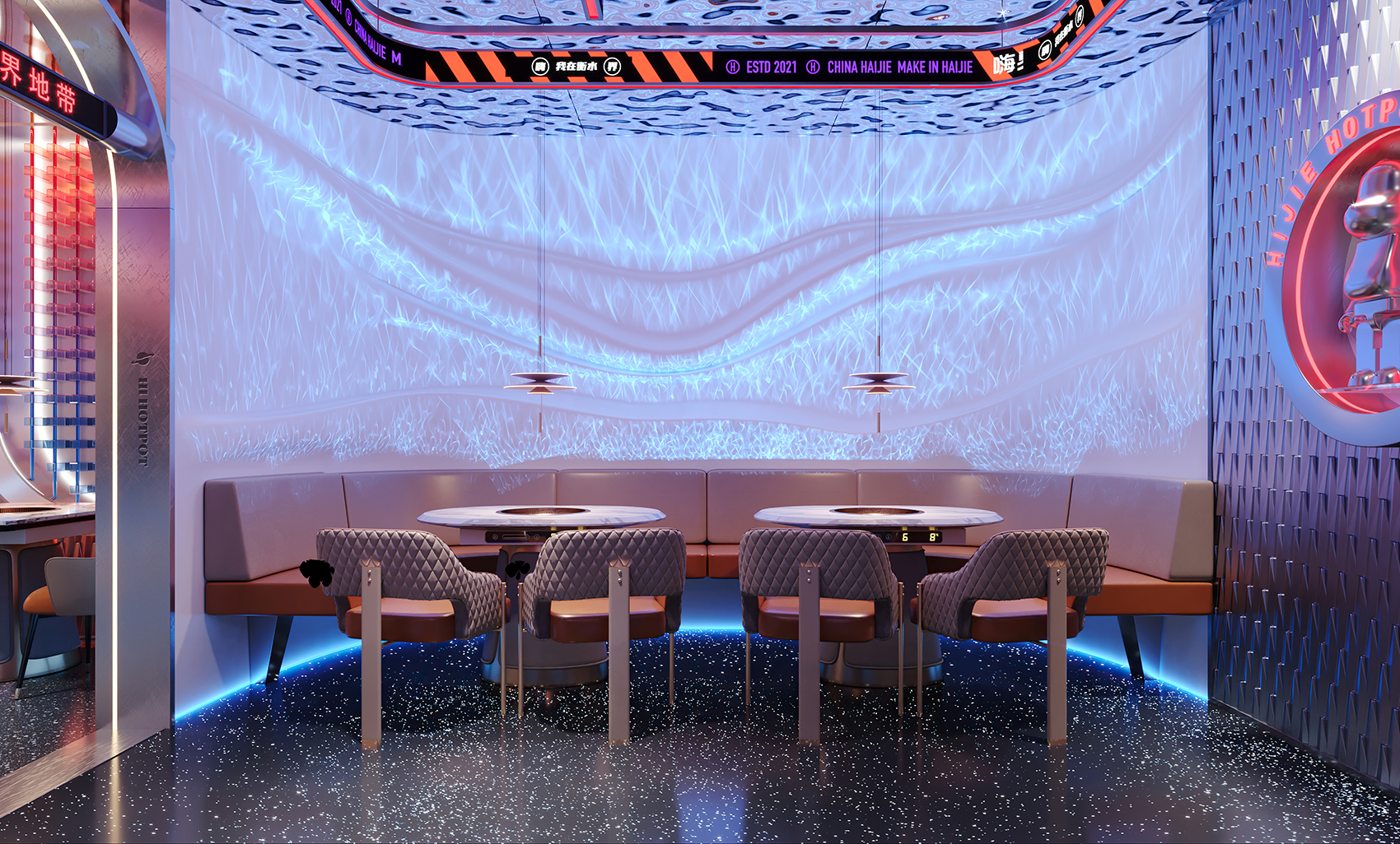 因此,我们将嗨界聚焦于年轻人扎堆的“潮玩”话题+川渝火锅这个超级品类,注入潮流基因,构成嗨界火锅的独特吸睛点;大众美食+差异化标签,时尚设计+未来感氛围,打造不一样的“潮食空间”。