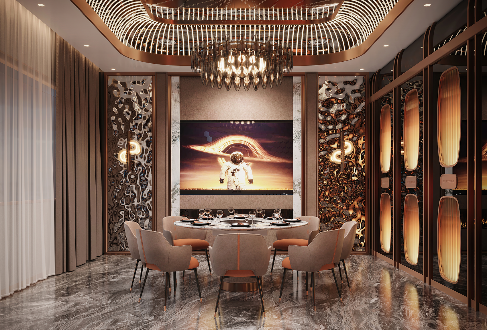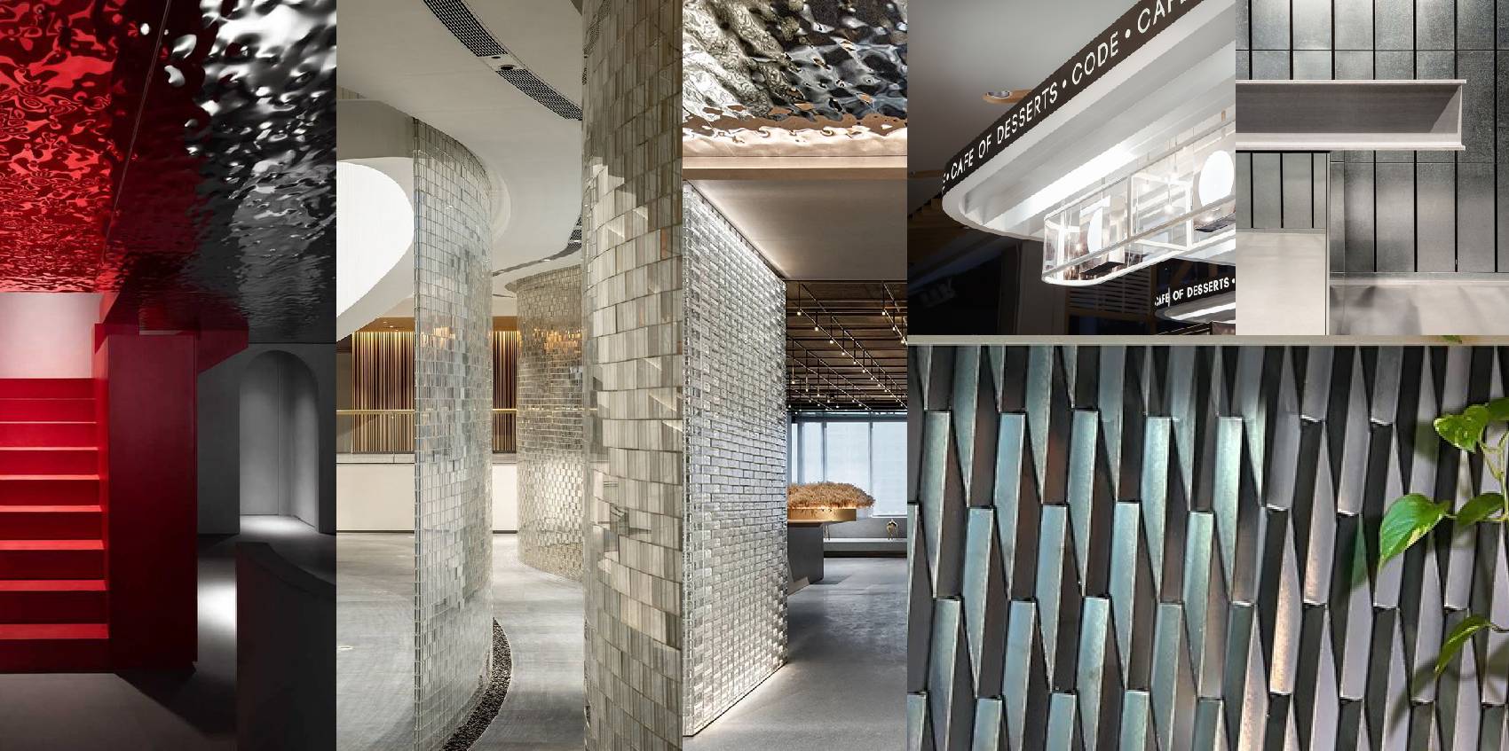 我们希望整个空间能够呈现精致硬核的未来风,带给人视觉上的冲击力,所以在材质的选择上,我们以镜面波浪板不锈钢、未来金属砖等硬质材质为主,同时利用通透的玻璃砖、亚克力等模糊界限,营造空间上的交互感,增强用餐者的沉浸感。