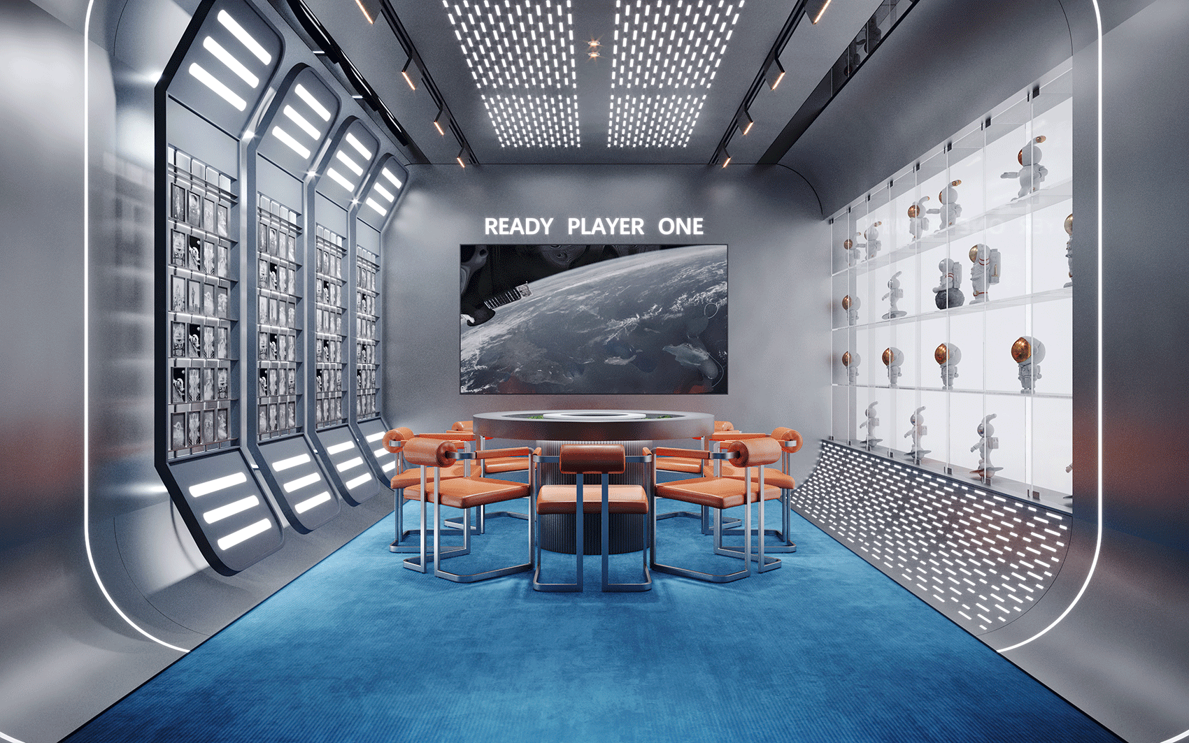 整体空间以钴蓝色、银灰色为主色调,钴蓝色代表着静谧的海洋,银灰色代表深邃的宇宙,并加入强烈对比的橙色与红色,冷暖色的运用,完成明暗的搭配,跨时间、跨区域的细节设计,配合层次丰富的海域联想,不断创造新的时空,传递未来主义与潮流。