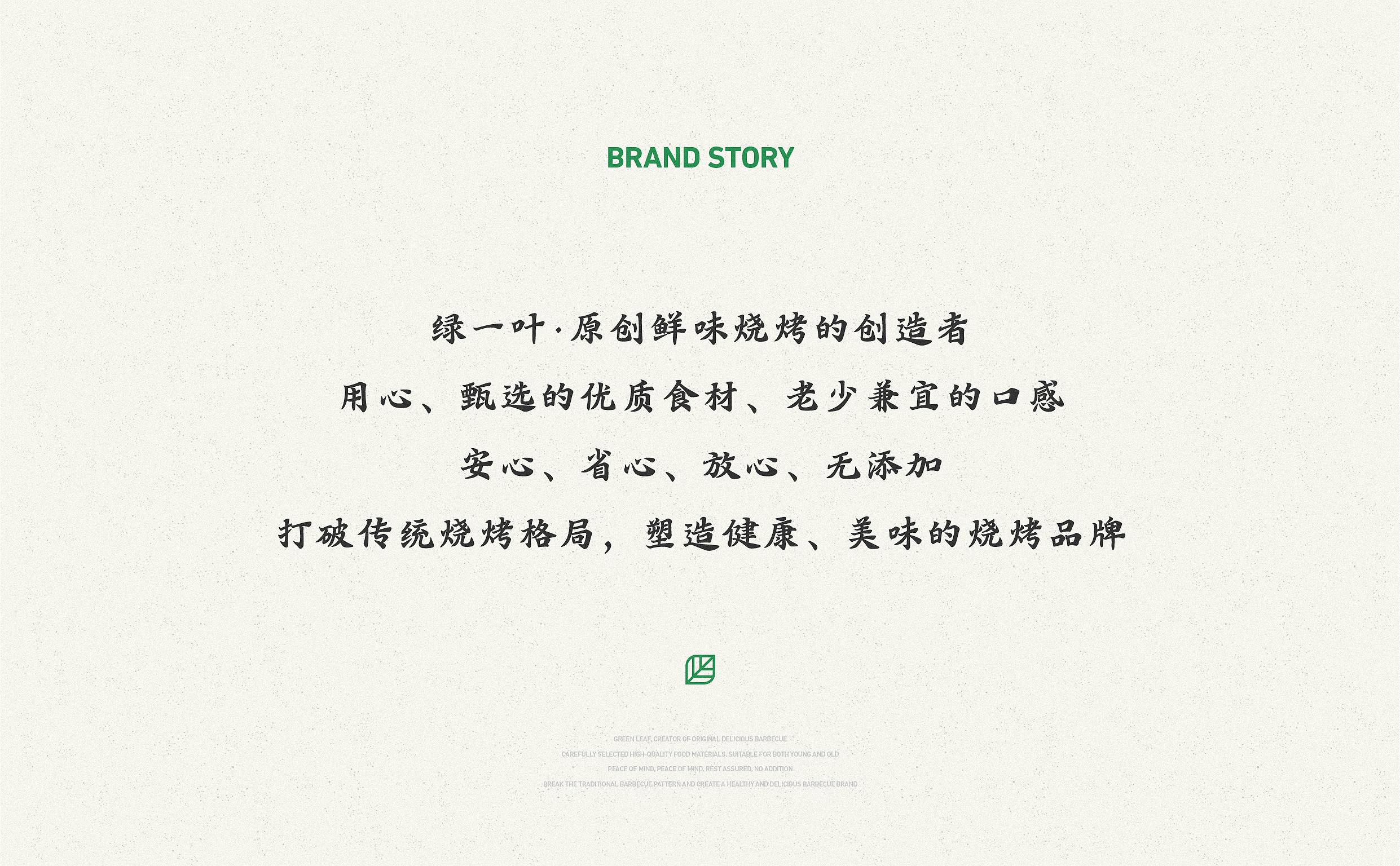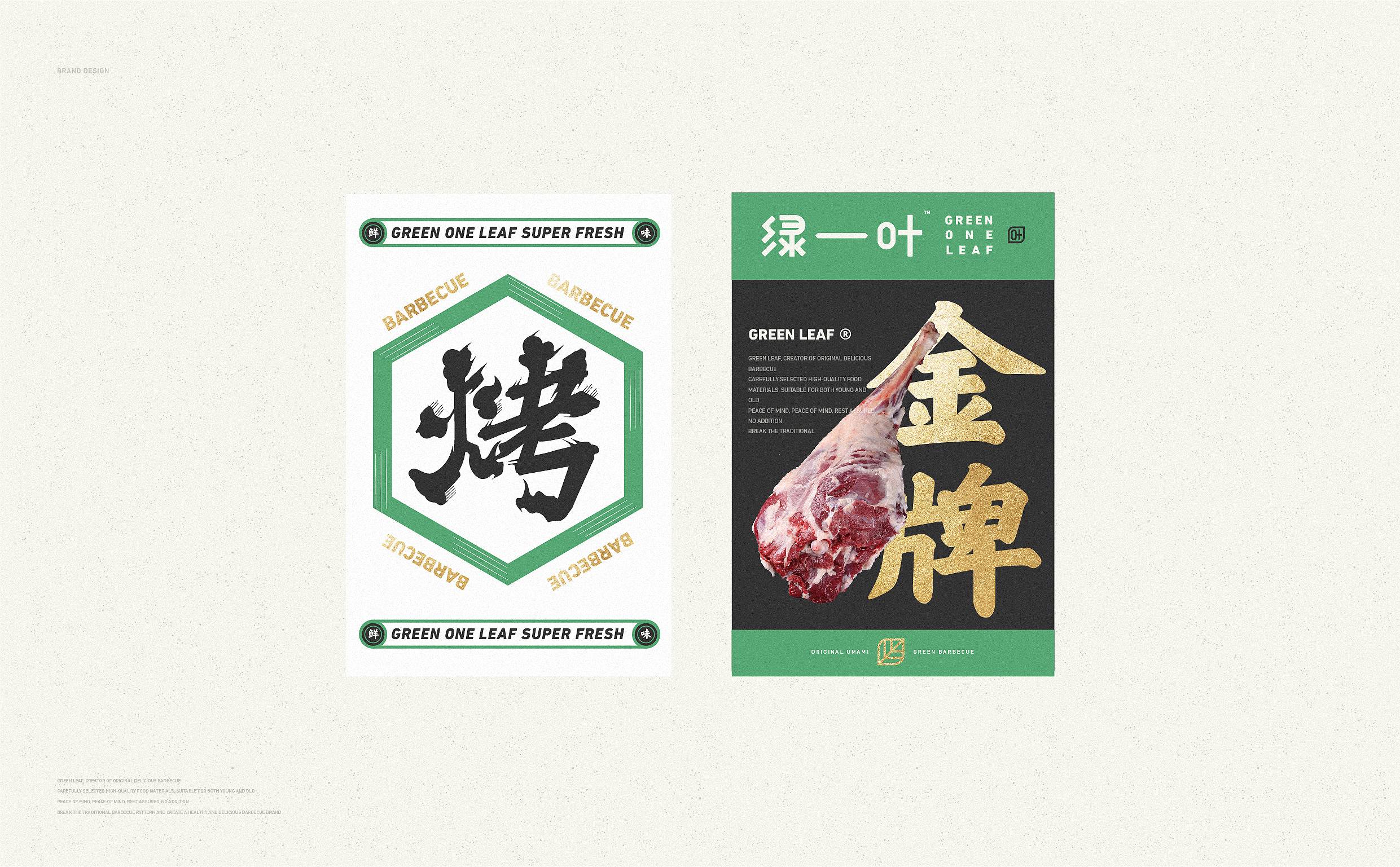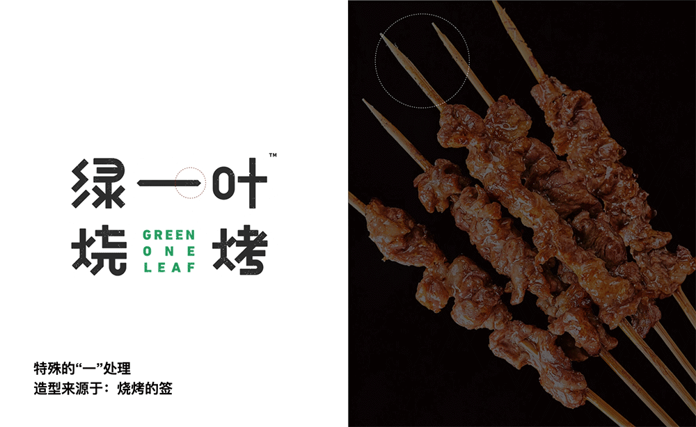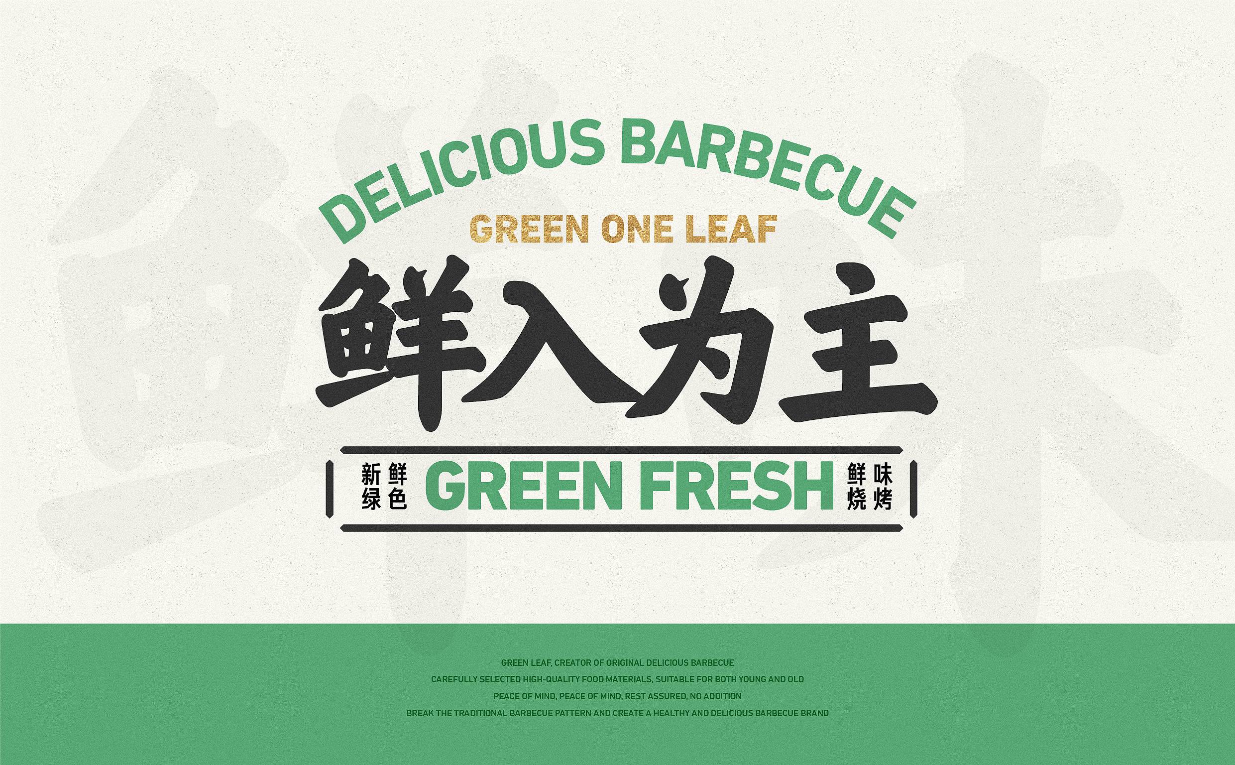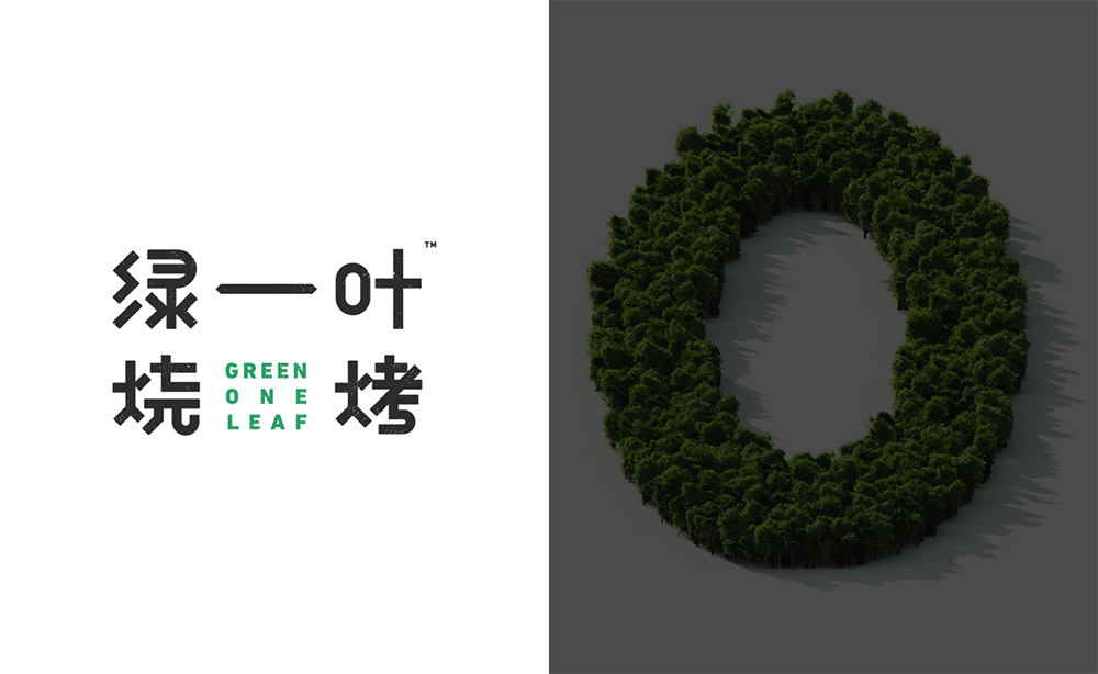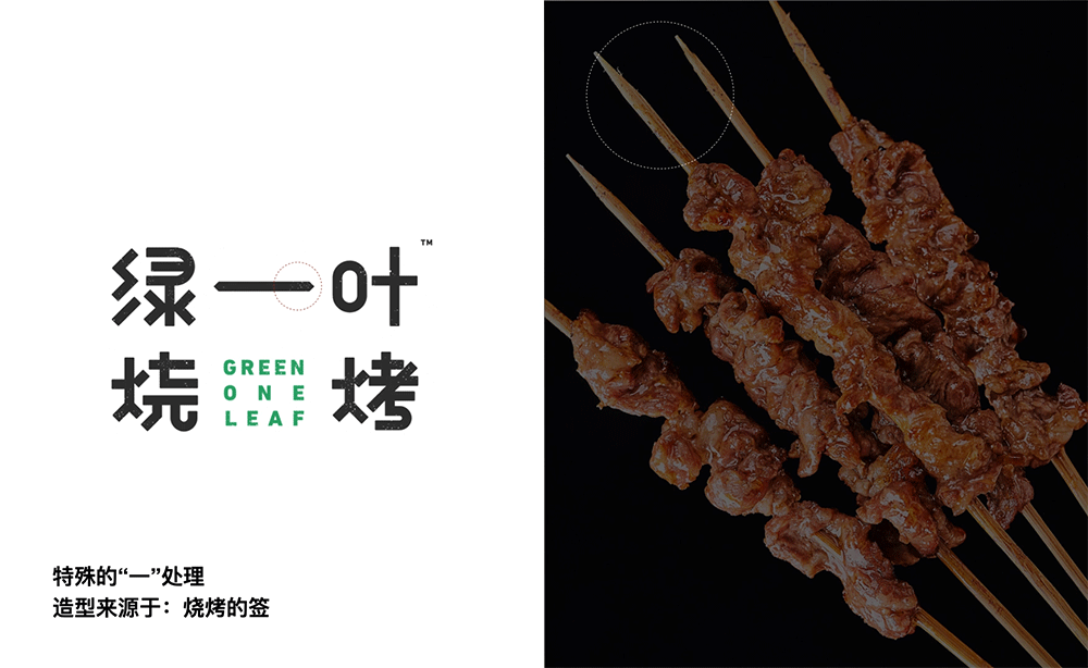 品牌字体设计上,采用律动、整齐的笔画处理,呈现轻盈活力感。同时,将字体“一”、“叶”进行特殊处理:“一”取烧烤签为造型,以打造品类感;“叶”由“0”与“+”巧妙组合而成,代表绿一叶、健康零添加。引入活字印刷、印章概念作为排列方式,赋予厚重感,彰显绿一叶的安全、健康、匠心。
