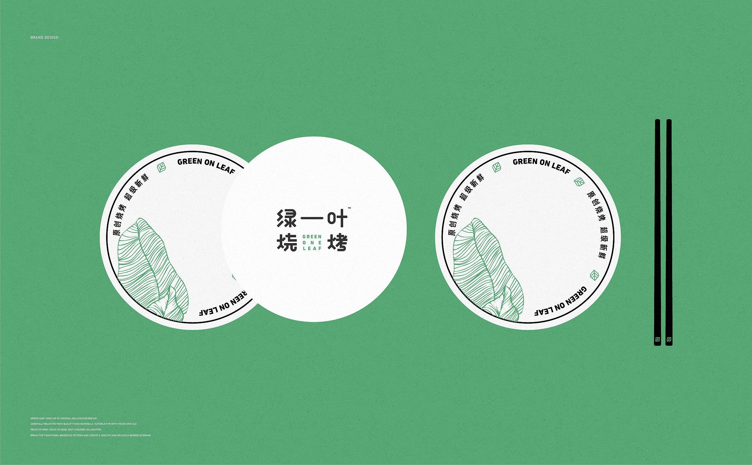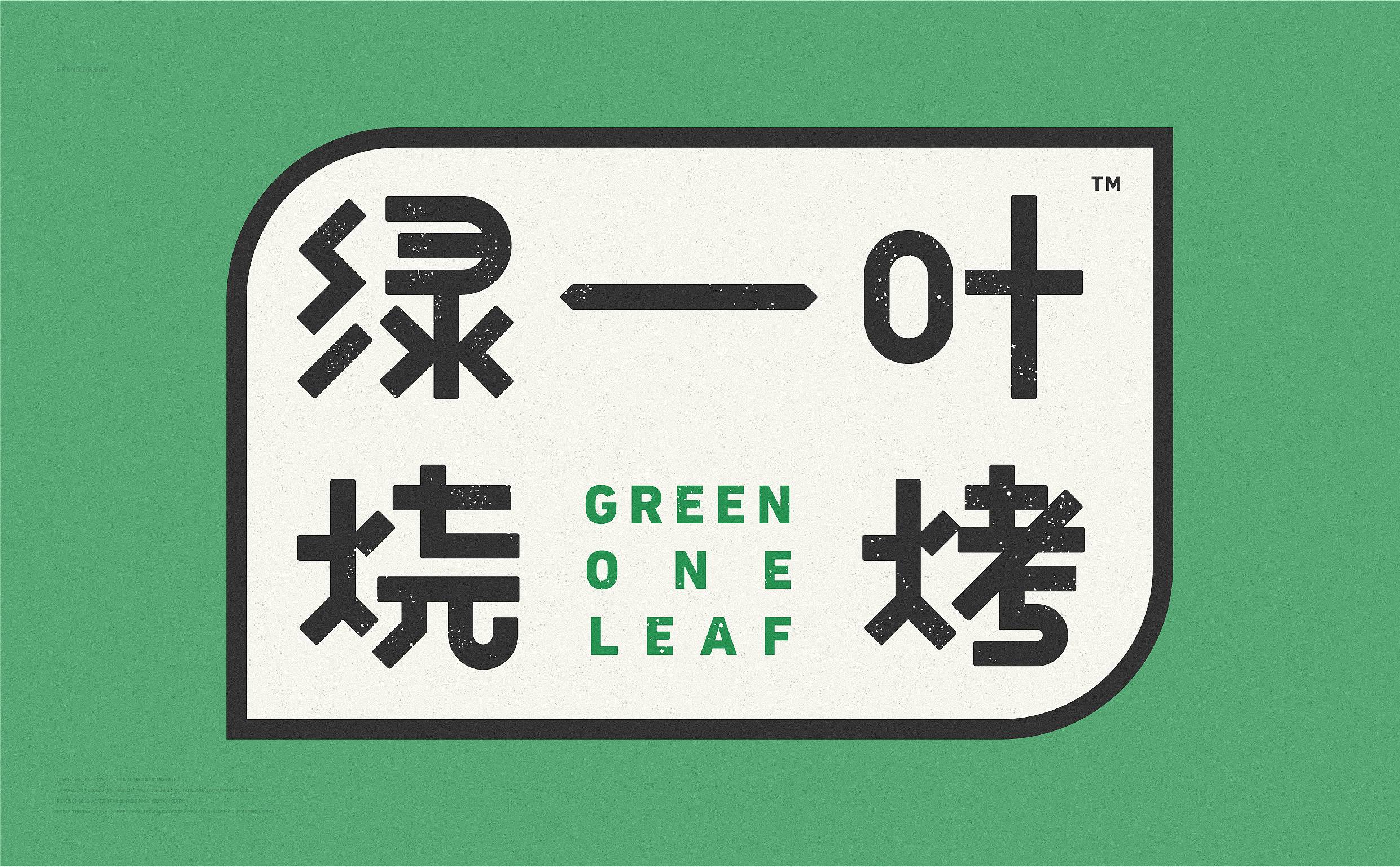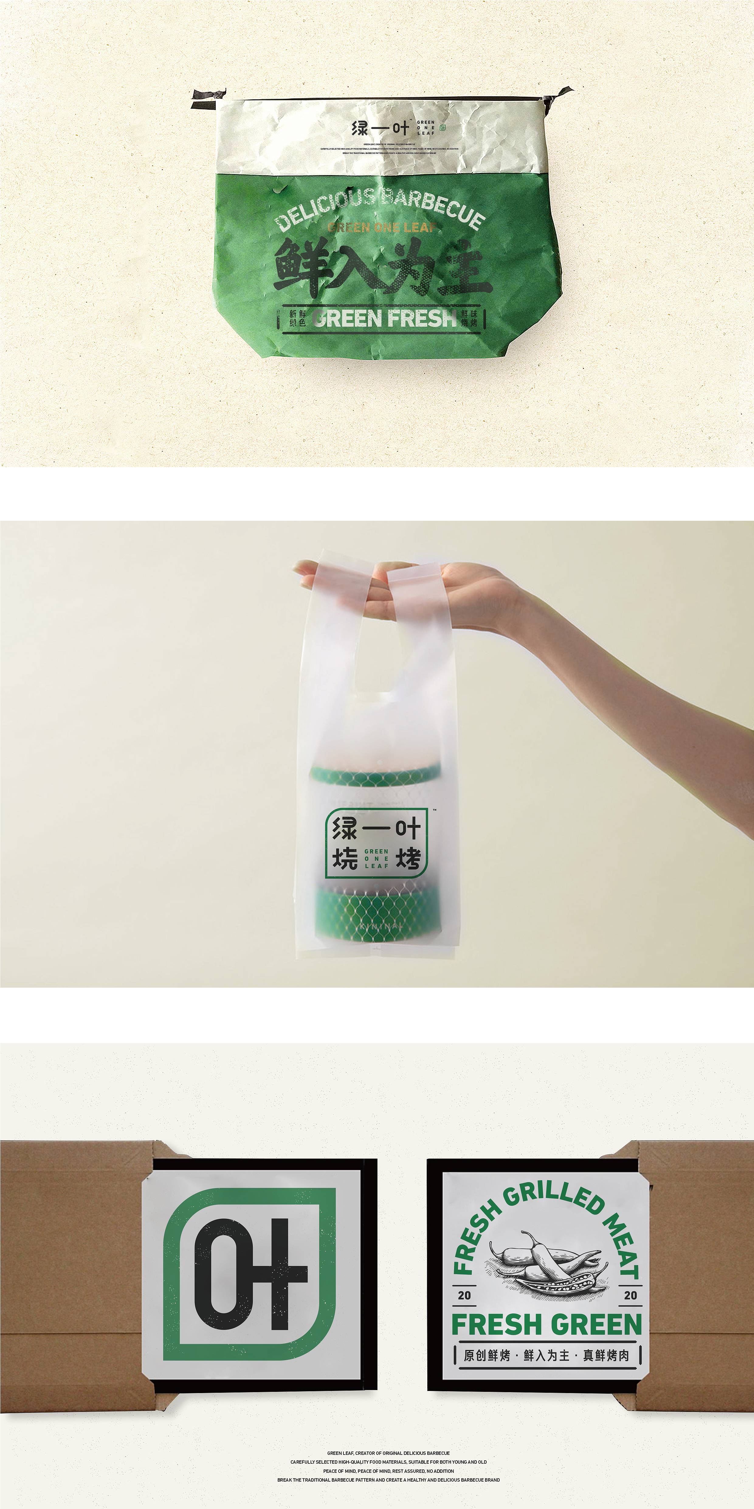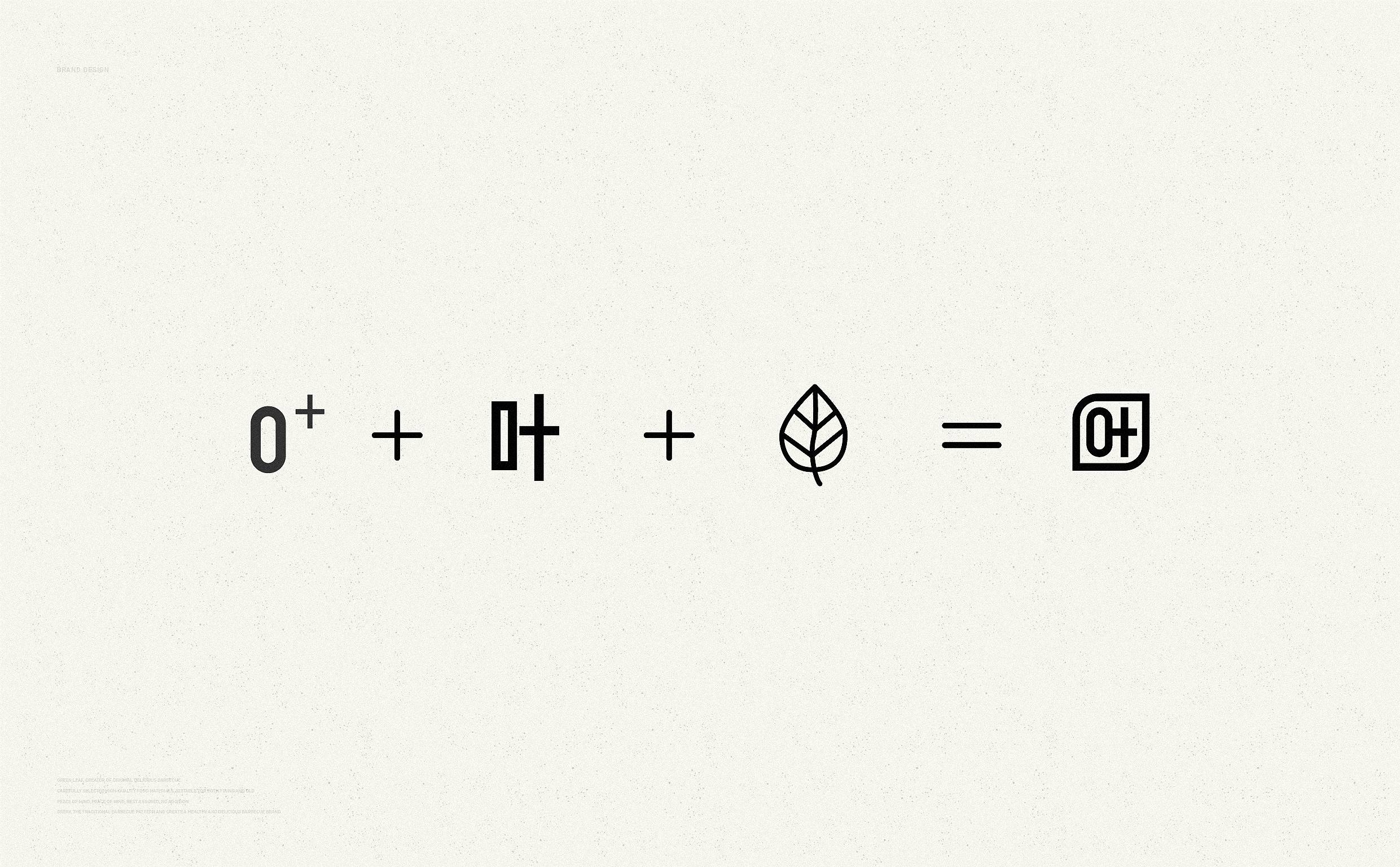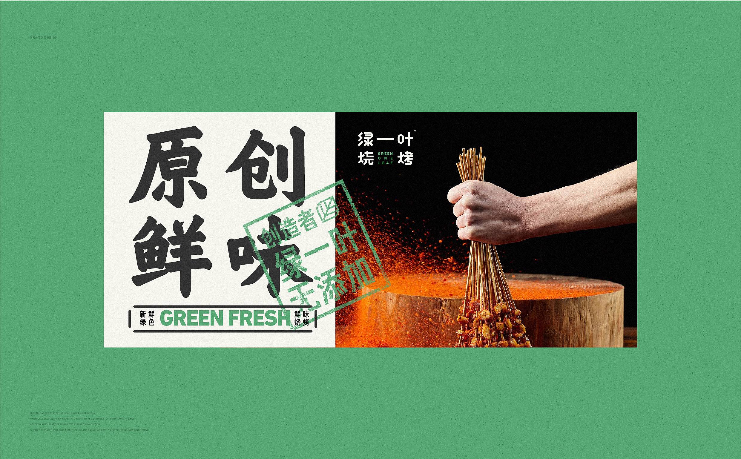 品牌字体设计上,采用律动、整齐的笔画处理,呈现轻盈活力感。同时,将字体“一”、“叶”进行特殊处理:“一”取烧烤签为造型,以打造品类感;“叶”由“0”与“+”巧妙组合而成,代表绿一叶、健康零添加。引入活字印刷、印章概念作为排列方式,赋予厚重感,彰显绿一叶的安全、健康、匠心。