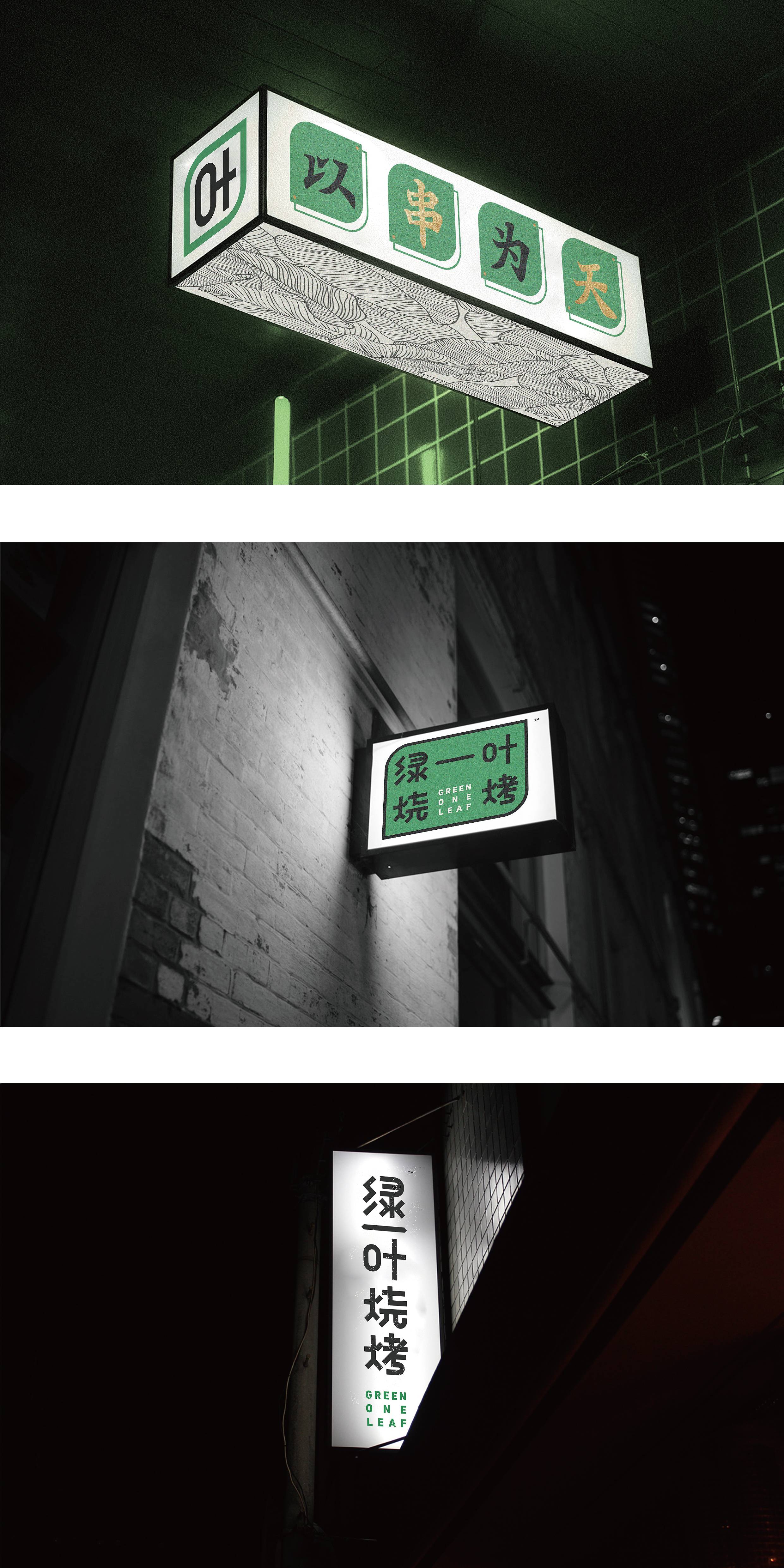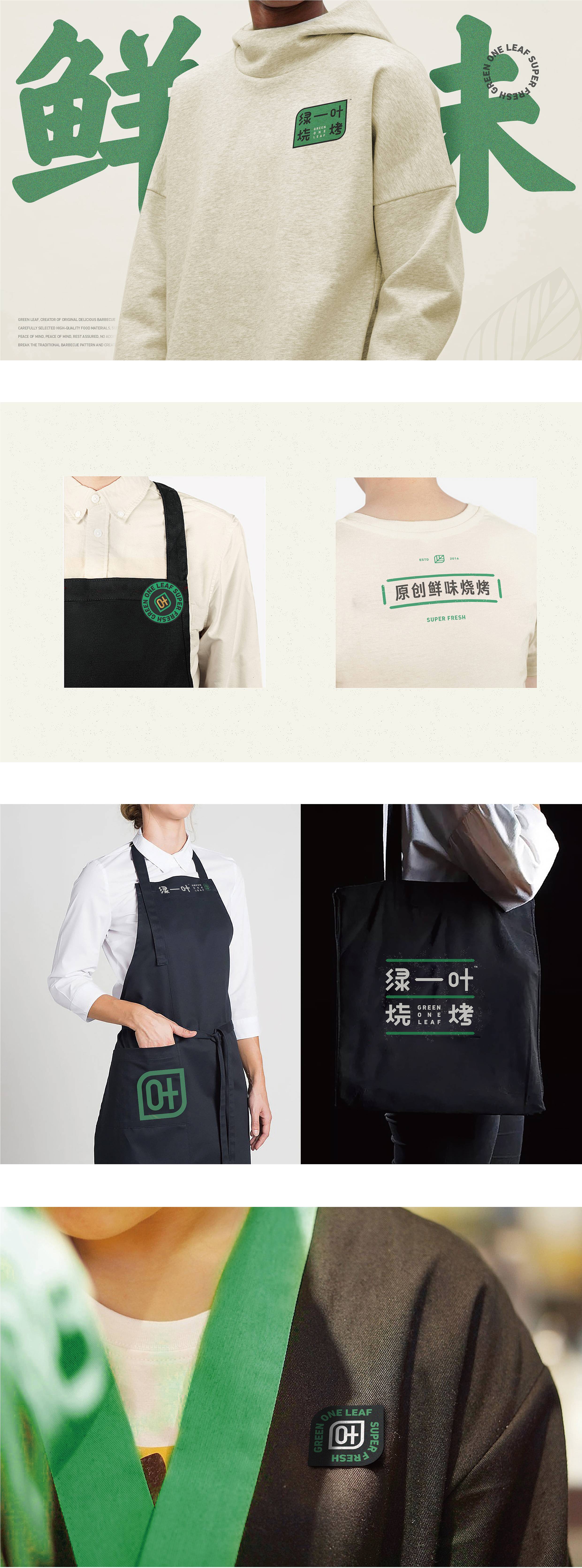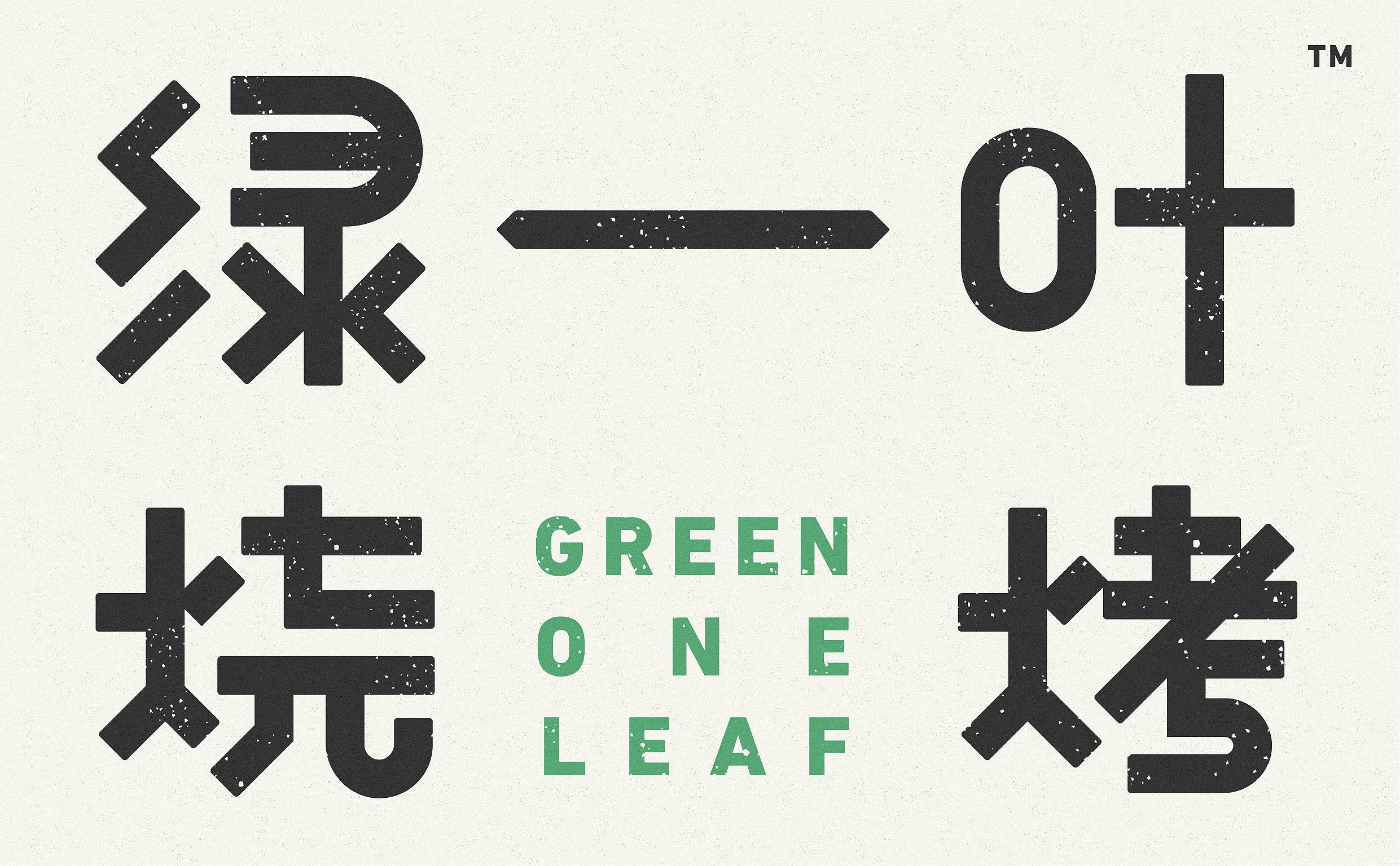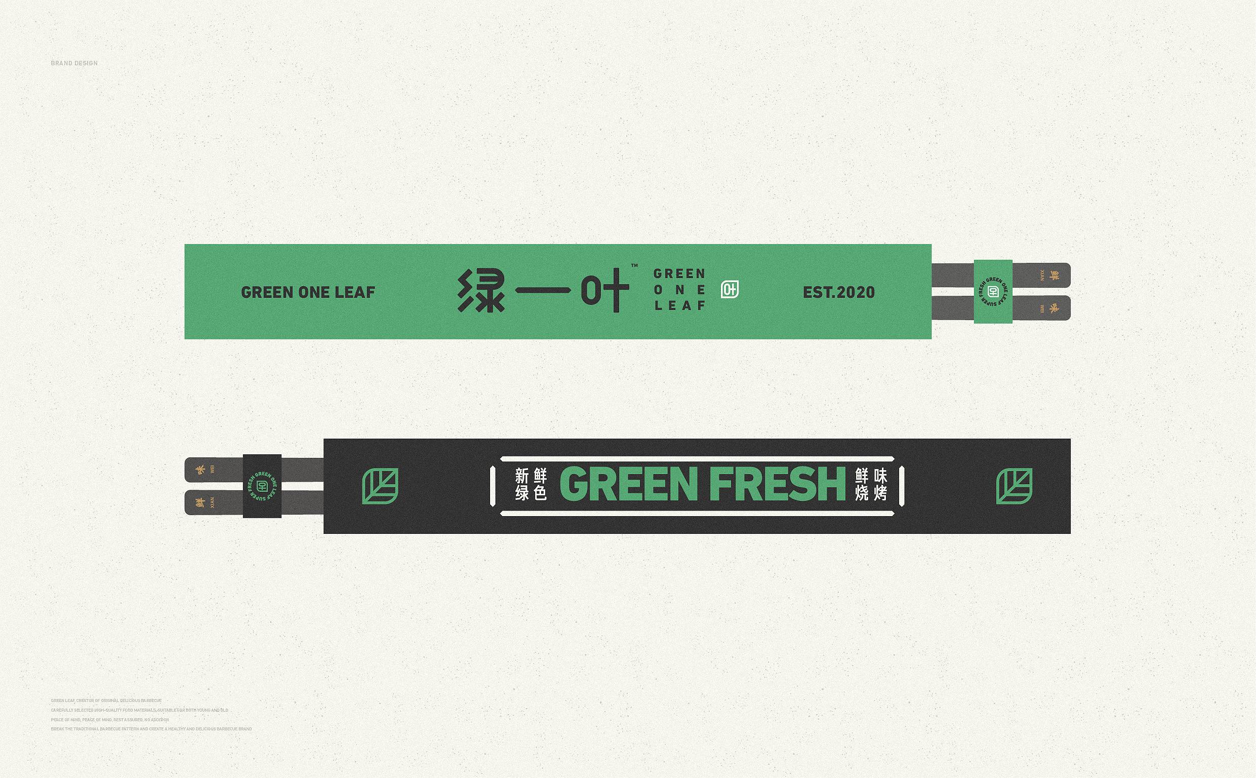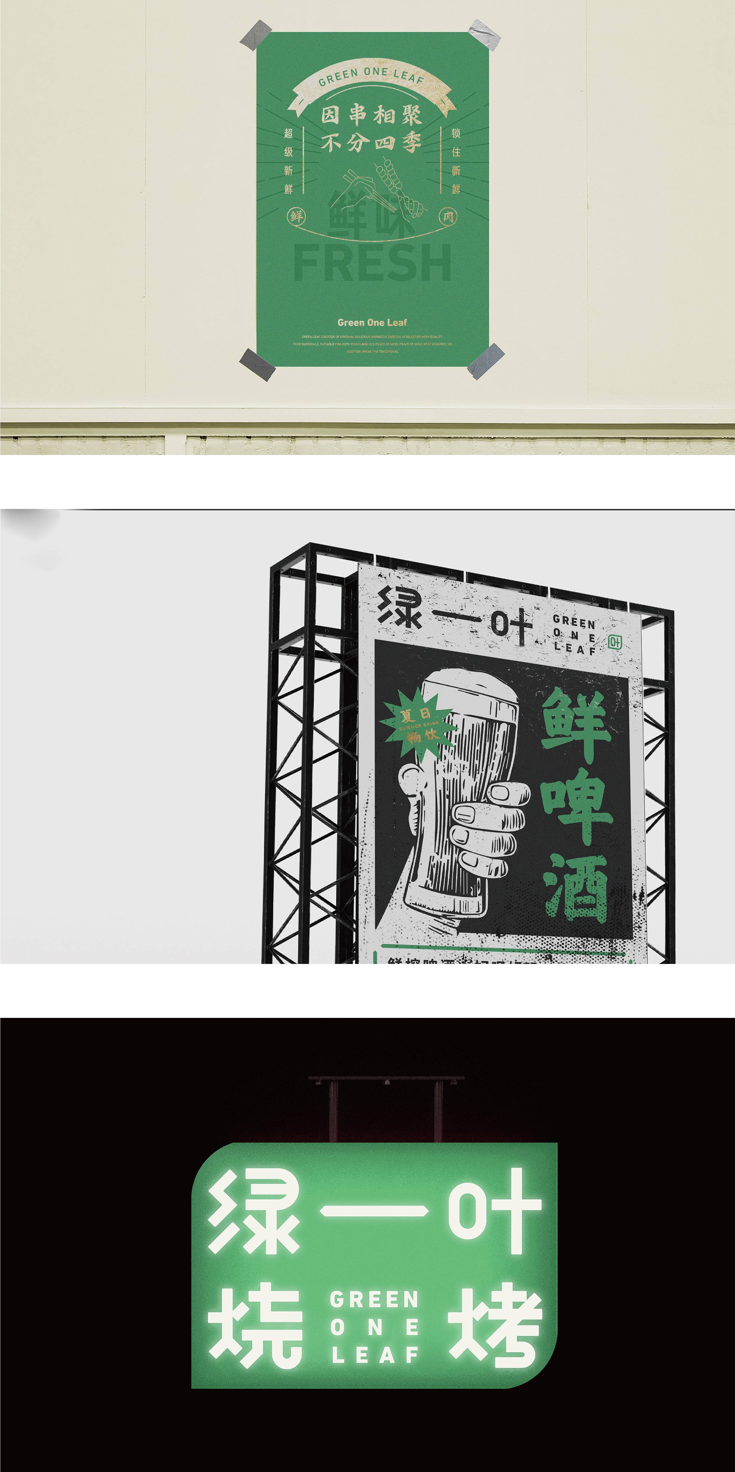 品牌字体设计上,采用律动、整齐的笔画处理,呈现轻盈活力感。同时,将字体“一”、“叶”进行特殊处理:“一”取烧烤签为造型,以打造品类感;“叶”由“0”与“+”巧妙组合而成,代表绿一叶、健康零添加。引入活字印刷、印章概念作为排列方式,赋予厚重感,彰显绿一叶的安全、健康、匠心。