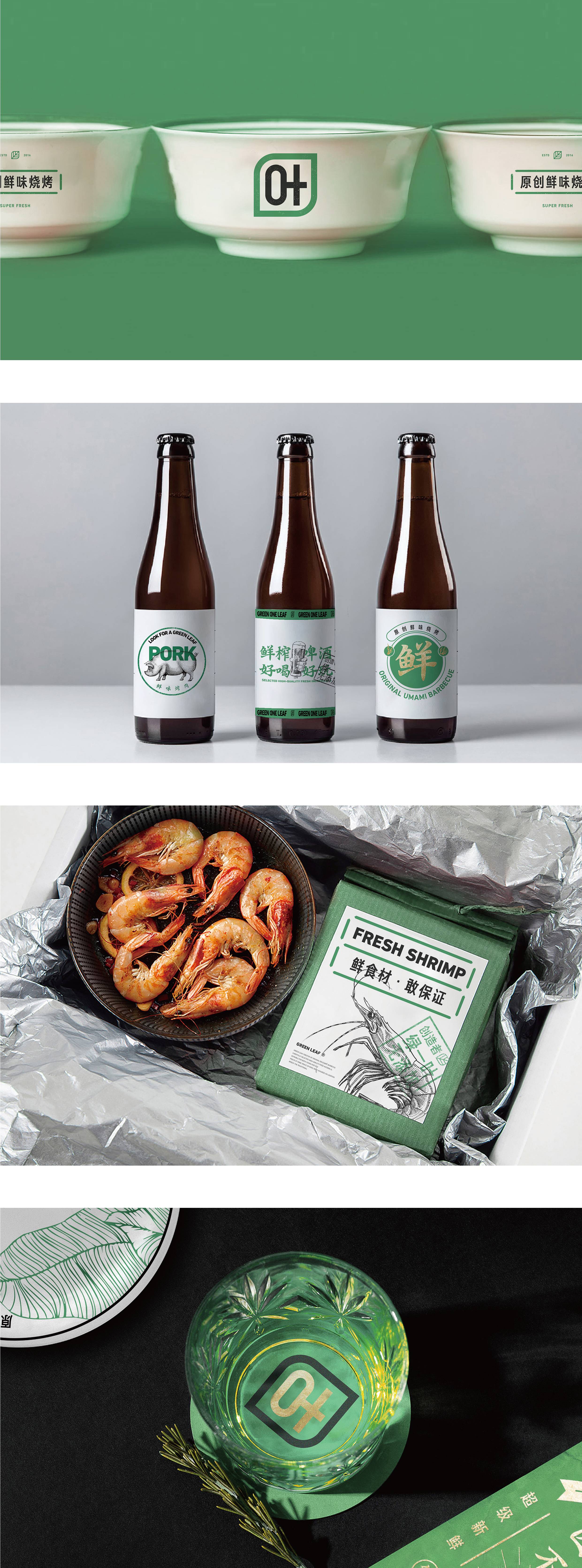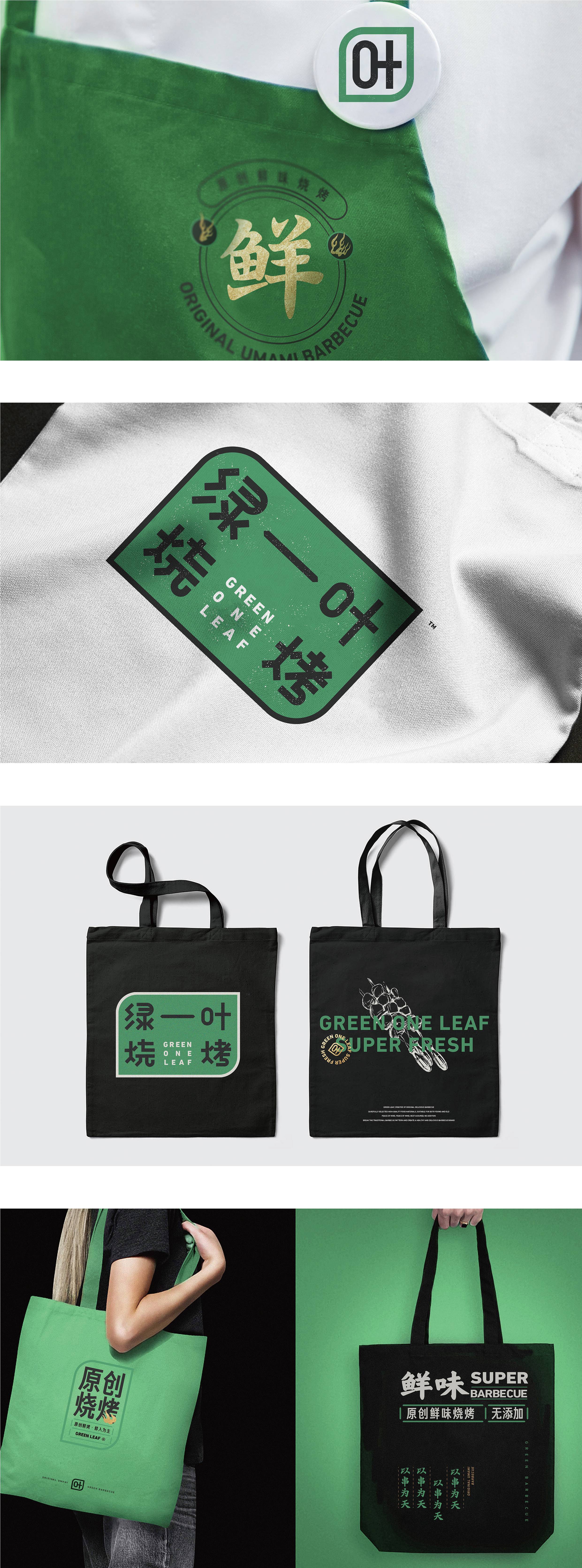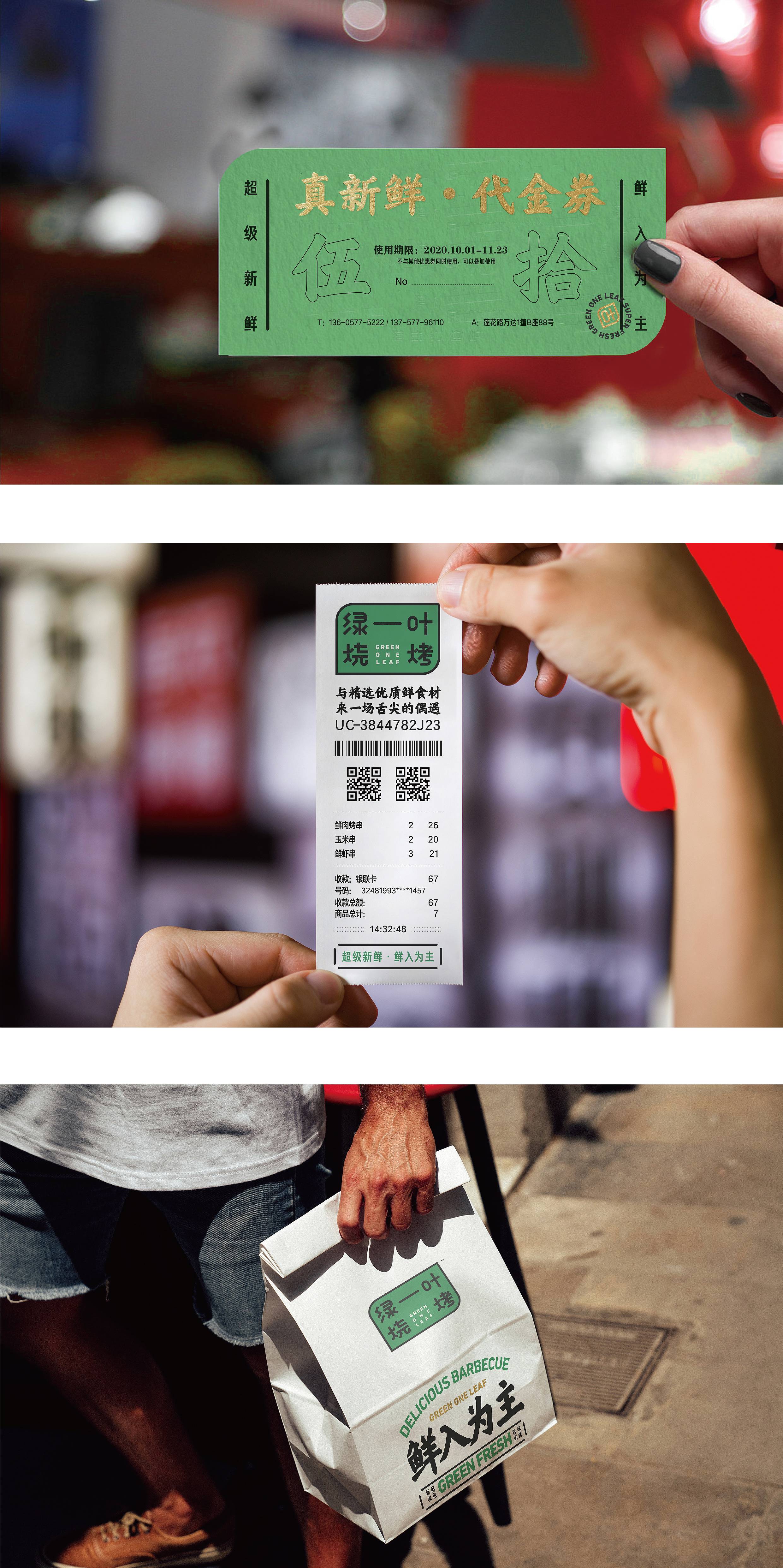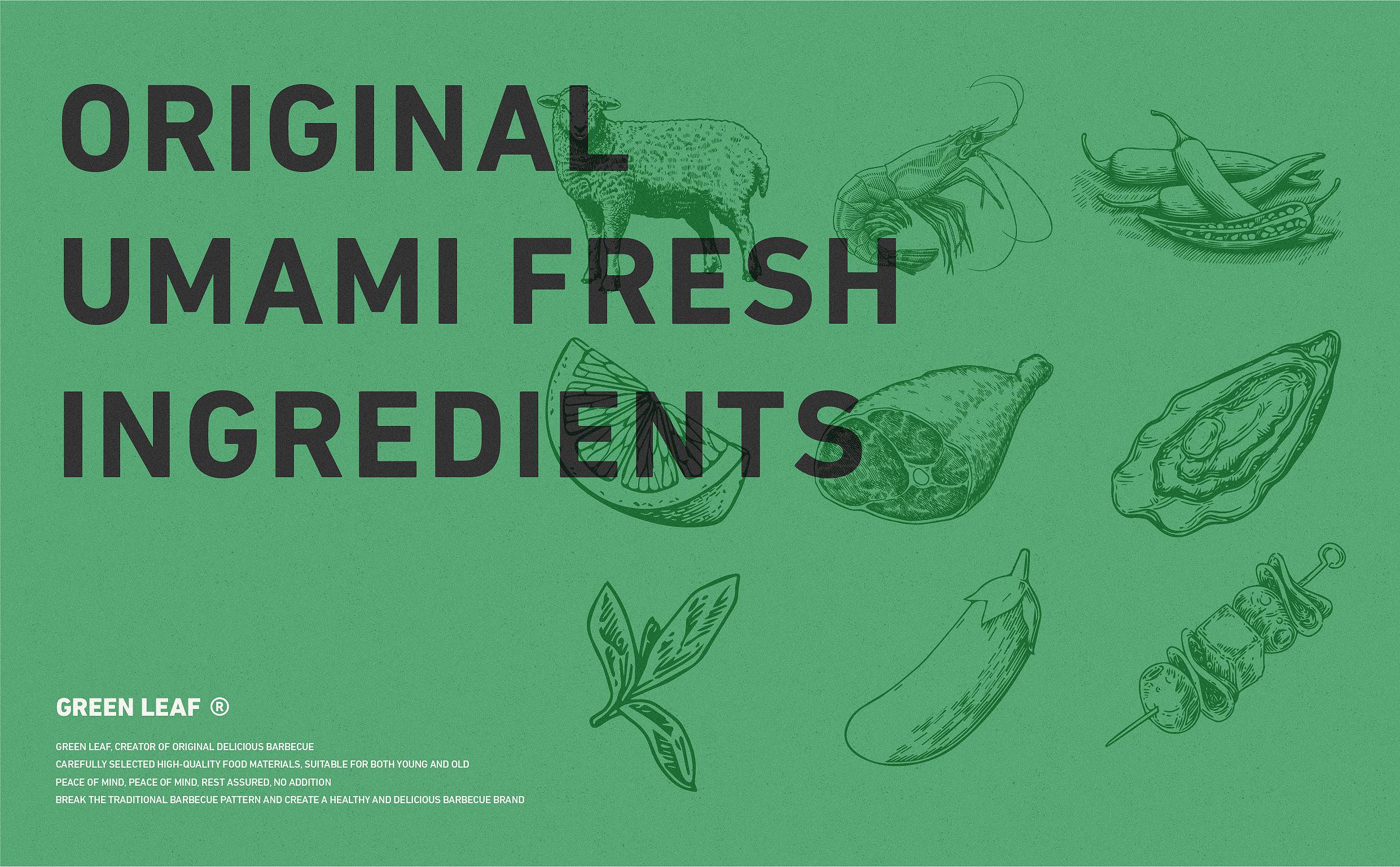 品牌字体设计上,采用律动、整齐的笔画处理,呈现轻盈活力感。同时,将字体“一”、“叶”进行特殊处理:“一”取烧烤签为造型,以打造品类感;“叶”由“0”与“+”巧妙组合而成,代表绿一叶、健康零添加。引入活字印刷、印章概念作为排列方式,赋予厚重感,彰显绿一叶的安全、健康、匠心。