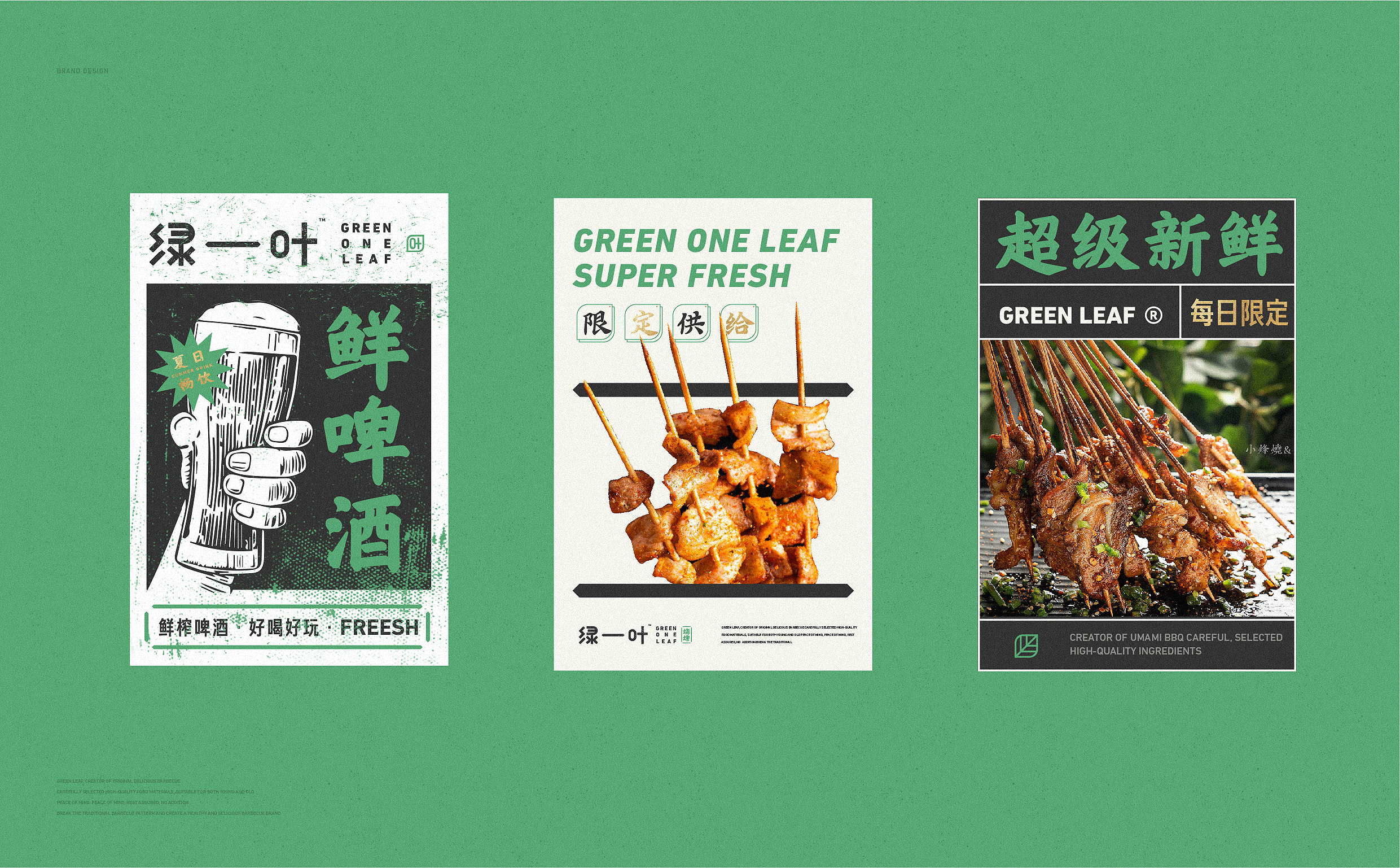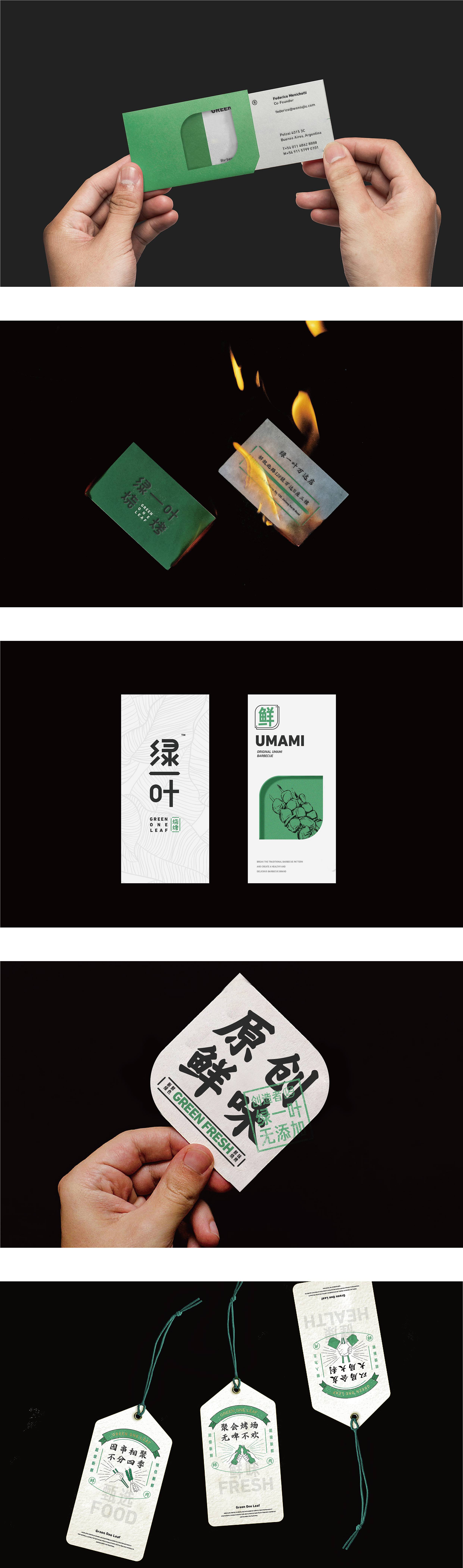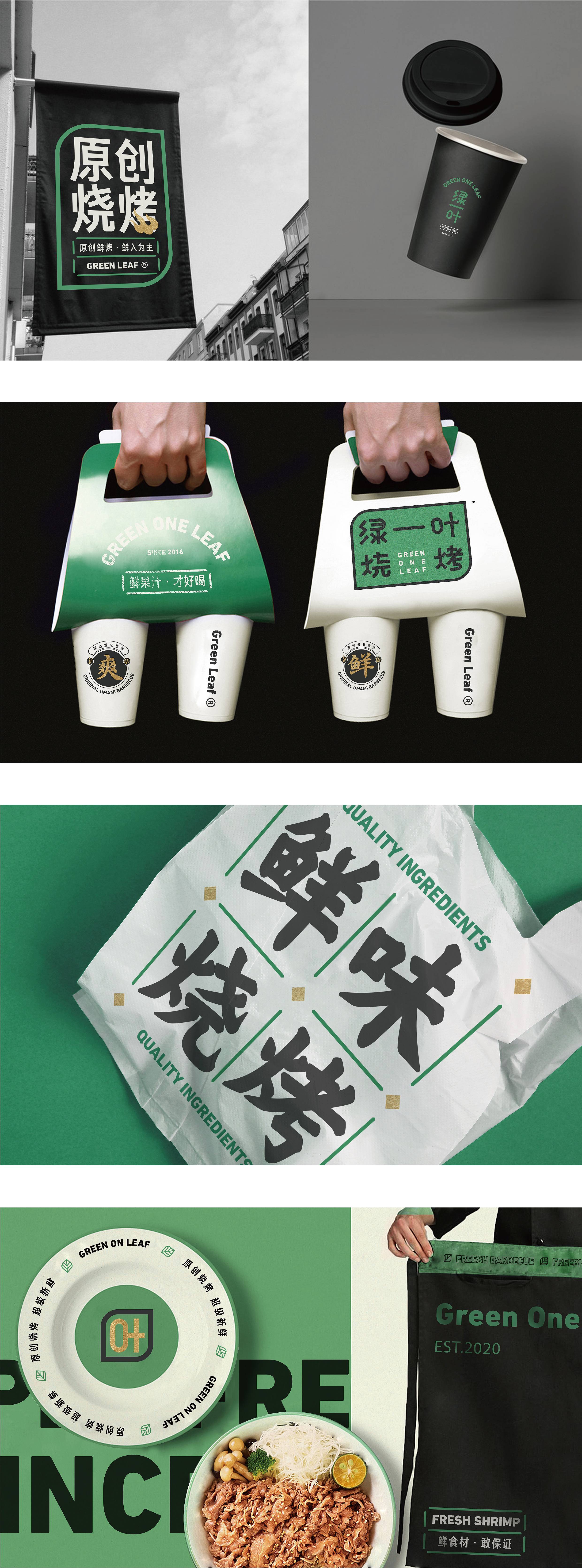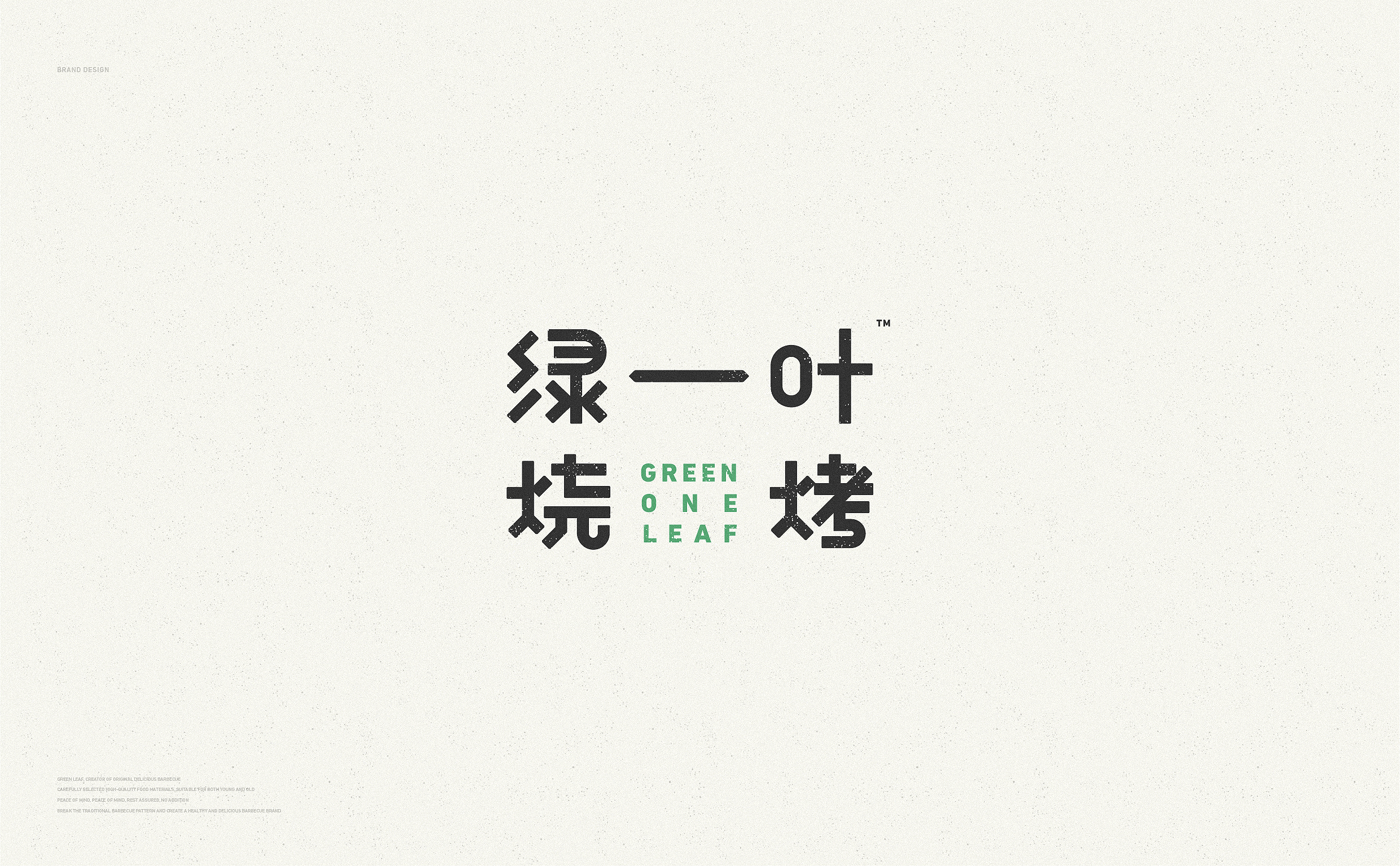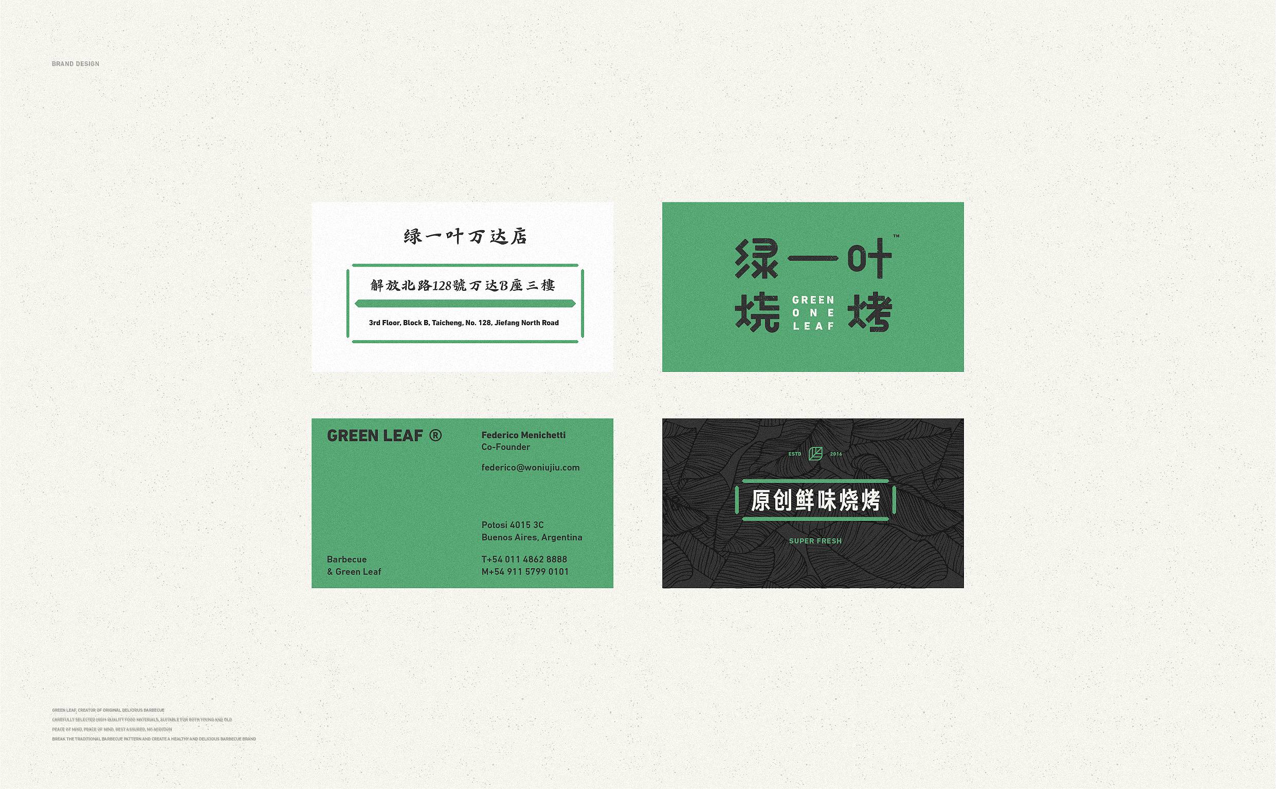 品牌字体设计上,采用律动、整齐的笔画处理,呈现轻盈活力感。同时,将字体“一”、“叶”进行特殊处理:“一”取烧烤签为造型,以打造品类感;“叶”由“0”与“+”巧妙组合而成,代表绿一叶、健康零添加。引入活字印刷、印章概念作为排列方式,赋予厚重感,彰显绿一叶的安全、健康、匠心。