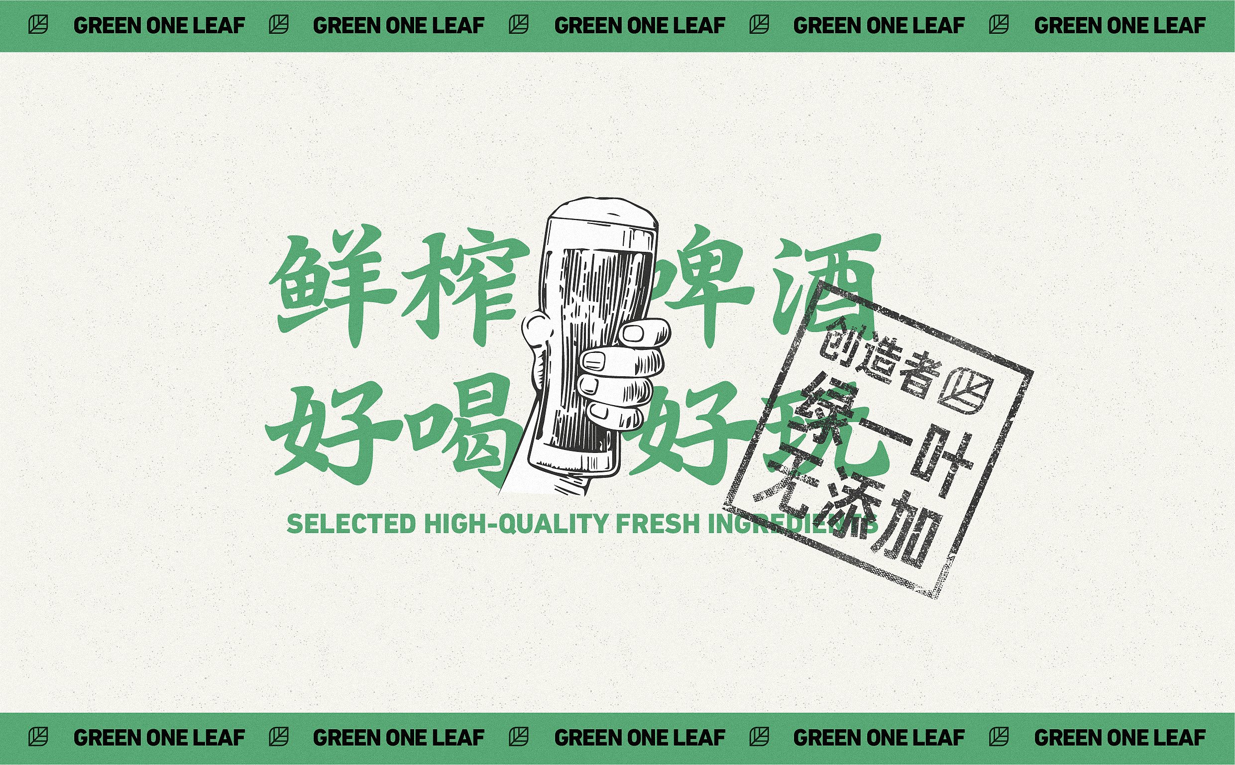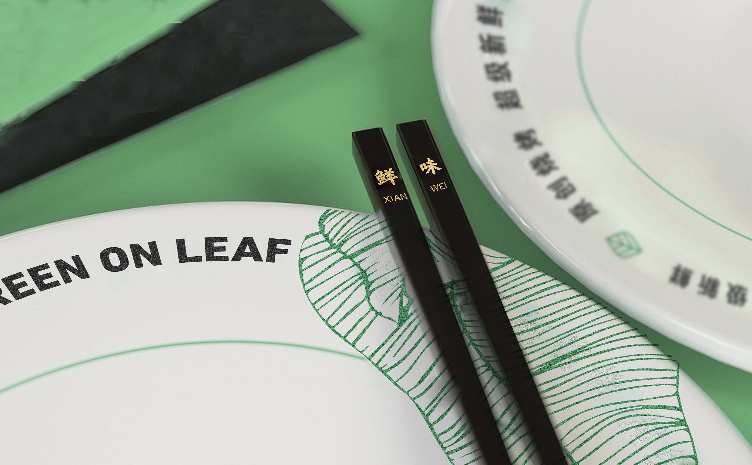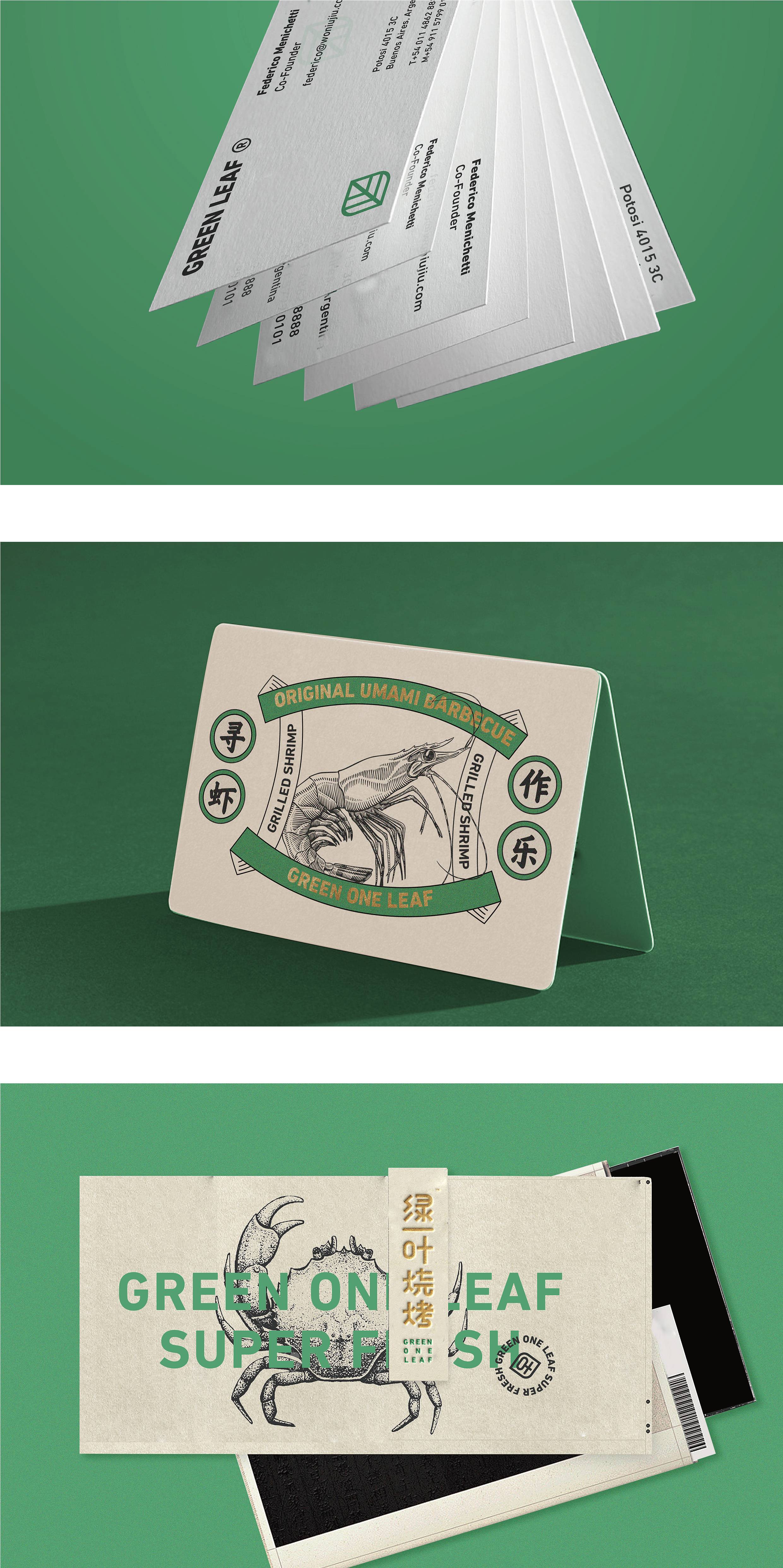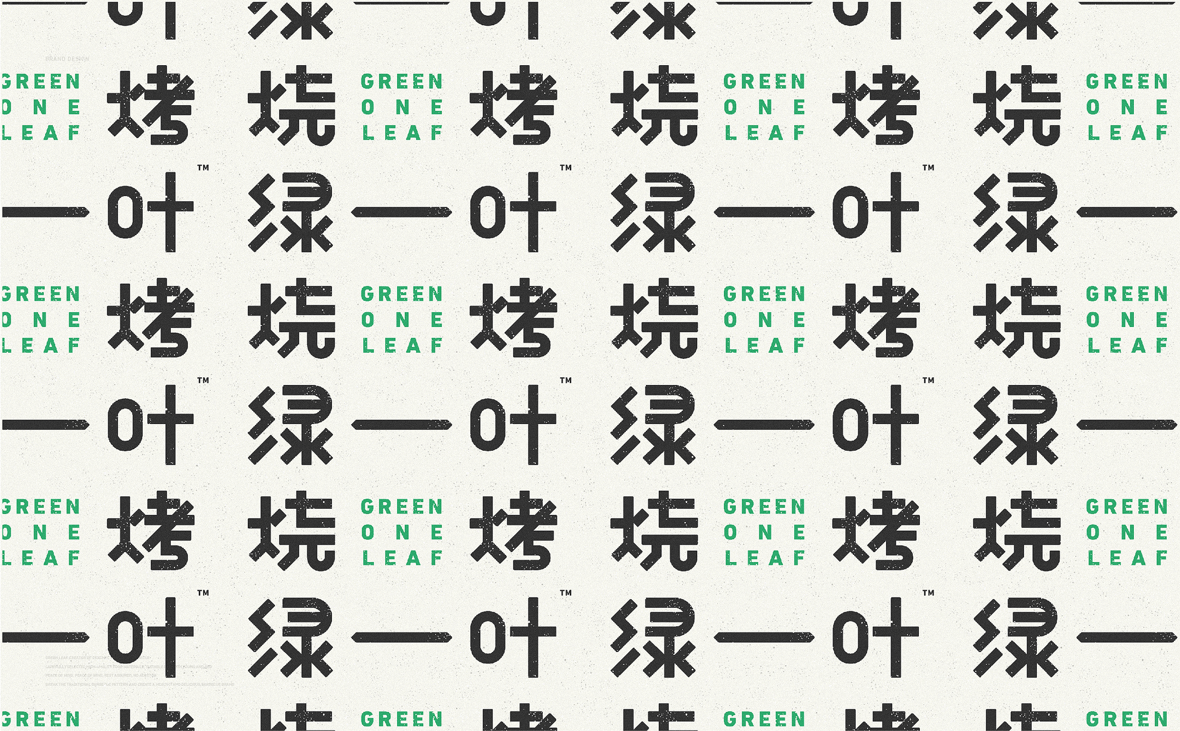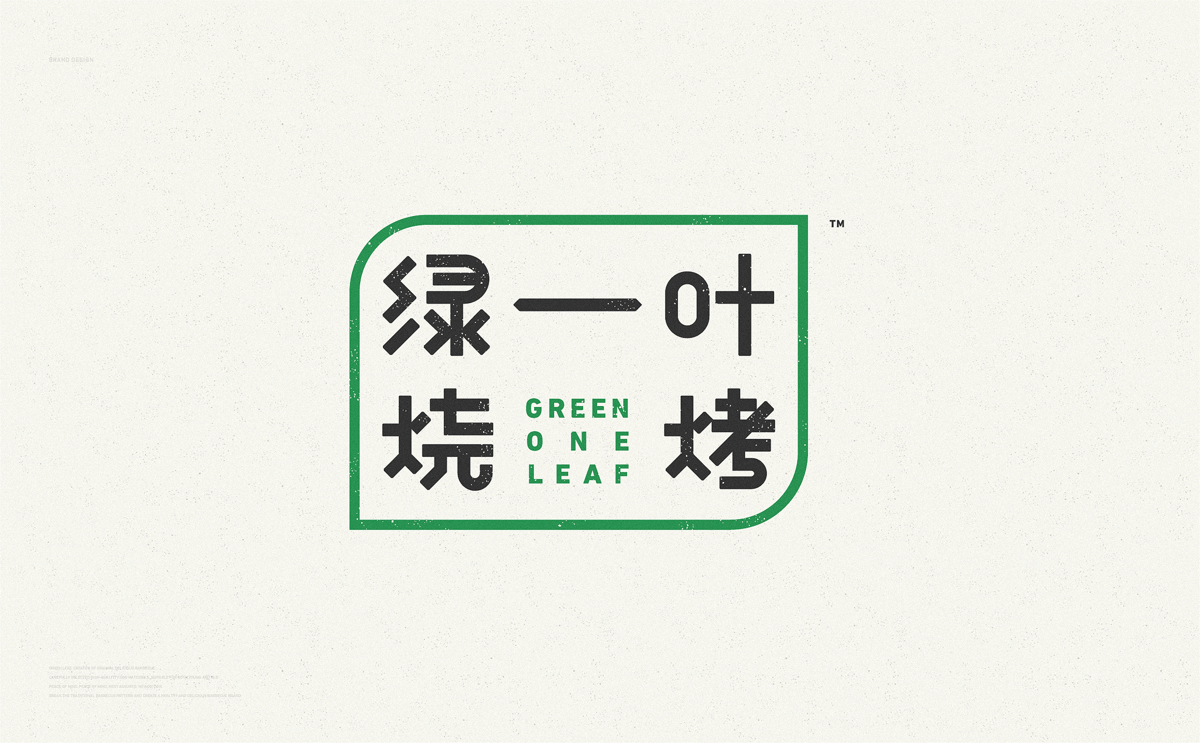 品牌字体设计上,采用律动、整齐的笔画处理,呈现轻盈活力感。同时,将字体“一”、“叶”进行特殊处理:“一”取烧烤签为造型,以打造品类感;“叶”由“0”与“+”巧妙组合而成,代表绿一叶、健康零添加。引入活字印刷、印章概念作为排列方式,赋予厚重感,彰显绿一叶的安全、健康、匠心。