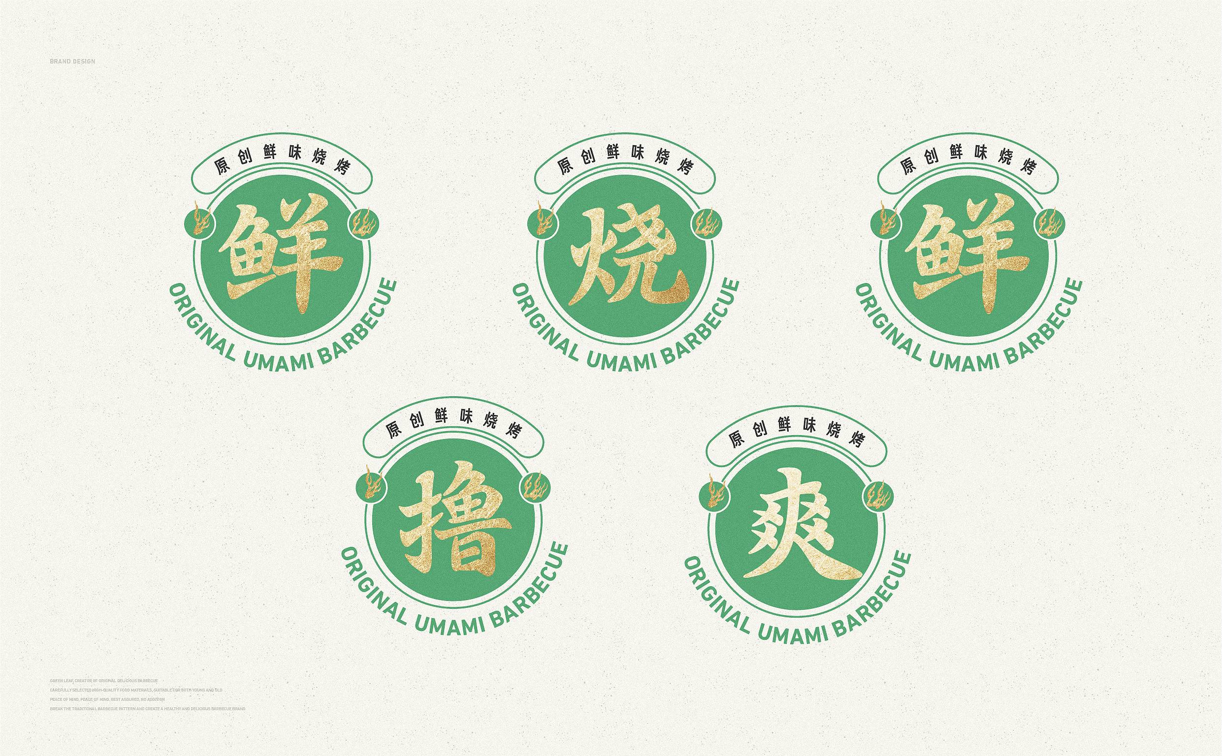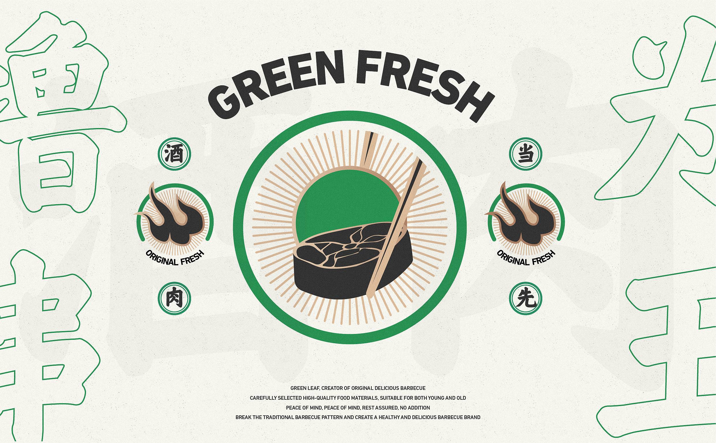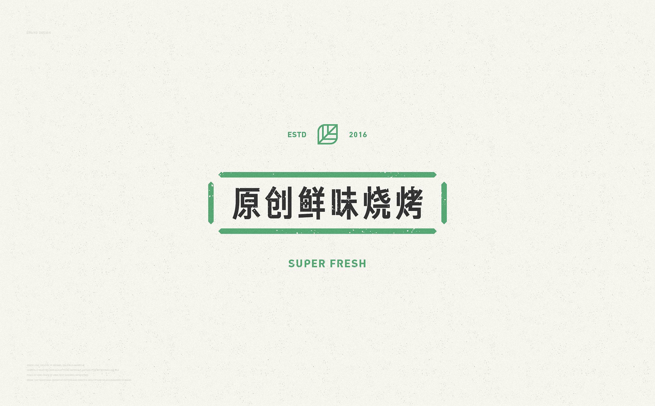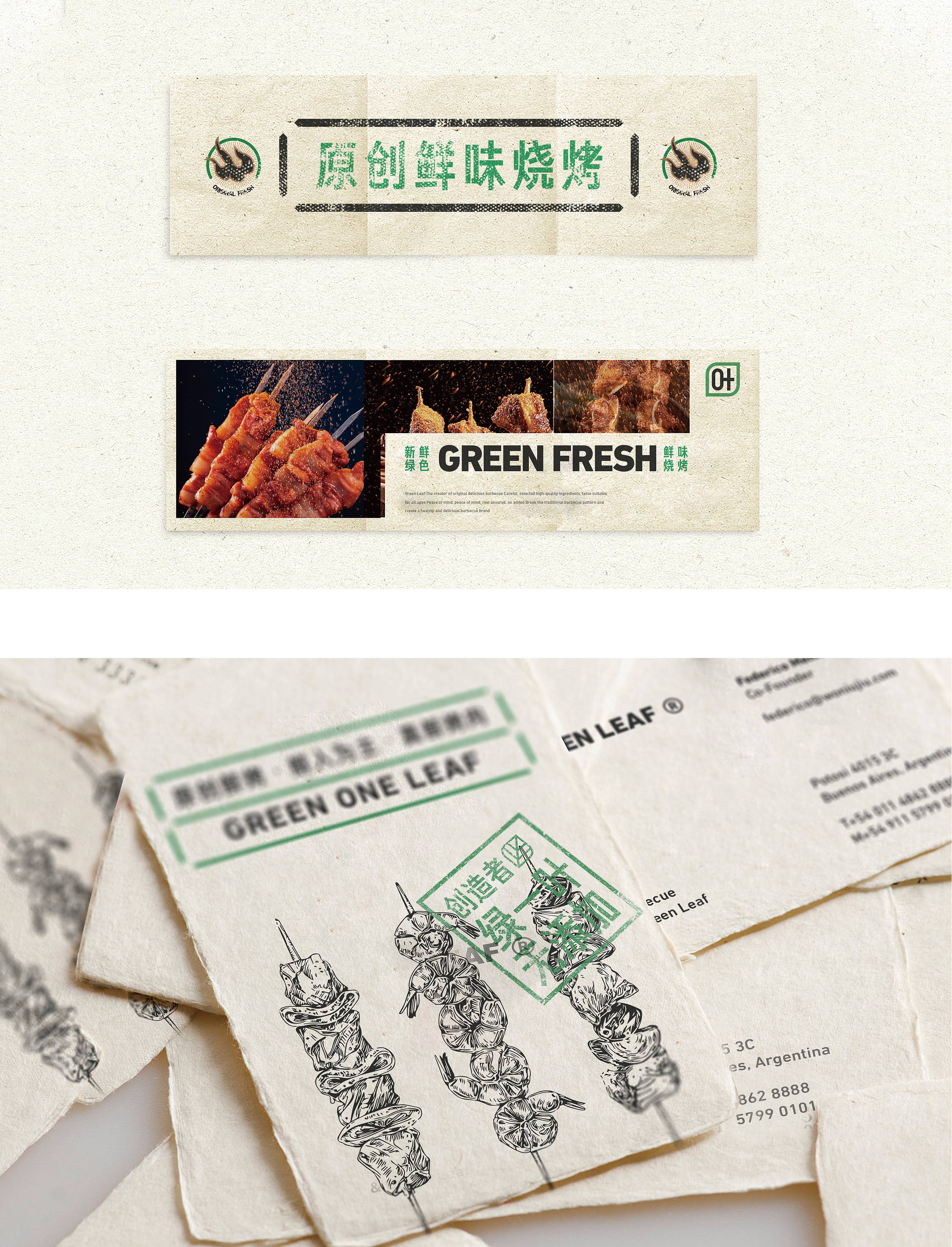 品牌配色上,突破传统烧烤火热的色彩氛围,采用草木绿为主基调,低明度的绿,沉稳而低调,代表着健康、新鲜,同时传达品牌坚韧的生命力,搭配质感灰和淡雅白为辅助色,与“质朴、匠心”产生联想,呈现新派烧烤形象。