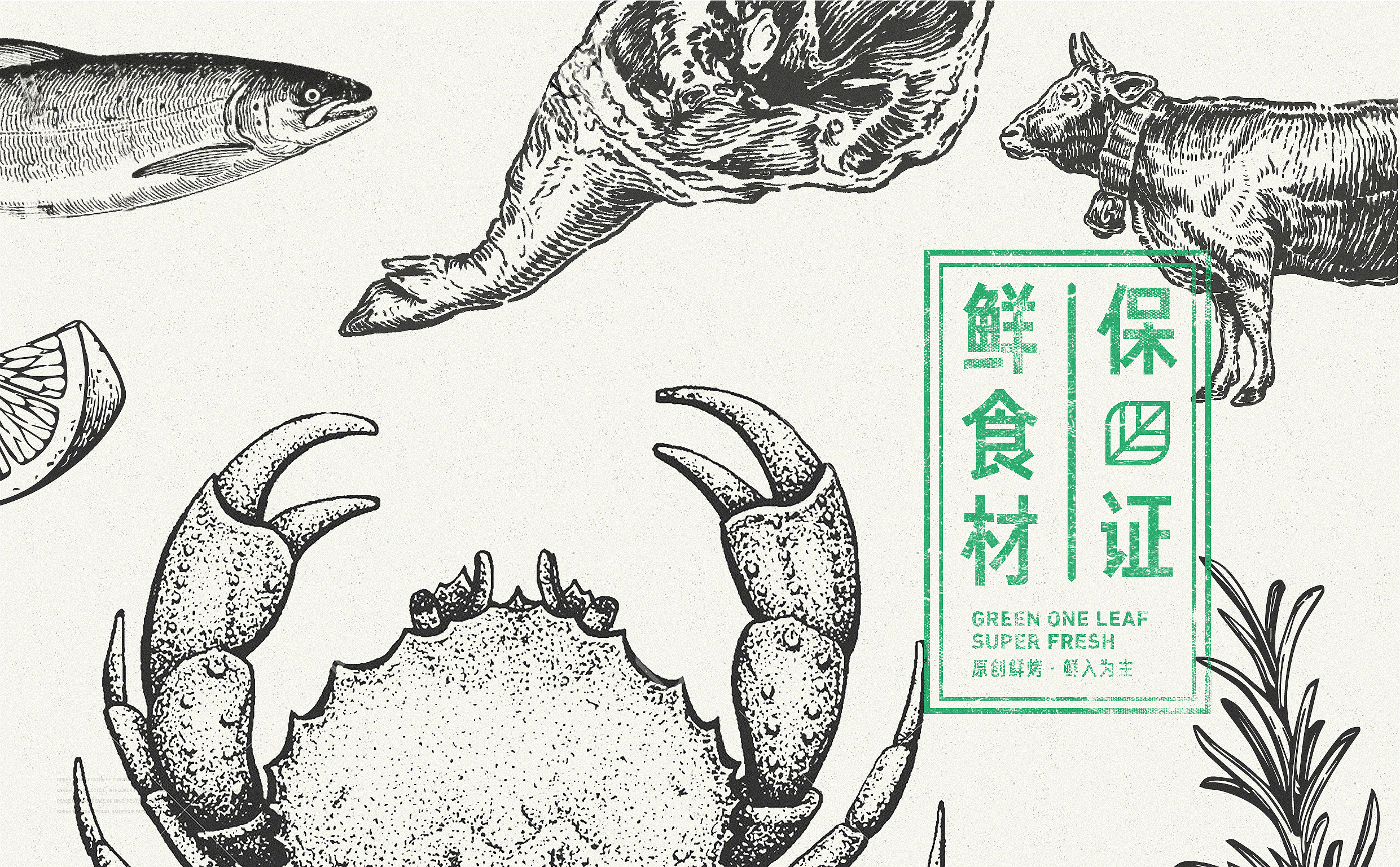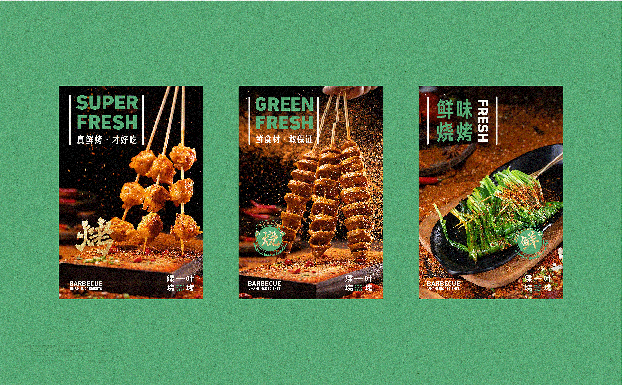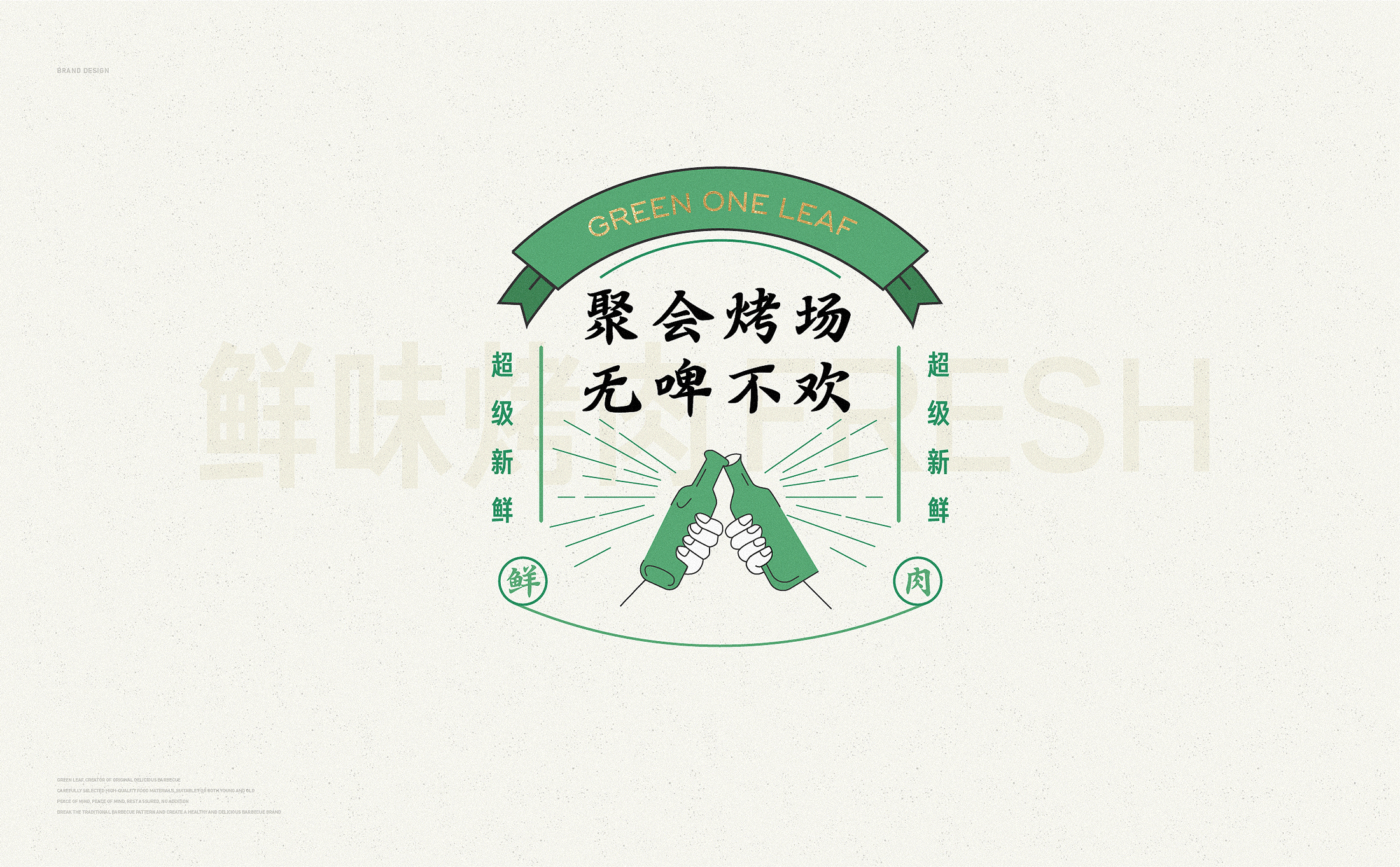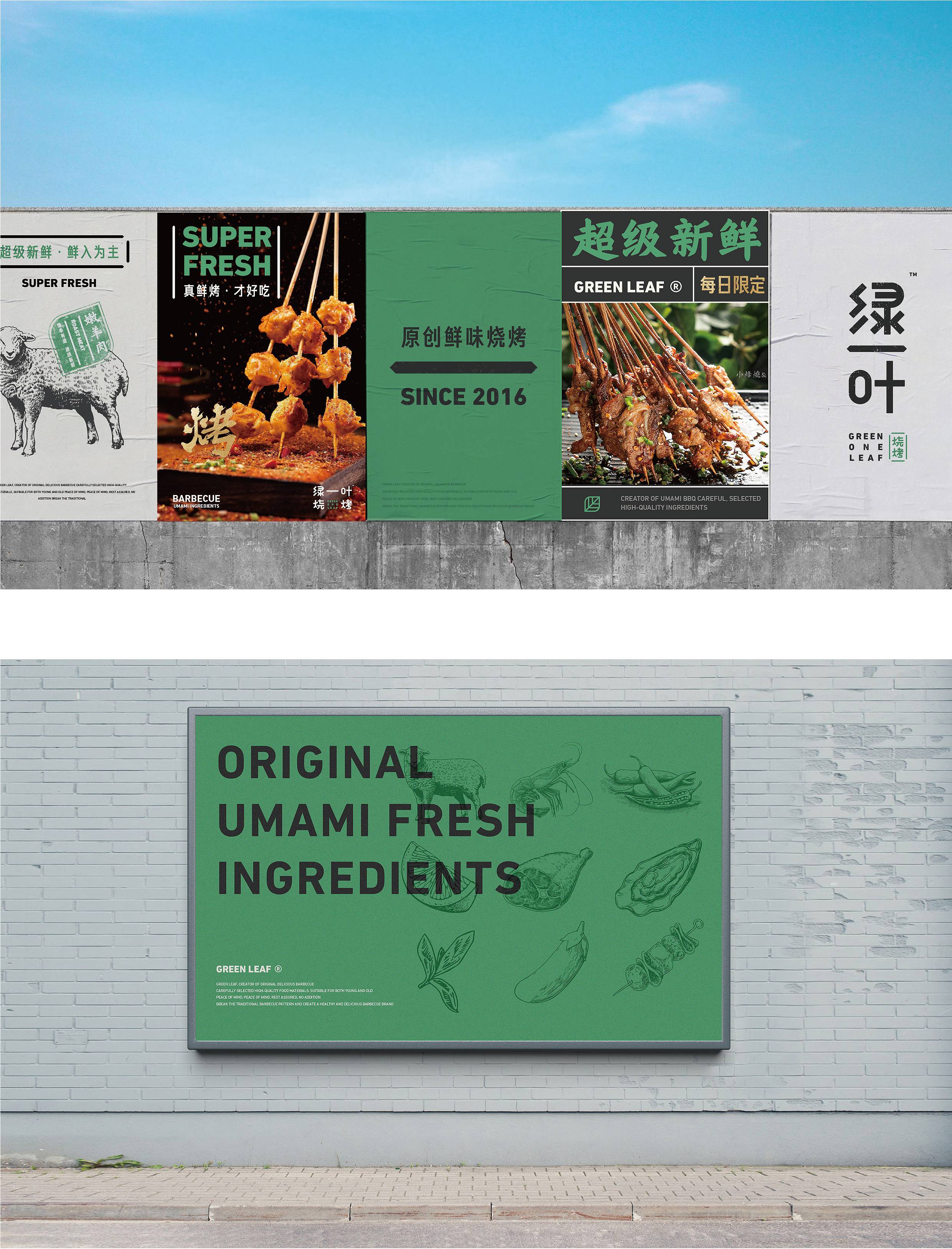 品牌配色上,突破传统烧烤火热的色彩氛围,采用草木绿为主基调,低明度的绿,沉稳而低调,代表着健康、新鲜,同时传达品牌坚韧的生命力,搭配质感灰和淡雅白为辅助色,与“质朴、匠心”产生联想,呈现新派烧烤形象。