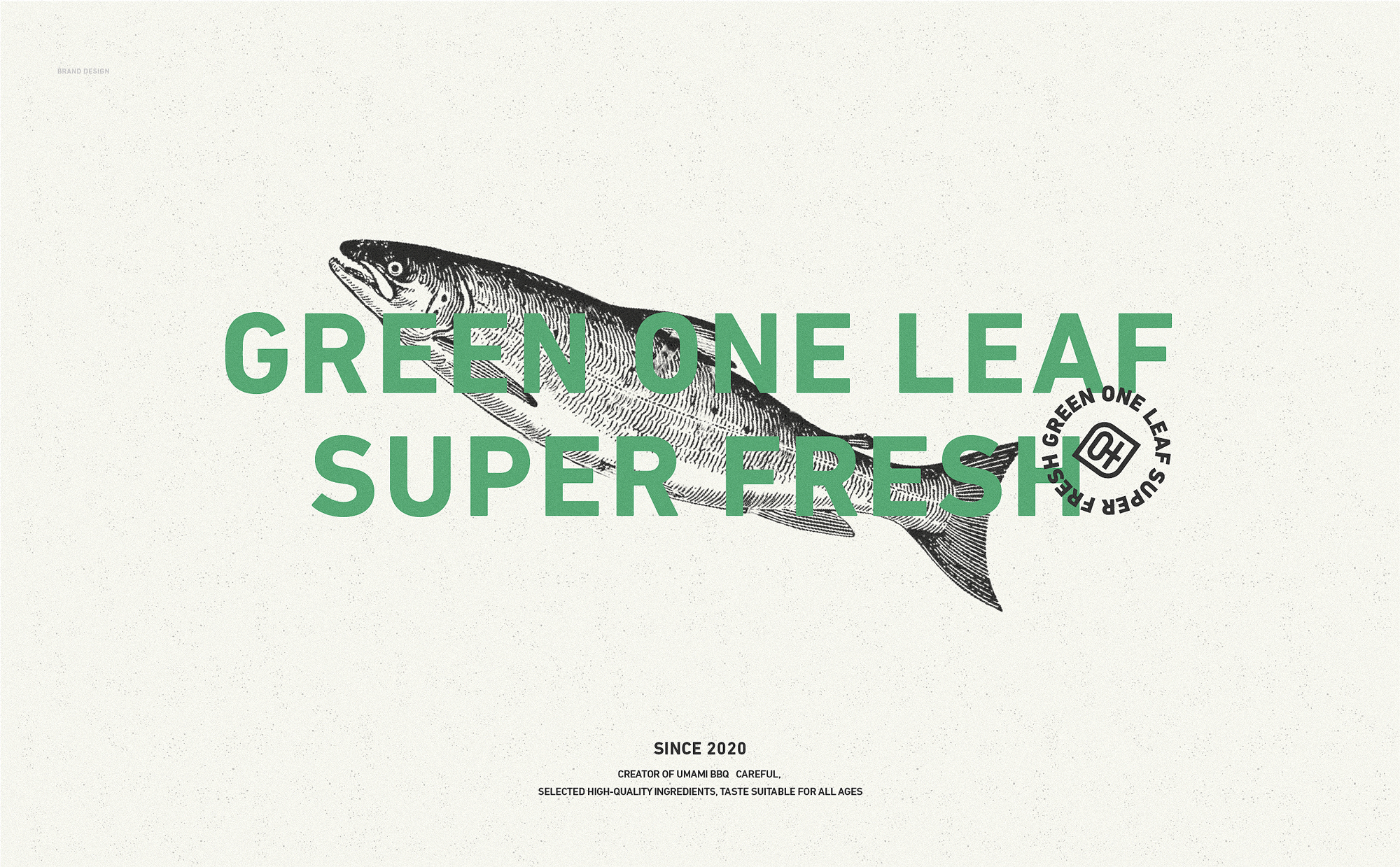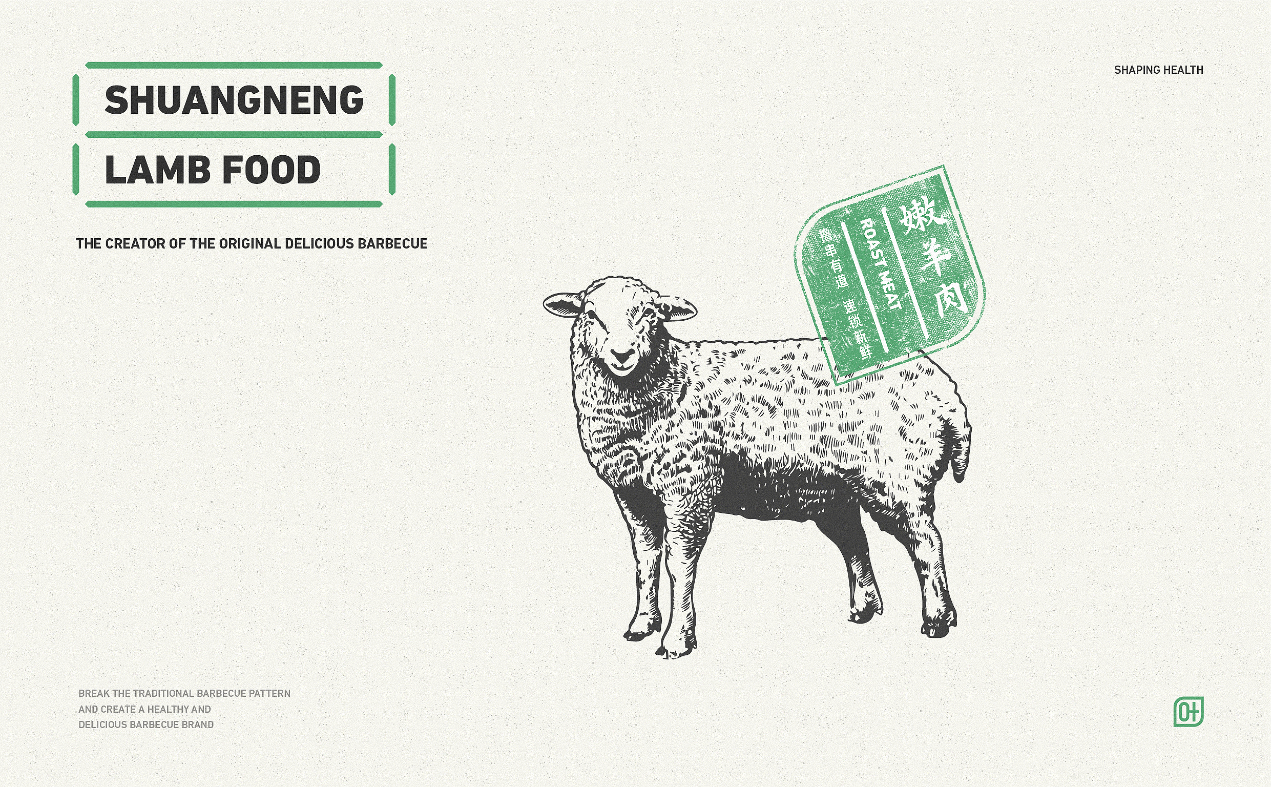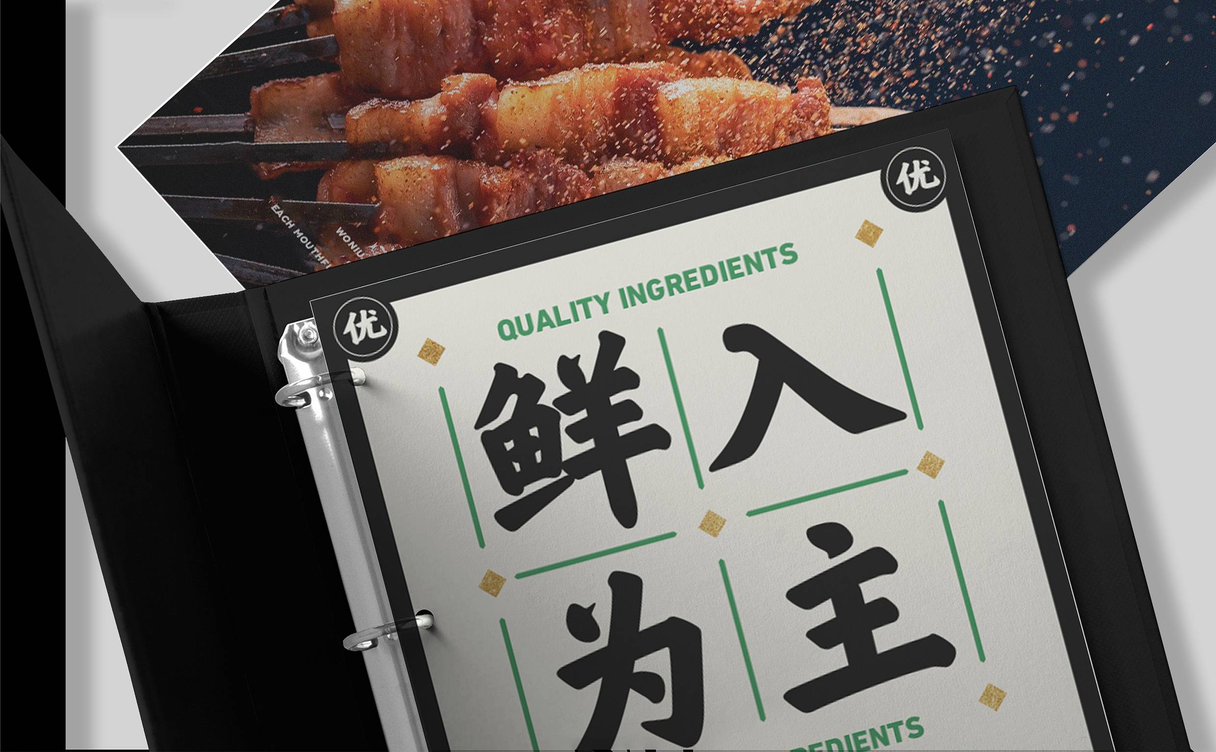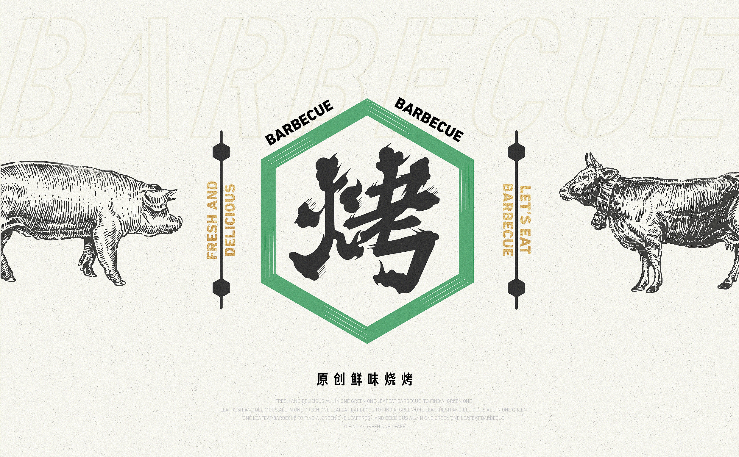 品牌配色上,突破传统烧烤火热的色彩氛围,采用草木绿为主基调,低明度的绿,沉稳而低调,代表着健康、新鲜,同时传达品牌坚韧的生命力,搭配质感灰和淡雅白为辅助色,与“质朴、匠心”产生联想,呈现新派烧烤形象。