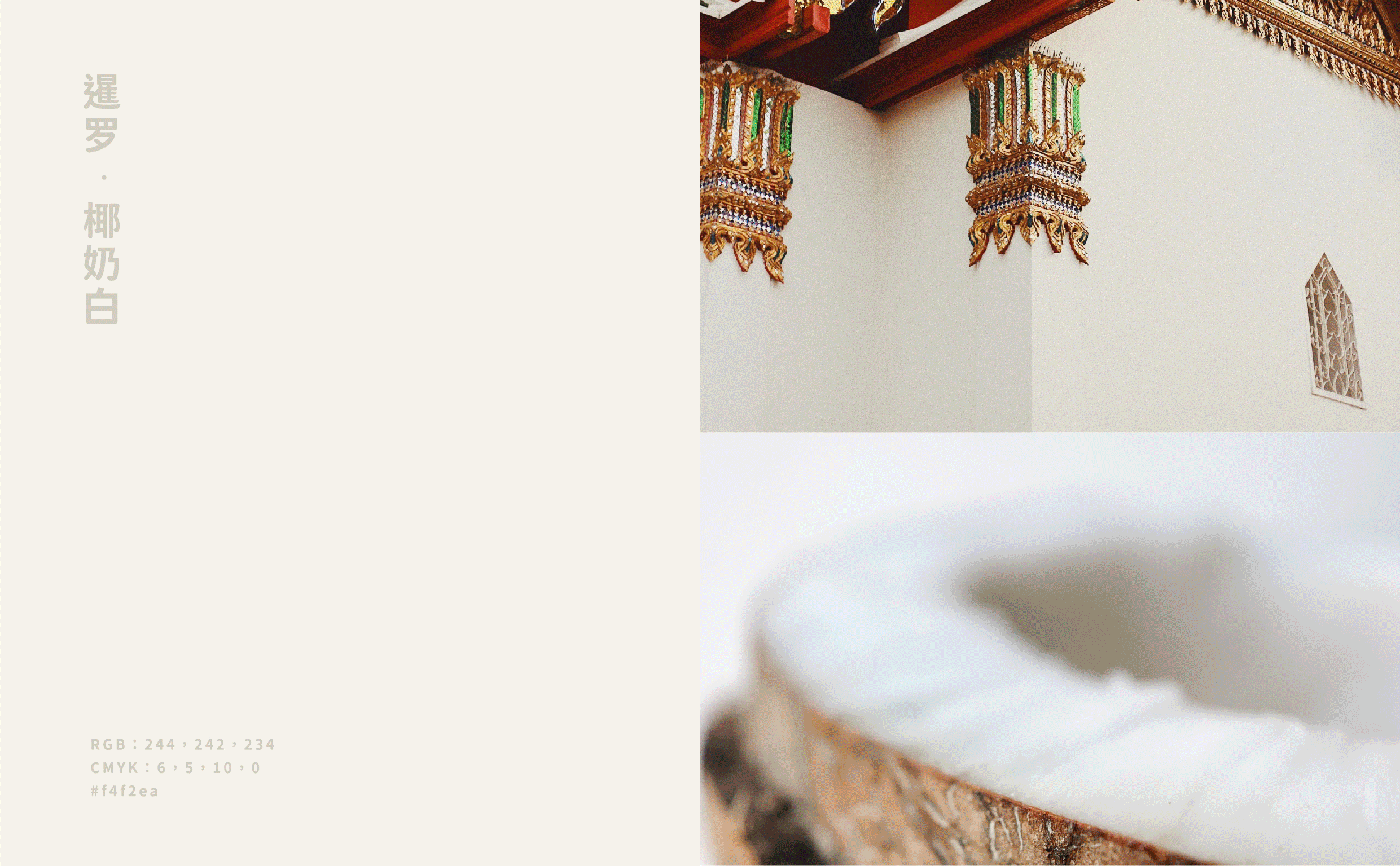我们从泰式代表物中吸取色彩灵感:冬阴功的橙,代表着热情和向上的态度;椰青的绿,代表着葱郁韧性的生机感;椰奶的白,代表善良亲和的一面。辅以明丽的色彩,呈现时尚与潮流的泰式风情。