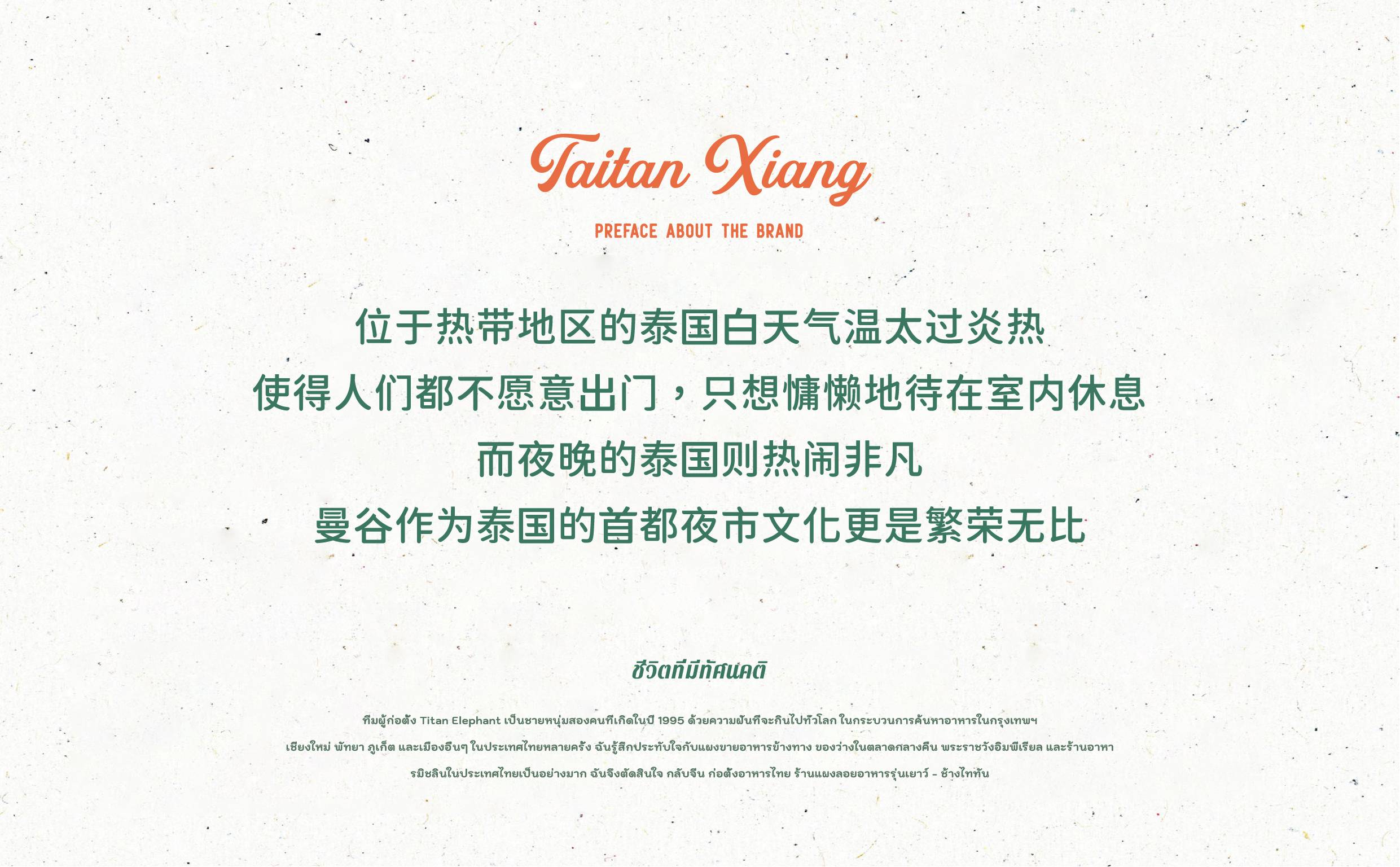 泰坦象,由两个95后年轻小伙联手创立。在两人多次前往泰国各地寻觅美食的过程中,对泰国街头的大排档、夜市小吃有着深刻印象,于是决定回国创办泰式大排档年轻品牌——泰坦象,主打泰国夜市美食,让每一份菜品都变成有感情的实惠餐食,让每一位进店的顾客都能切身体会泰国市井的人间风味。