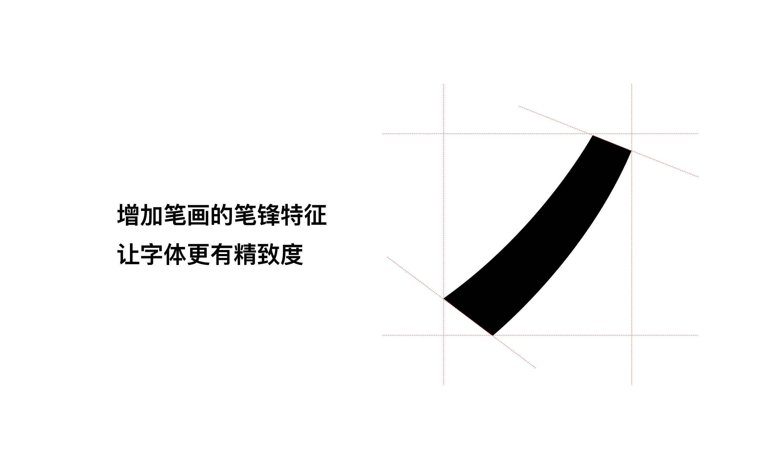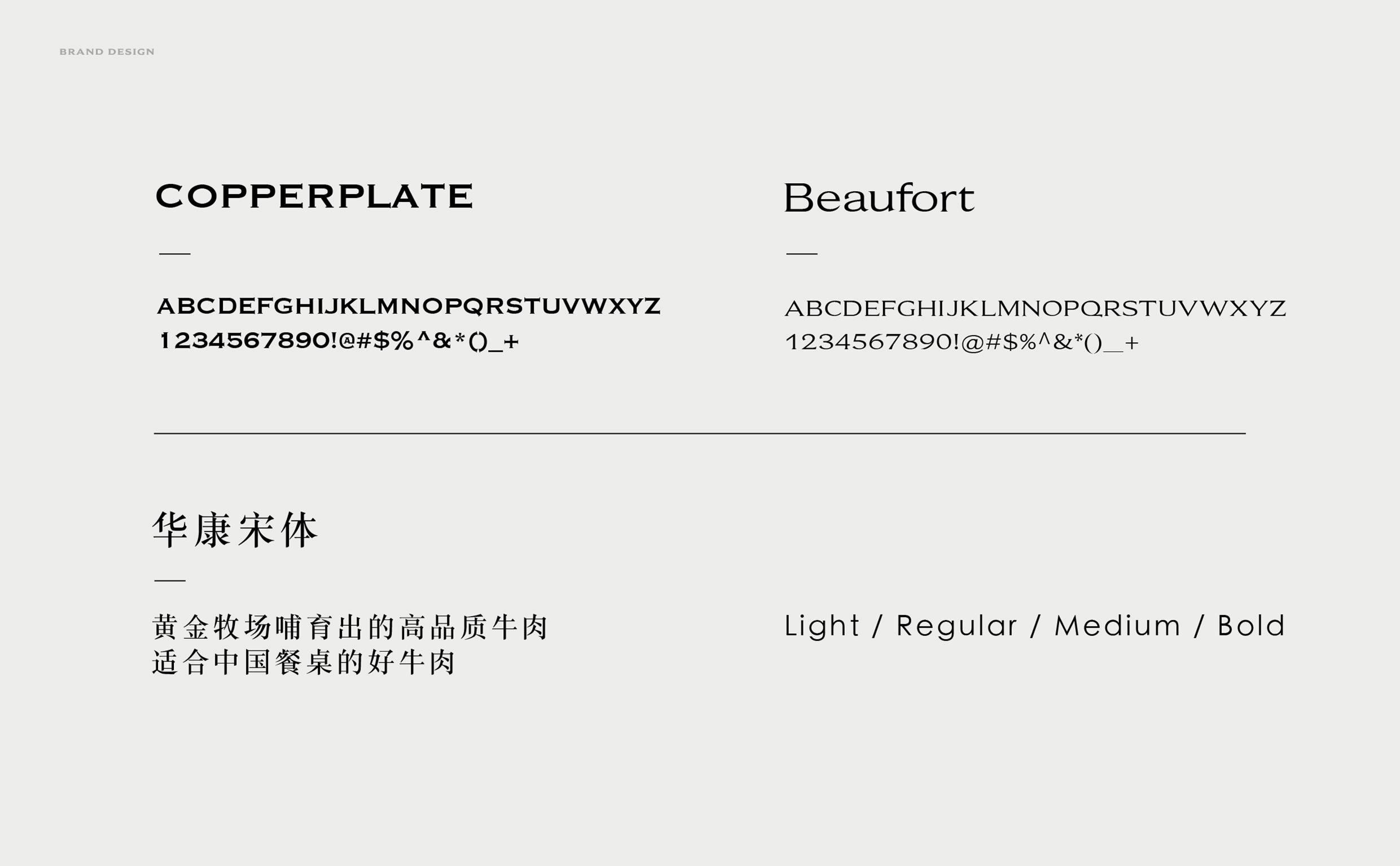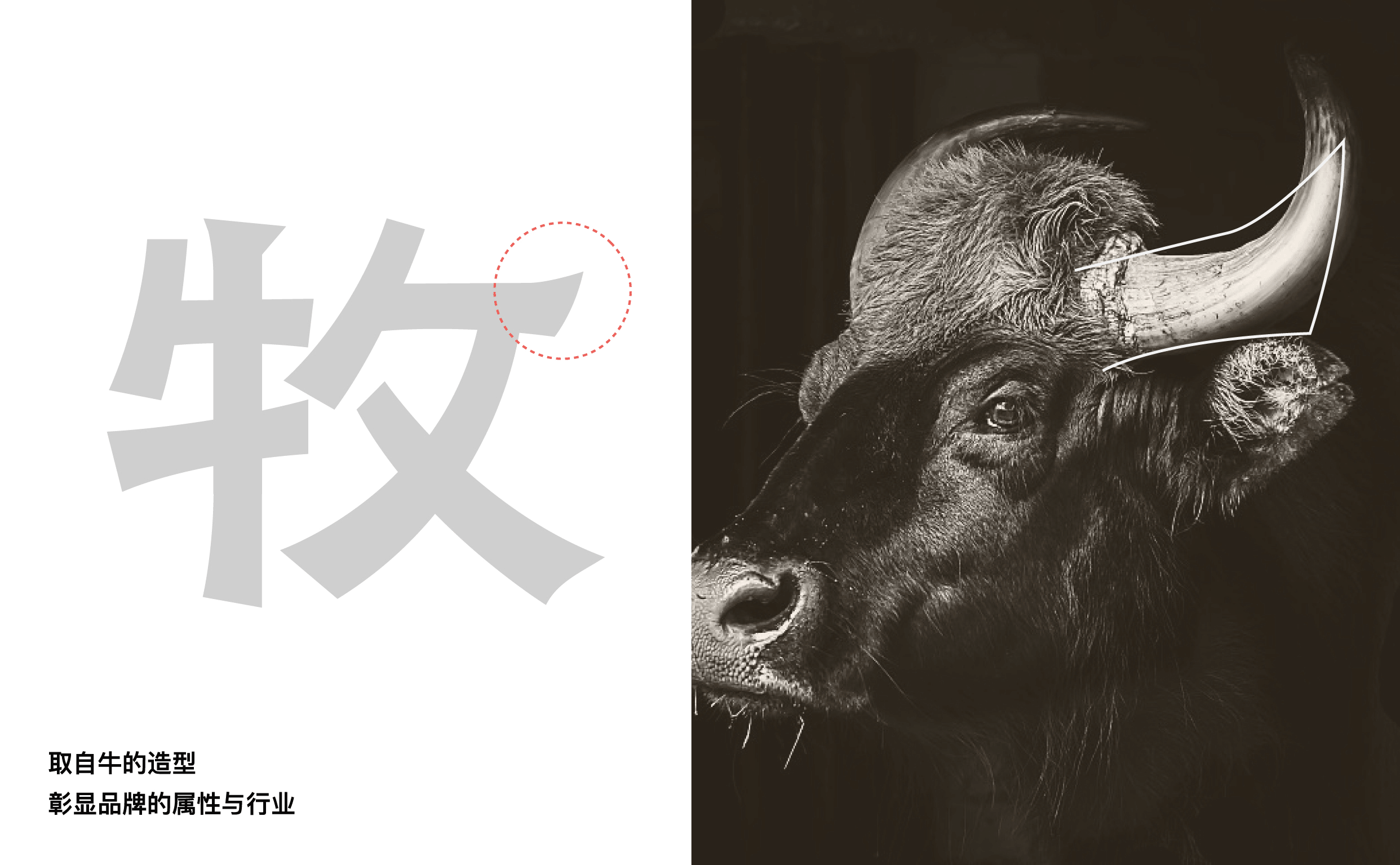 我们希望品牌的字体是能够体现定位的:中国的、品质的、精致的、高端的。我们选取了两种字体书法“汉隶唐楷”作为基础字形,两者都是方正的,更有力量感。同时增加笔锋特征,让字体更显精致;取“牛”造型,末端上翘,以此代表文化自信与产品自信。