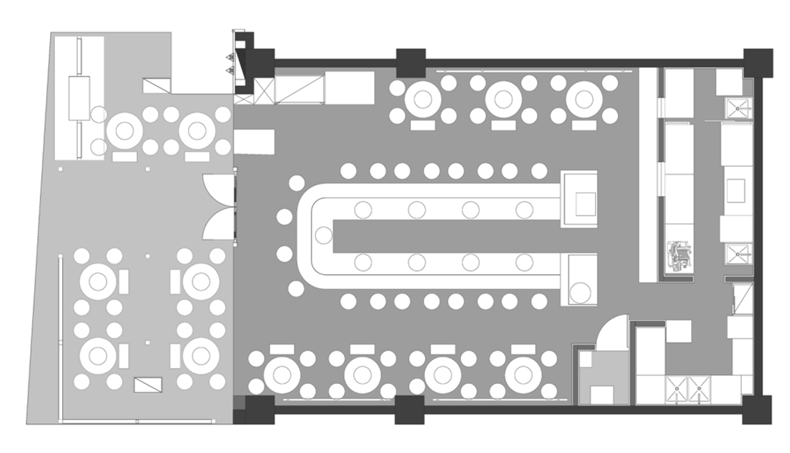 散座规整摆放两侧,中央设置环形烤台,打破了传统餐桌边界,满足一人或聚会用餐需求,同时强化聚集的热闹感。
