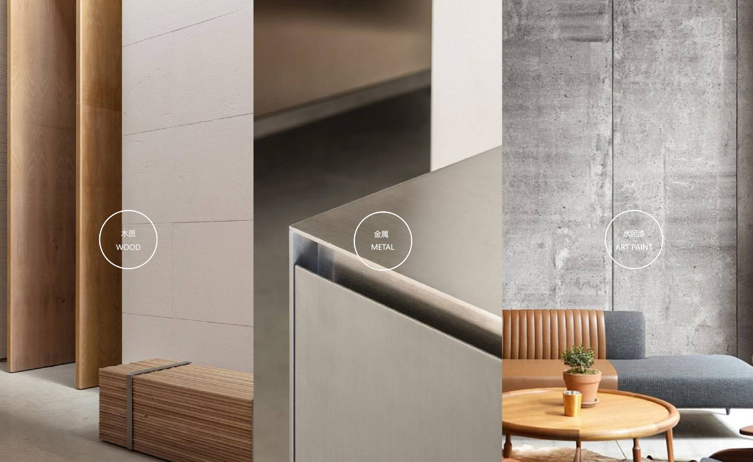 主要材质/ 木饰面、水泥艺术涂料、老木板、金属、米白长条砖