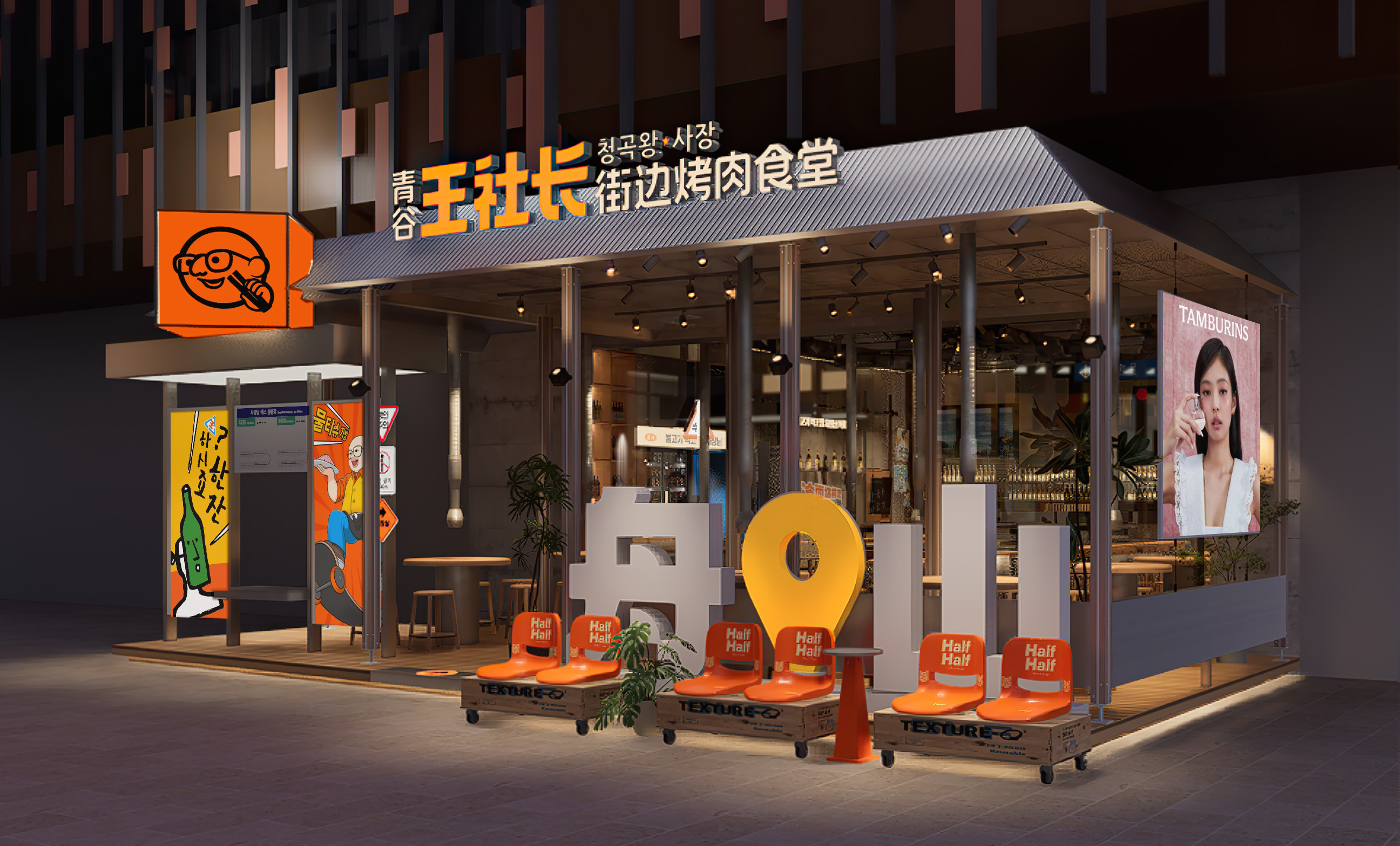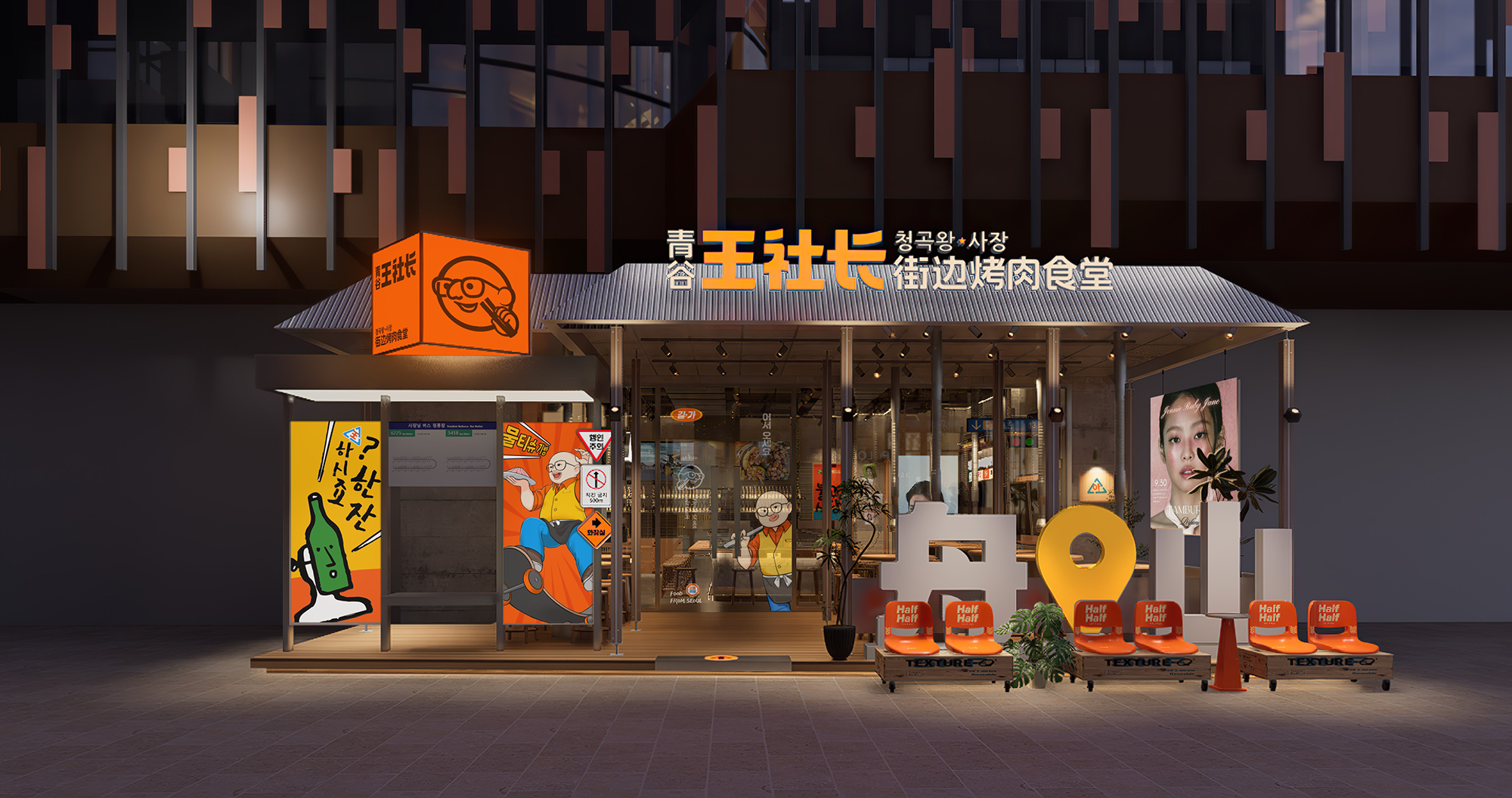 门头外摆区域以 “沉浸式韩式街头场景” 为核心设计概念。金属立柱撑起的简约顶棚覆盖整个外摆区,形成通透开放的用餐空间,有效打破传统店面与街道的物理界限,让烤肉的烟火气自然漫溢至街边。