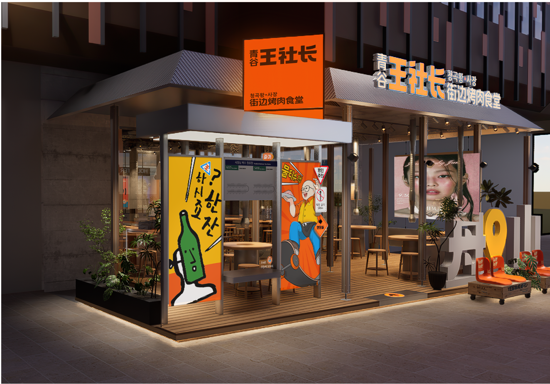 左侧的韩国公交站主题打卡区复刻首尔街景——韩文站牌、品牌插画与灯箱,构成强烈的异国街头符号;右侧摆放特色可移动户外座椅与盆栽绿植,并在其后方矗立醒目的立体“舟山”字样装置,与公交站形成虚实呼应的打卡地标,将等位区转化为可休憩拍照的社交据点。