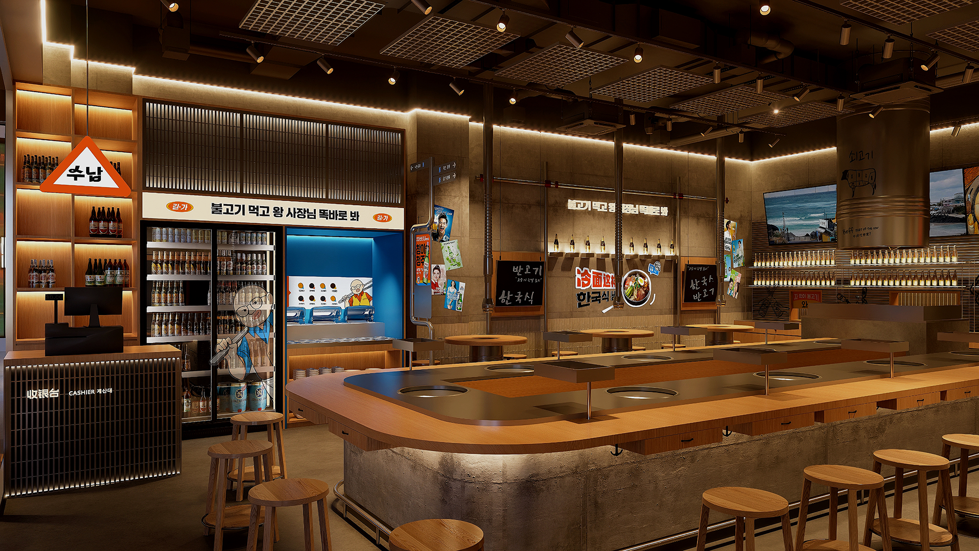 墙面设计是展现市井文化的窗口。韩文标语、手绘涂鸦、韩流海报与酒水陈列架穿插排布,将韩国街头的餐酒馆文化生动呈现,每一处细节都强化着“街边食堂”的在地化体验。让食客在就餐过程中,能持续感受到韩式餐饮的社交烟火气与潮流活力,实现空间体验与餐饮文化的深度交融。