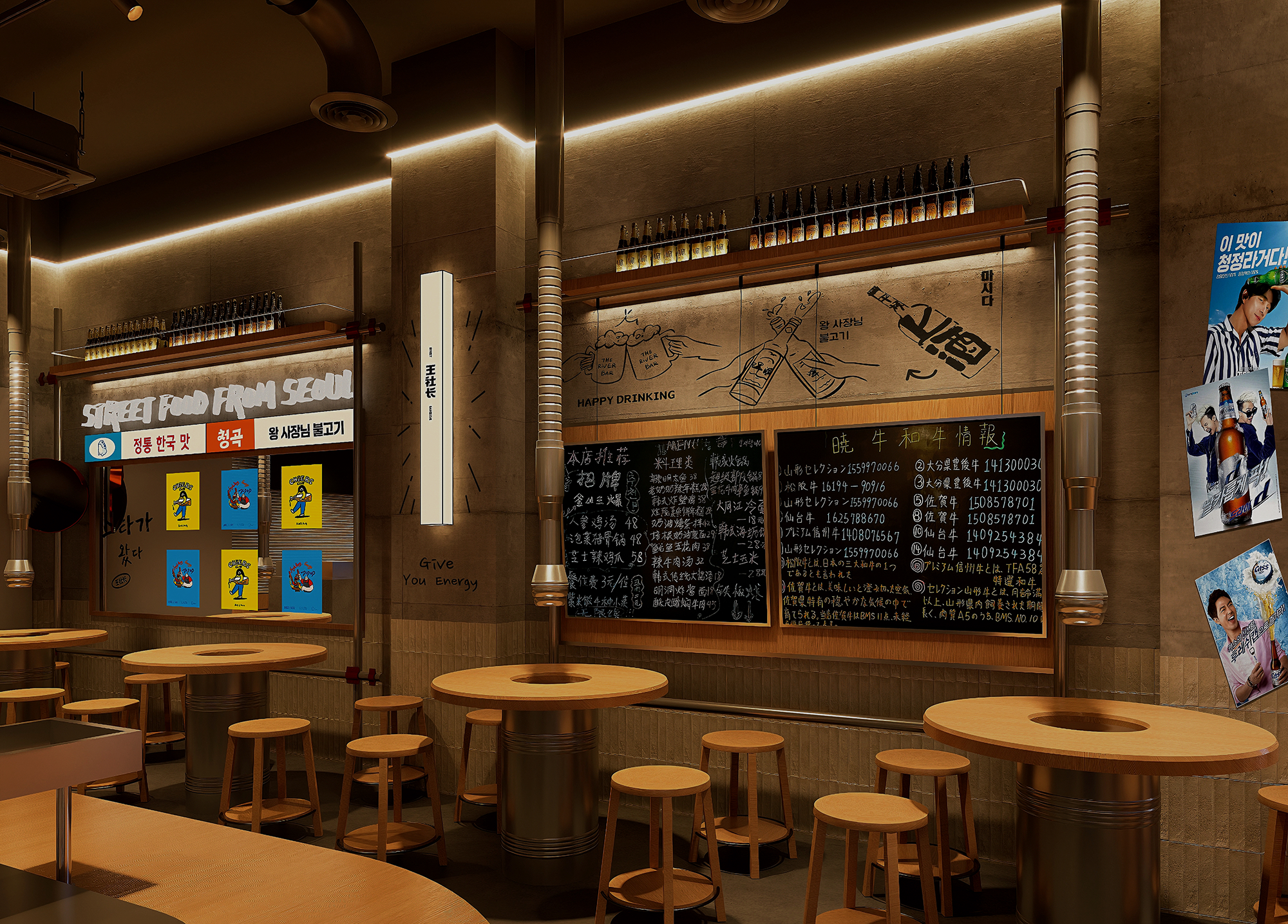 步入店内,工业风基底与韩式市井元素巧妙融合,营造出松弛、热闹且充满叙事感的氛围。裸露的水泥墙、金属管道与格栅吊顶,共同交织出粗犷的工业气质,而温润的原木与暖黄色氛围照明则恰好中和了其冷硬感,营造出温馨又有现代感的对比美,烘托出韩式街头深夜食堂特有的烟火温度。