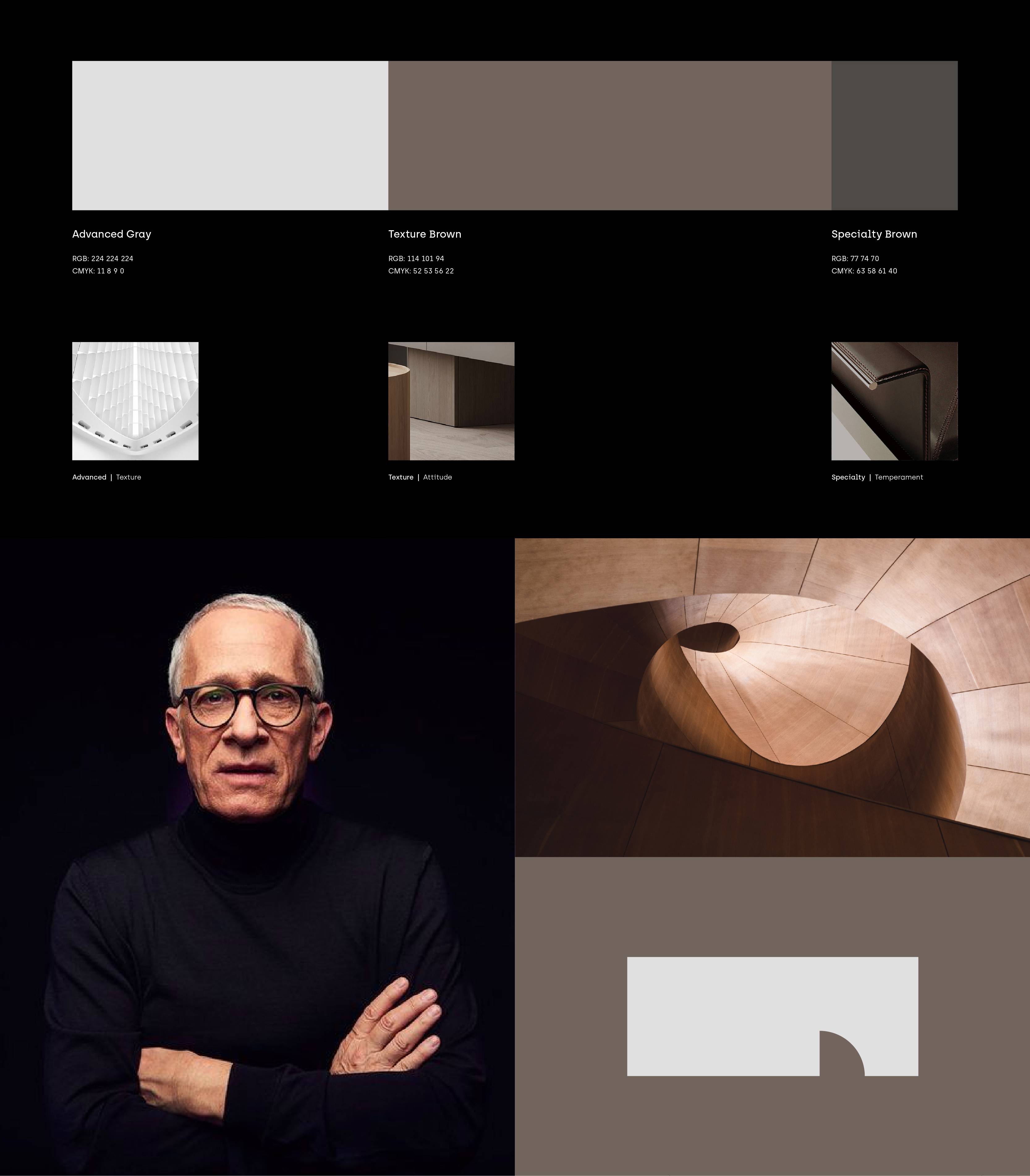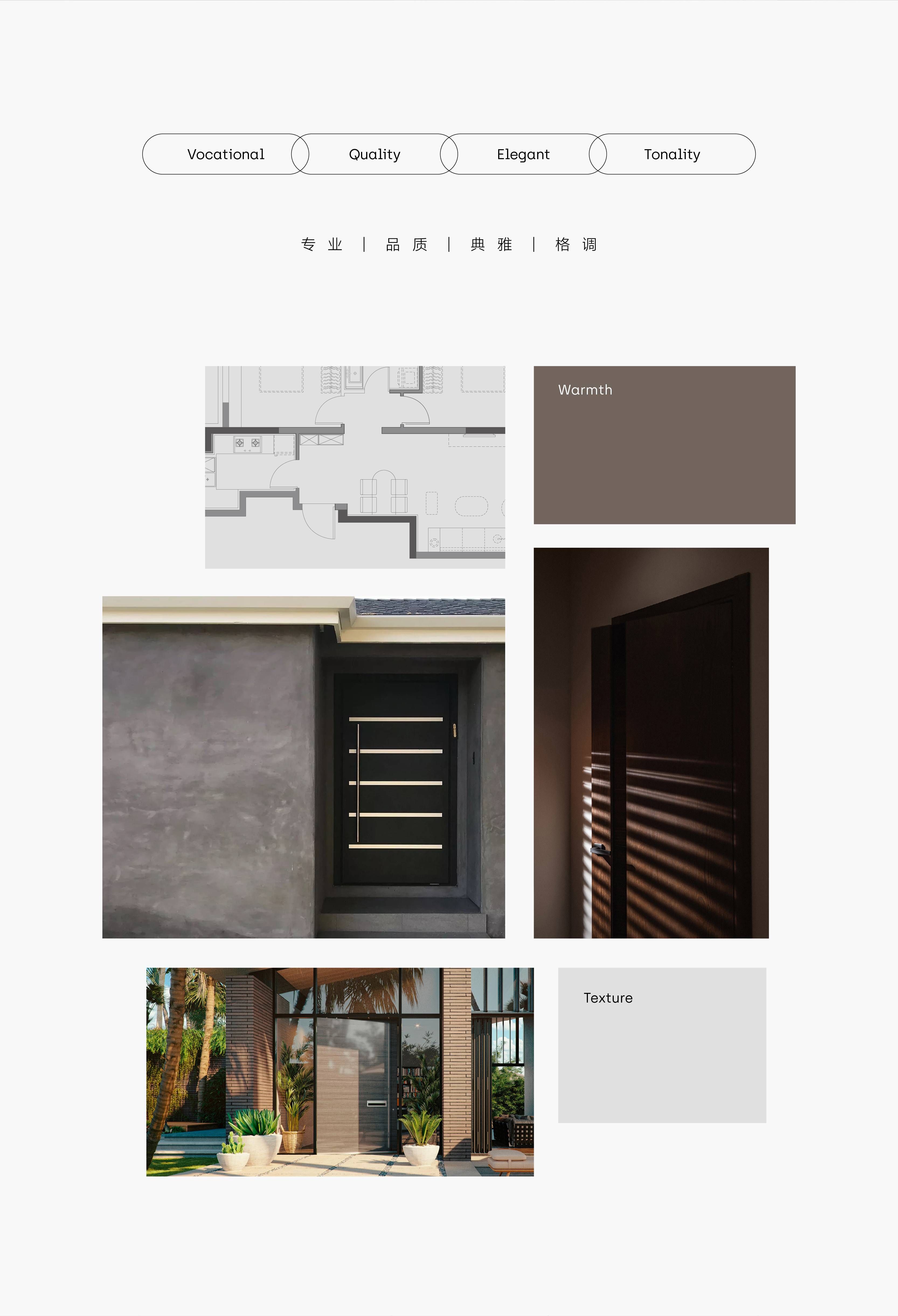 基于“专业、品质、典雅、格调”的品牌关键词,摒弃高饱和色彩的视觉冲击,以低饱和度色系传递“内敛的高级感”——灰调契合行业属性,棕调诠释材质温度,白调呼应典雅气质,三者协同构建既符合顶尖制造属性,又适配高端空间美学的色彩语言。