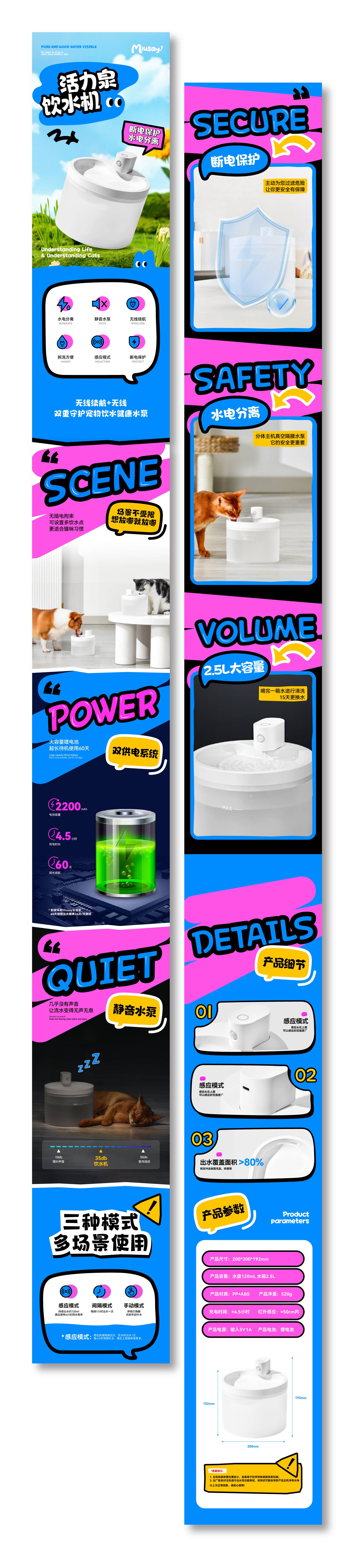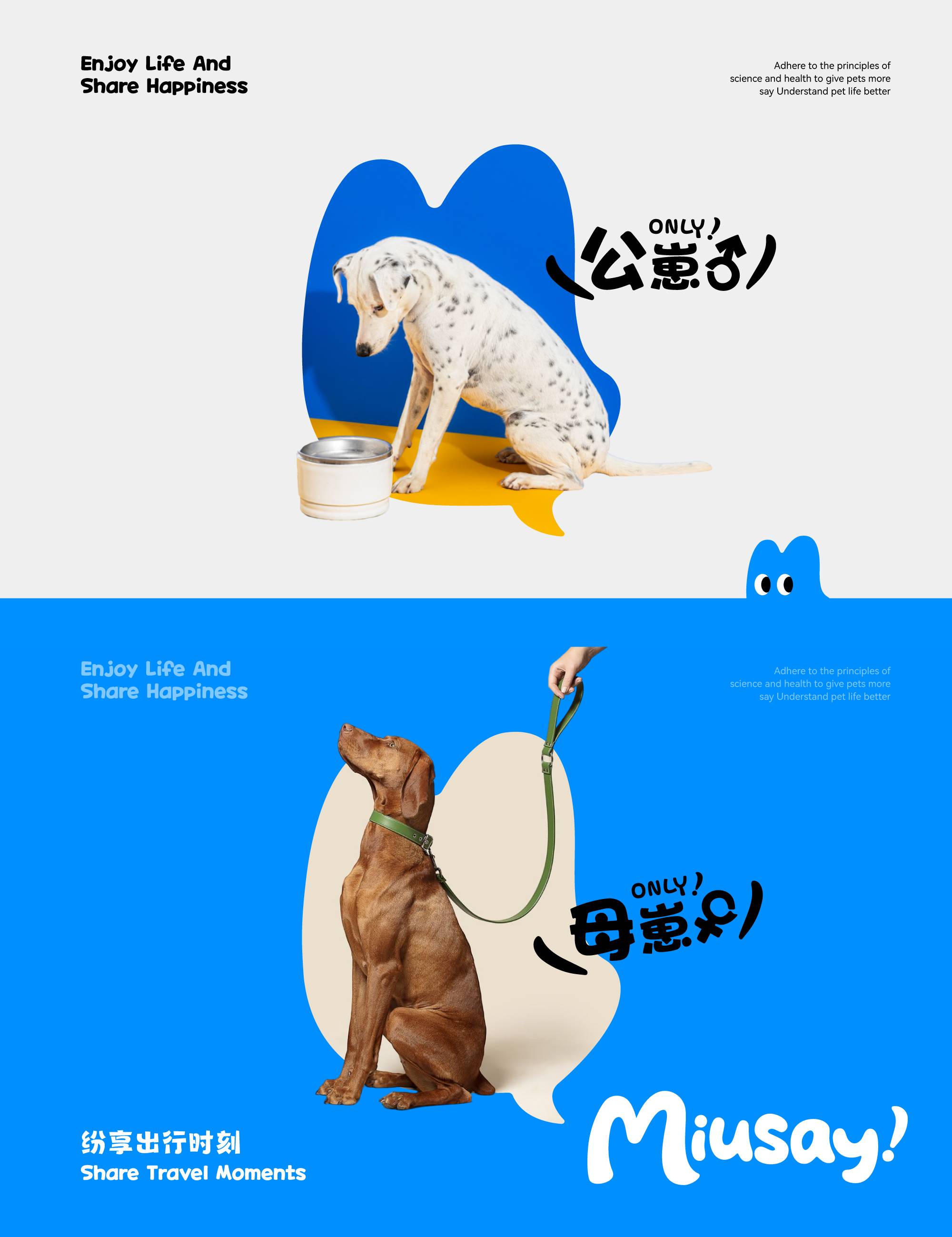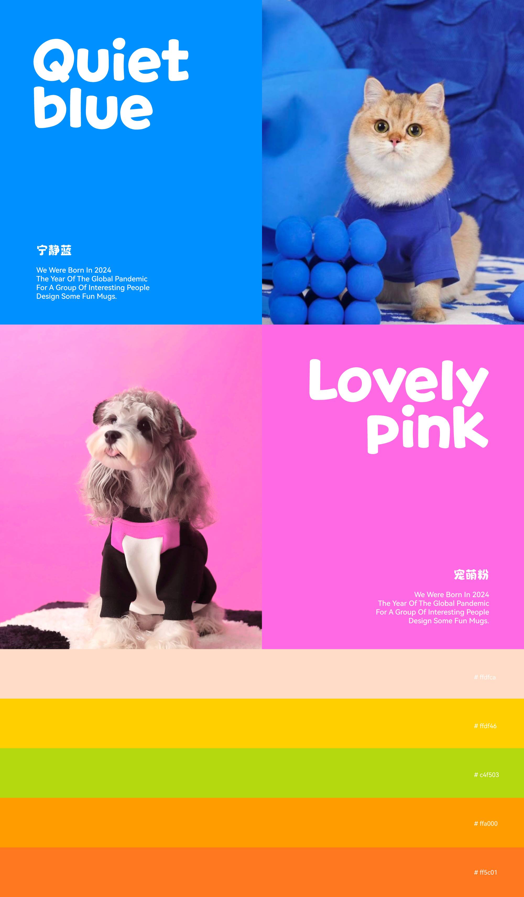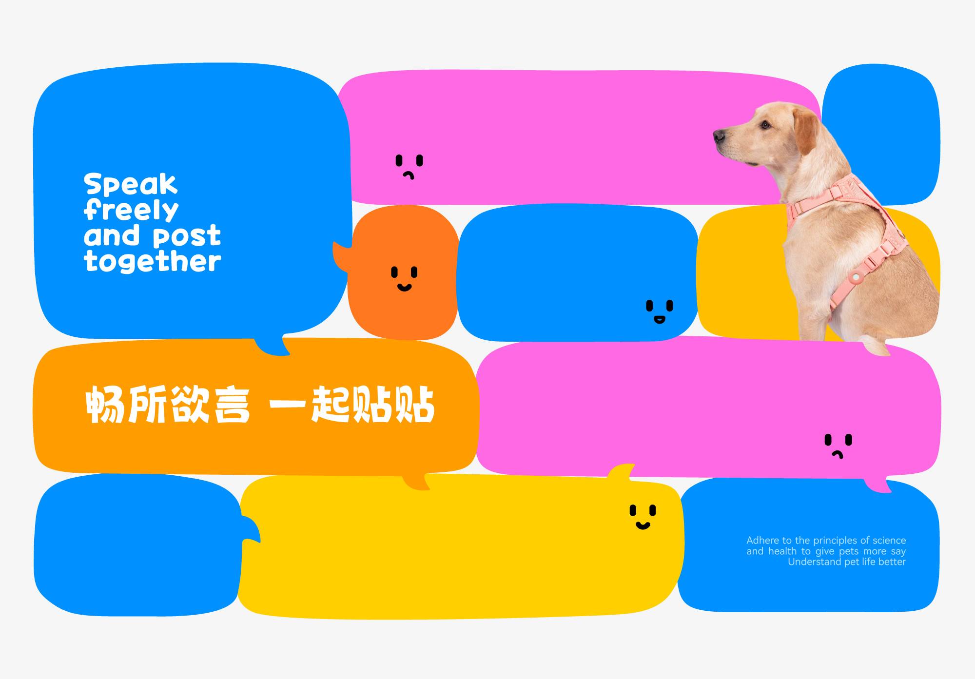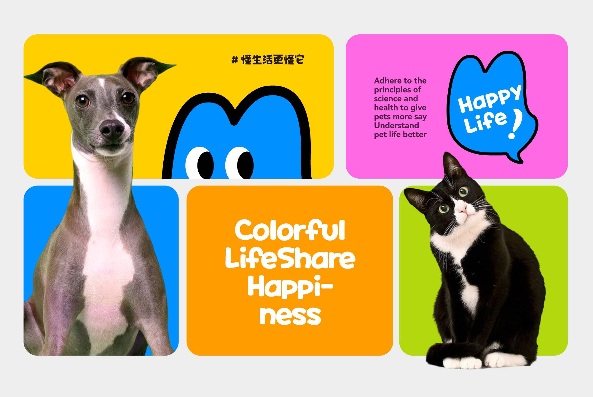 在色彩上,贯彻「缤纷」关键词,选取高饱和的蓝色与粉色作为主色。蓝色,呼应科学健康养宠的专业底色;粉色,精准捕捉「宠爱」的温暖特质,两者形成理性专业与感性温情的平衡。同时,辅以黄、绿、橙等活力色彩,将「纷享」的概念通过色彩氛围感应用到人与宠物共处的每一个场景。