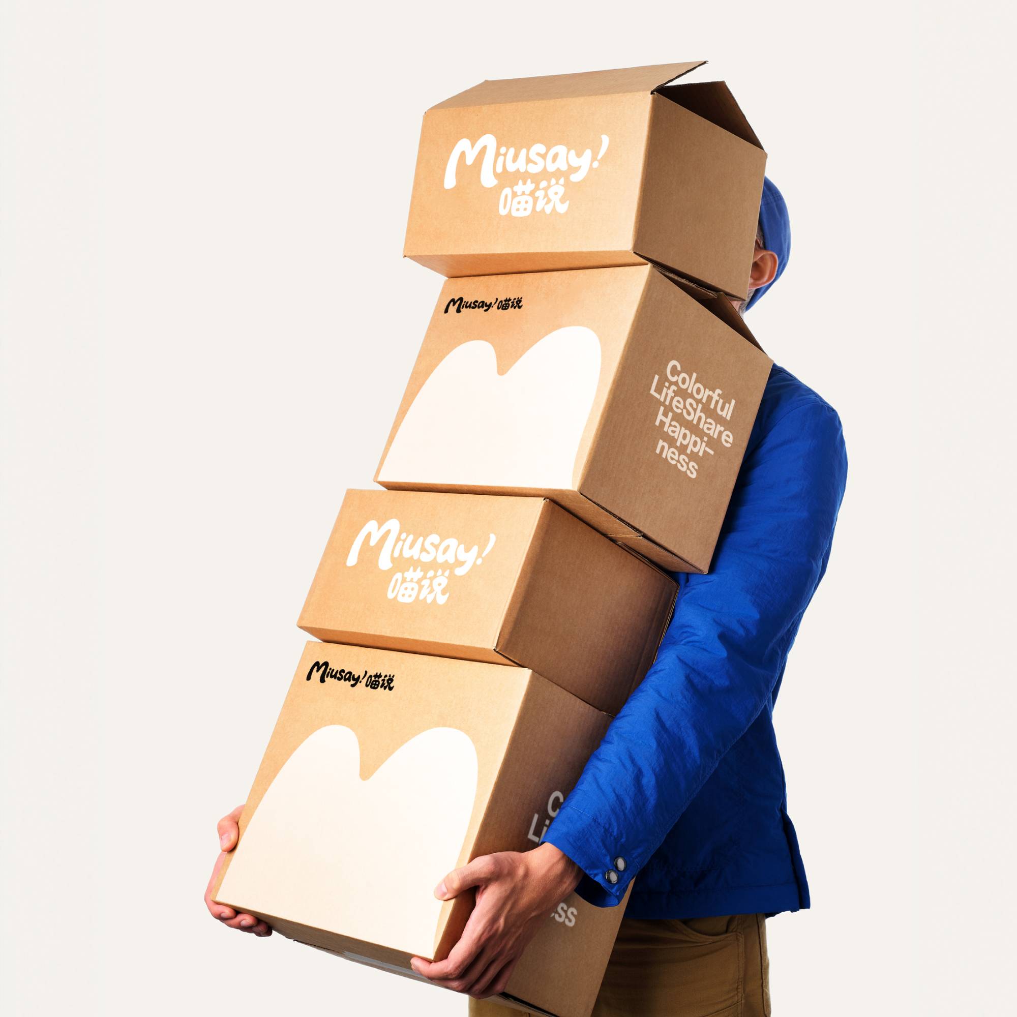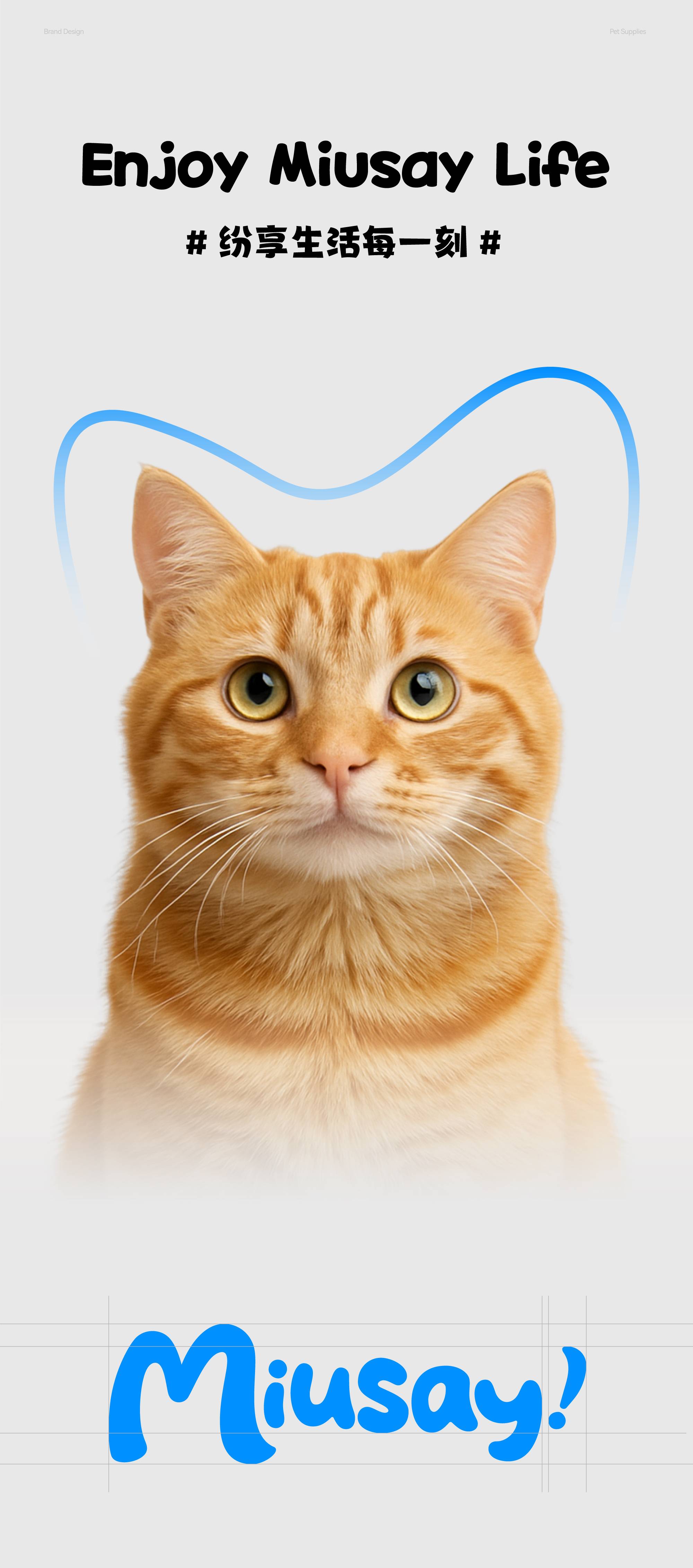 字体形态围绕猫咪特质设计:英文「Miusay」采用手写流体风格,笔画圆滑柔和,呼应猫咪的灵动特质,并将字母M融合猫咪耳朵形状,强化宠物品牌的趣味属性。中文「喵说」笔画做圆角处理,摒弃方正棱角,融入猫咪圆润的脸型,传递萌态与亲和力。