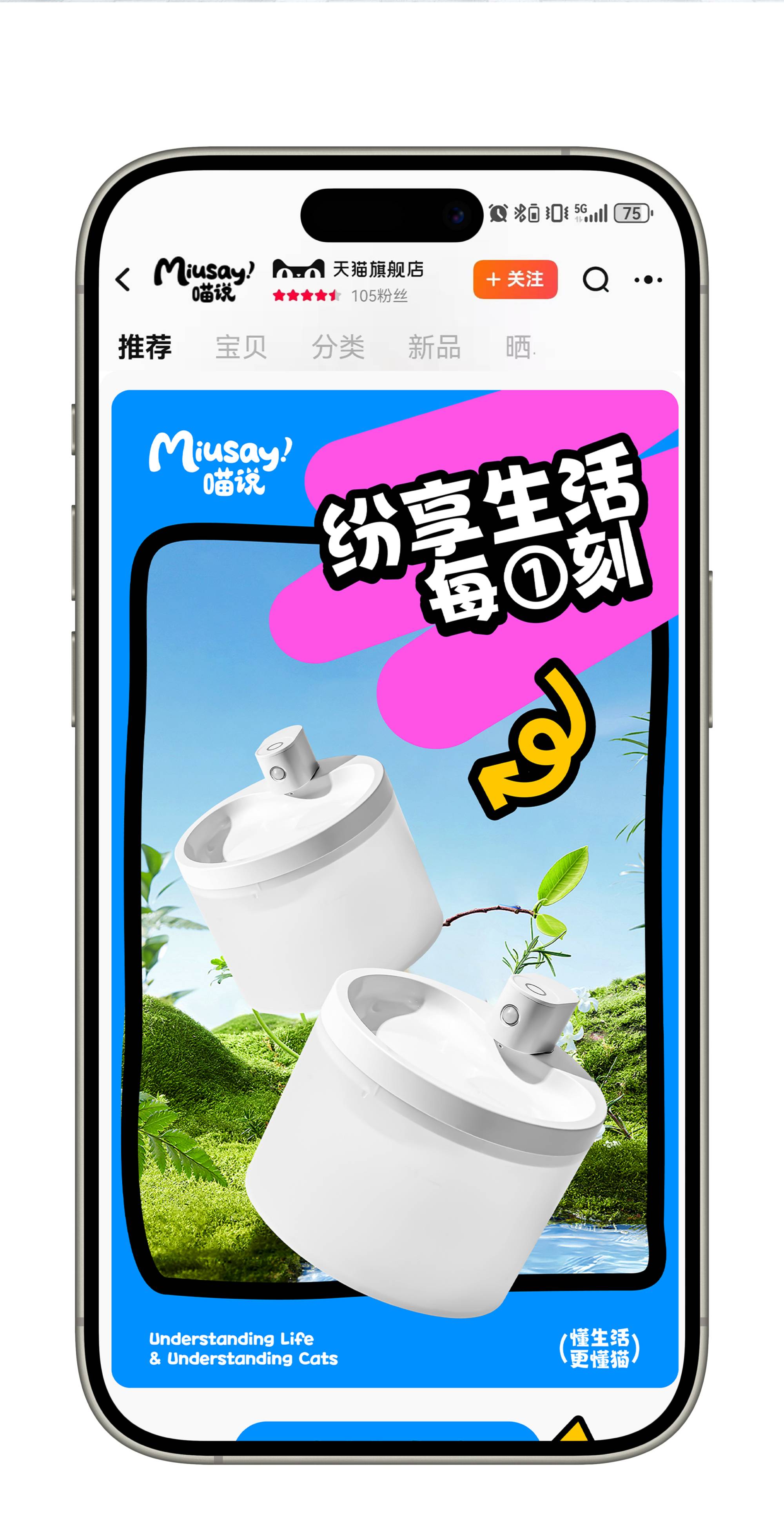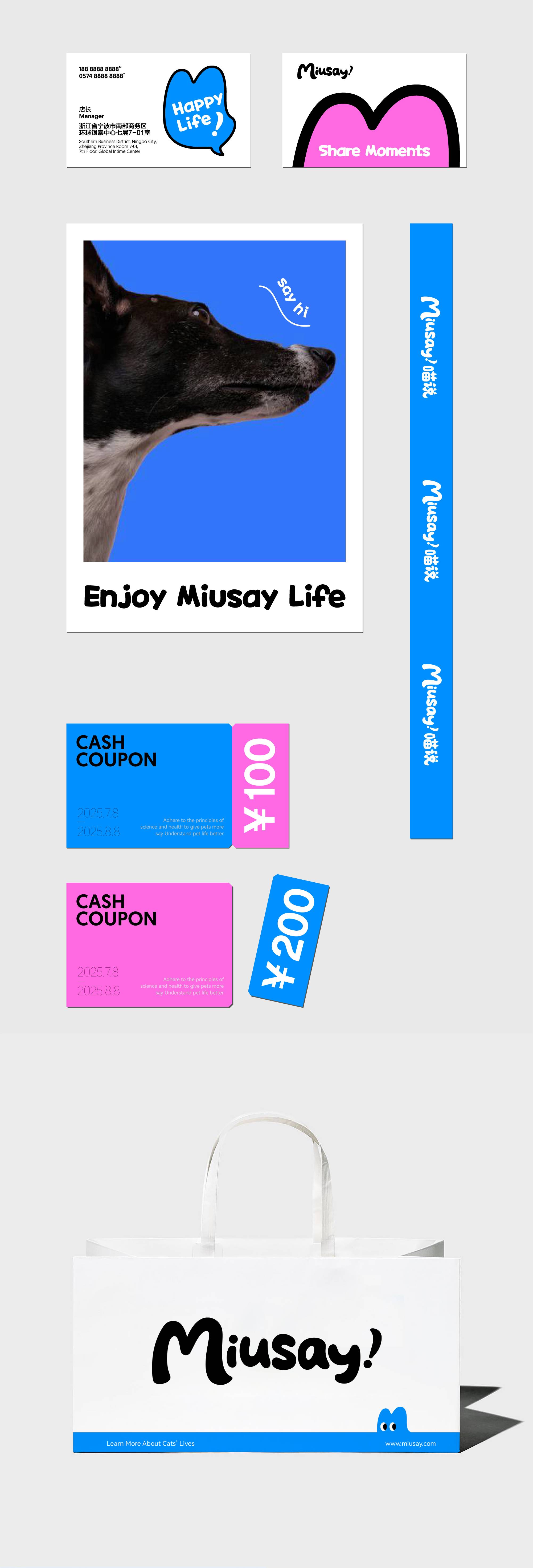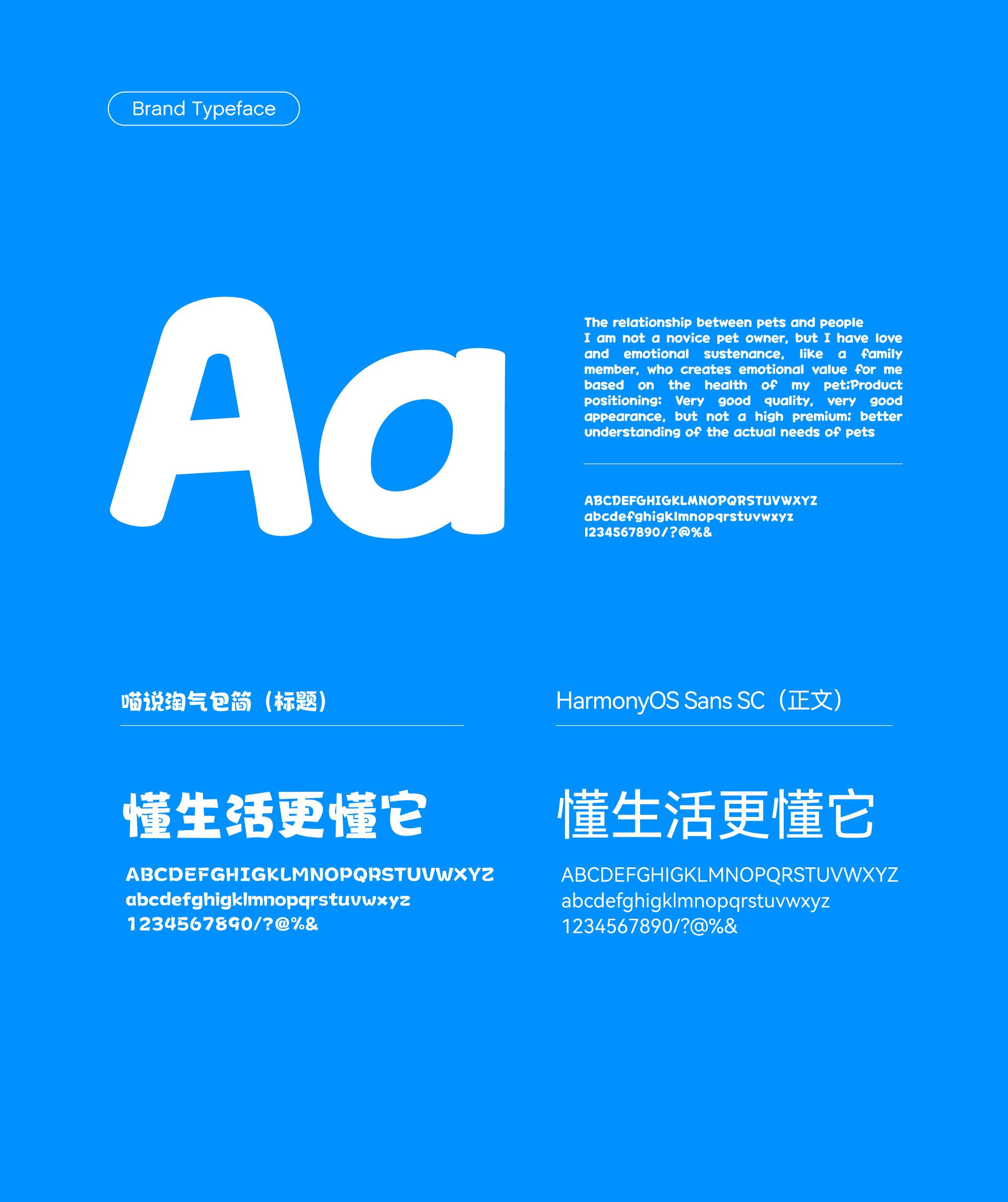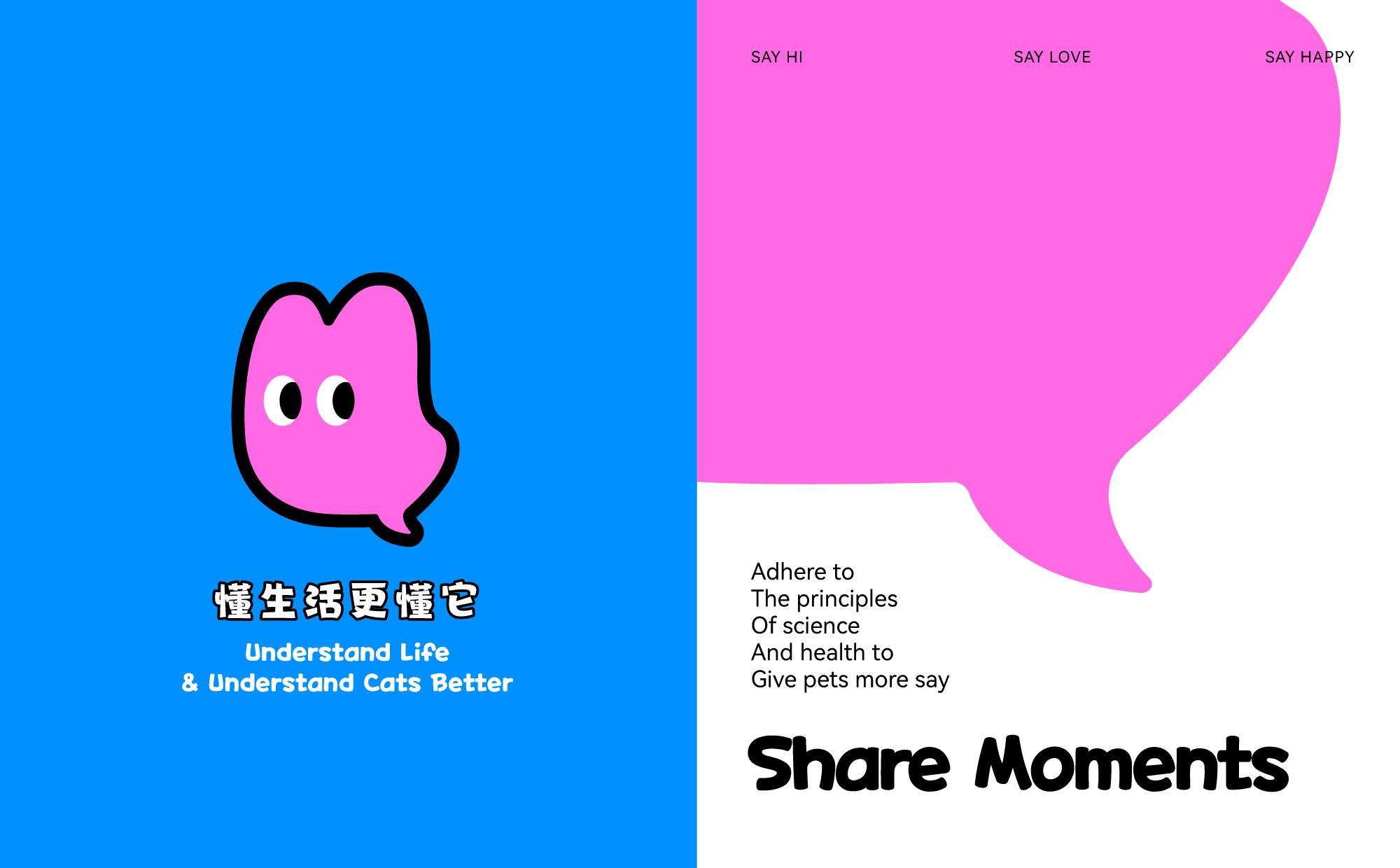 为此,我们以「悦己」为精神内核,通过「纷享生活每一刻」的宣言,将品牌定位为「人宠生活纷享家」——不止满足宠物需求,更致力于激活人宠互动中的情感共享与生活美感。从视觉、设计、营销多维度构建「纷享」符号化资产,让喵说成为人宠共融生活的具象符号。