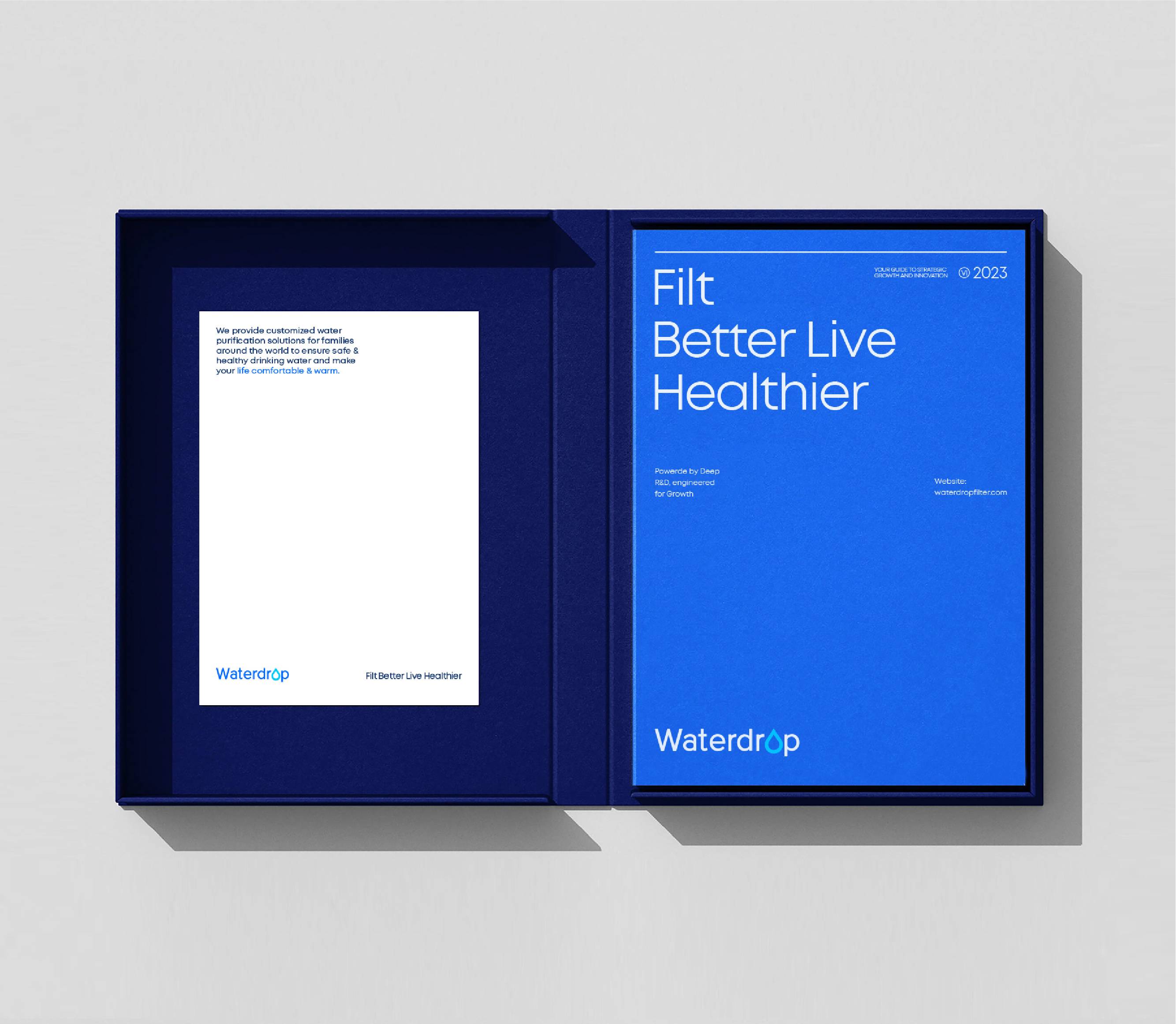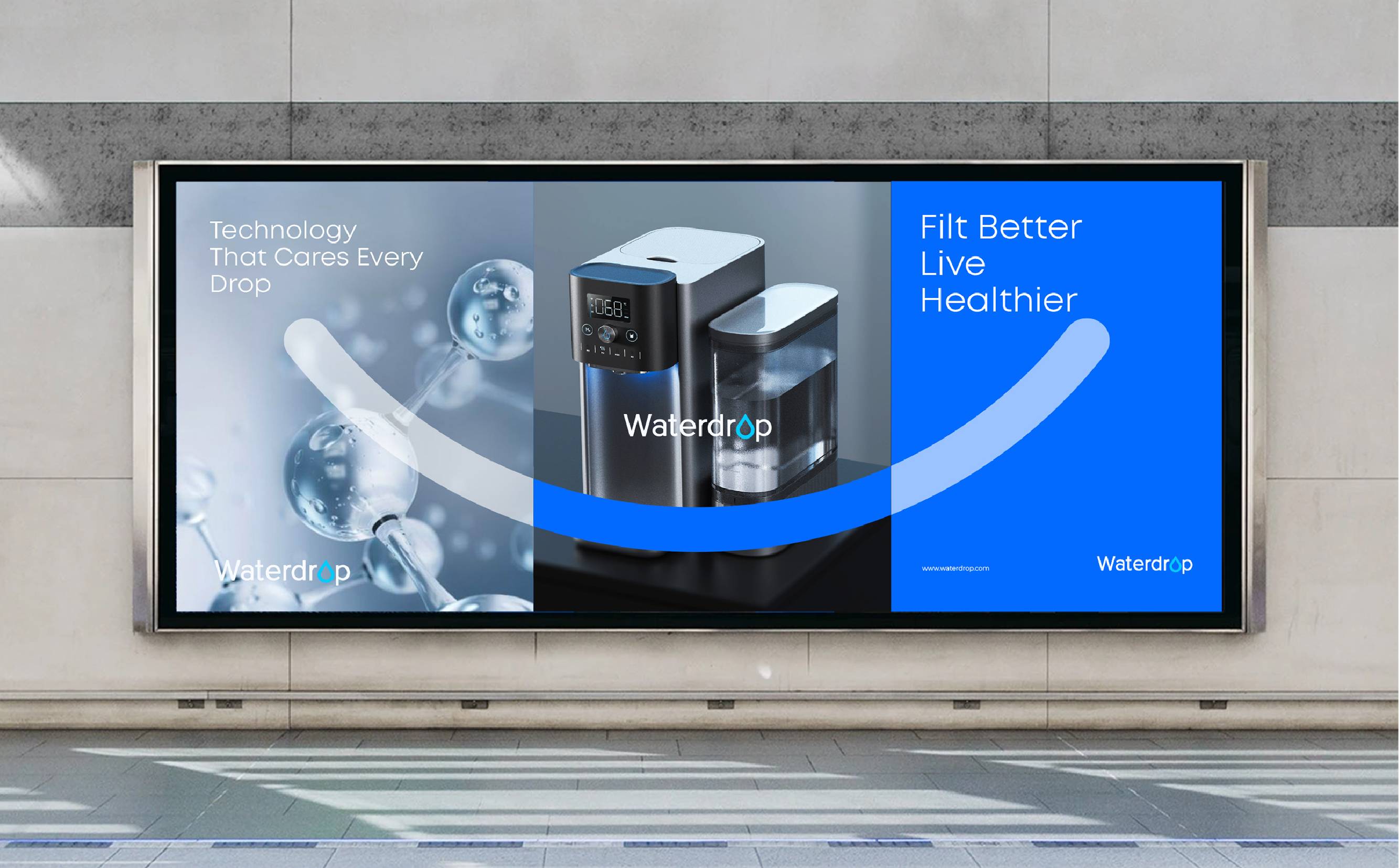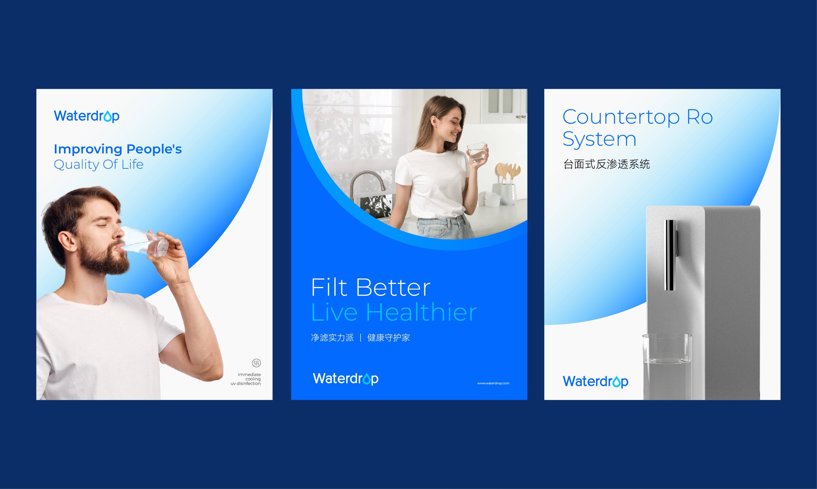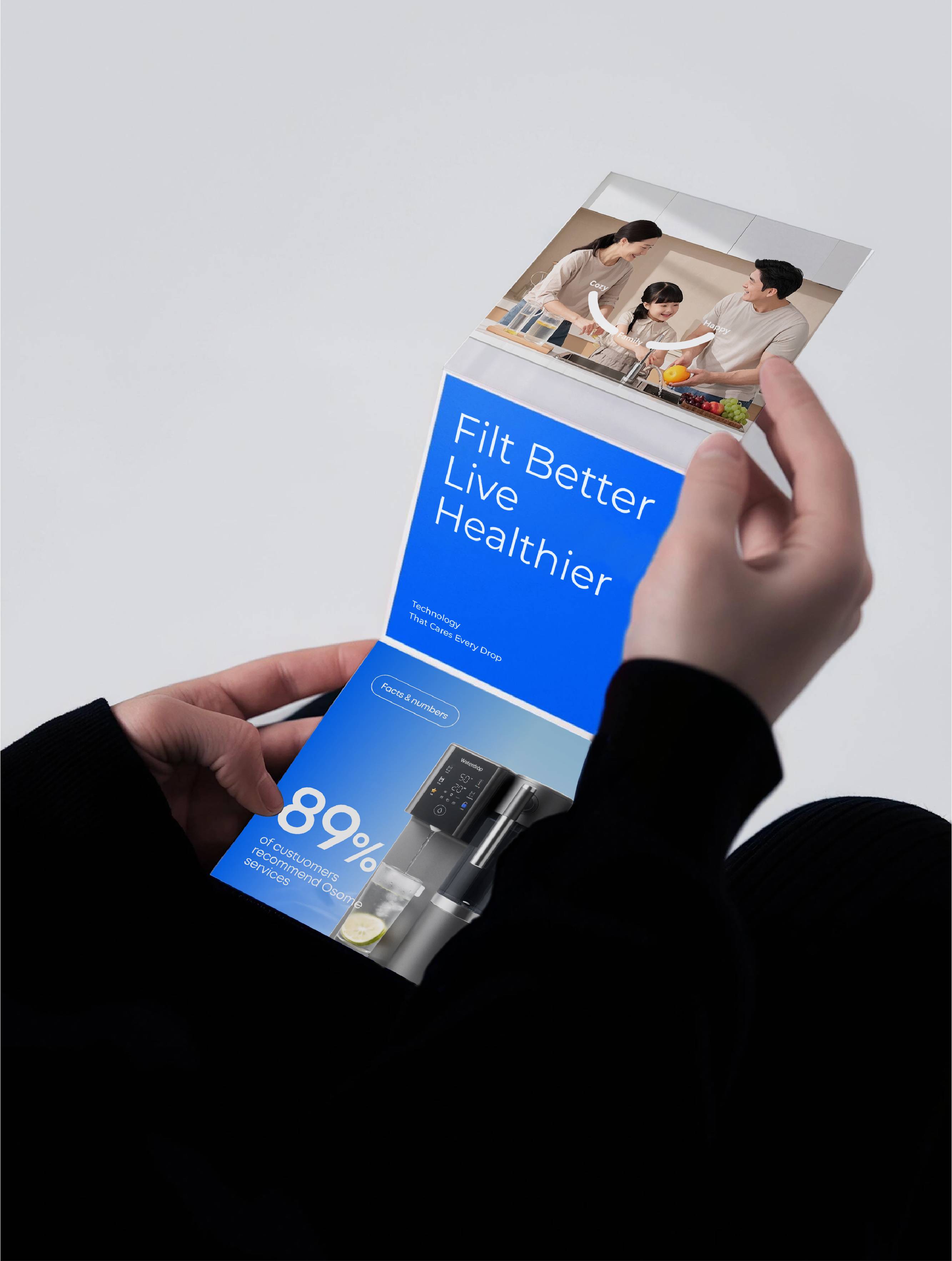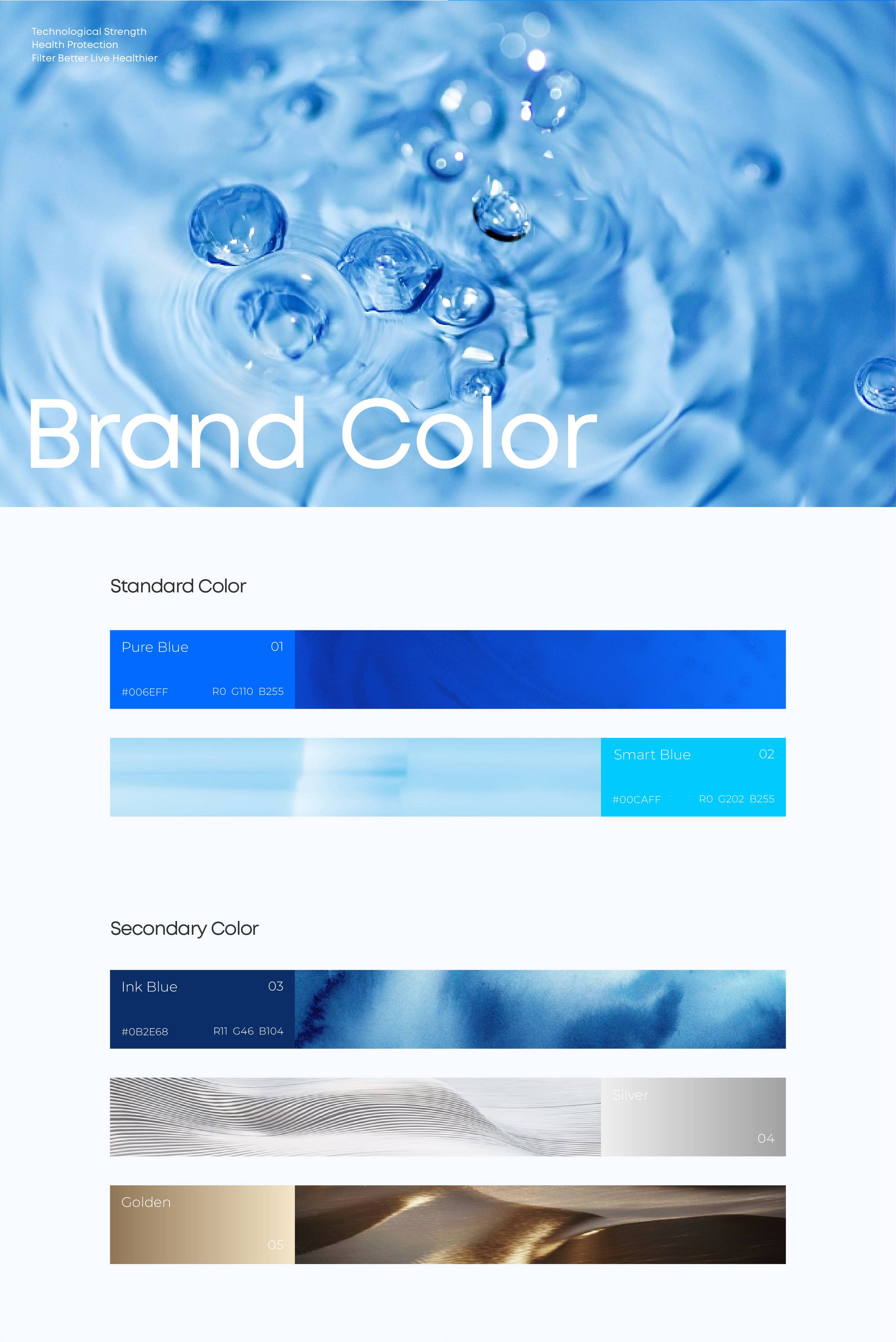 色彩紧扣“科技驱动专业净水”的核心定位,构建蓝色视觉体系。蓝色天然关联“水的纯净”与“科技的理性”,成为品牌的核心色彩:纯净蓝呼应净水本质与专业科技实力;智能蓝则轻盈跃动,注入年轻创新力,二者结合,传递“科技为生活服务”的温度。以墨蓝与金属色为辅助色,丰富视觉层次的同时,从“专业沉淀”到“高端体验”全方位支撑品牌形象。