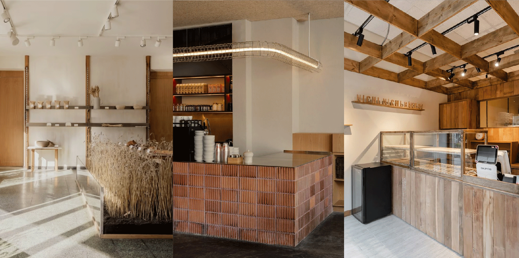 店铺以自然主义美学为设计理念,将食材本真与沉浸式体验深度绑定,构建起质朴而治愈的感官场域。步入店内,左侧以老木板为底,堆叠起木框与柴垛,唤起对传统烘焙温度的联想。