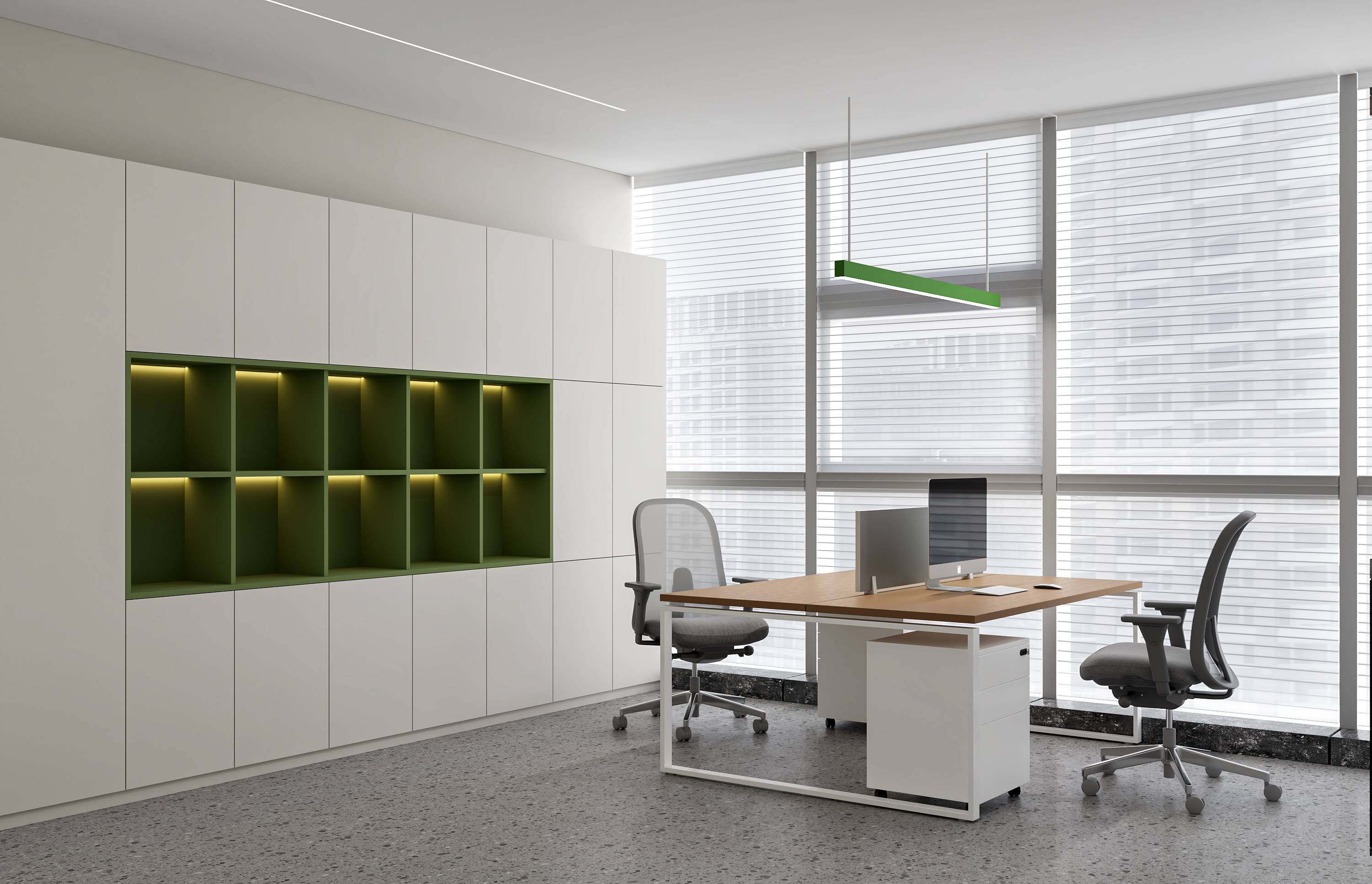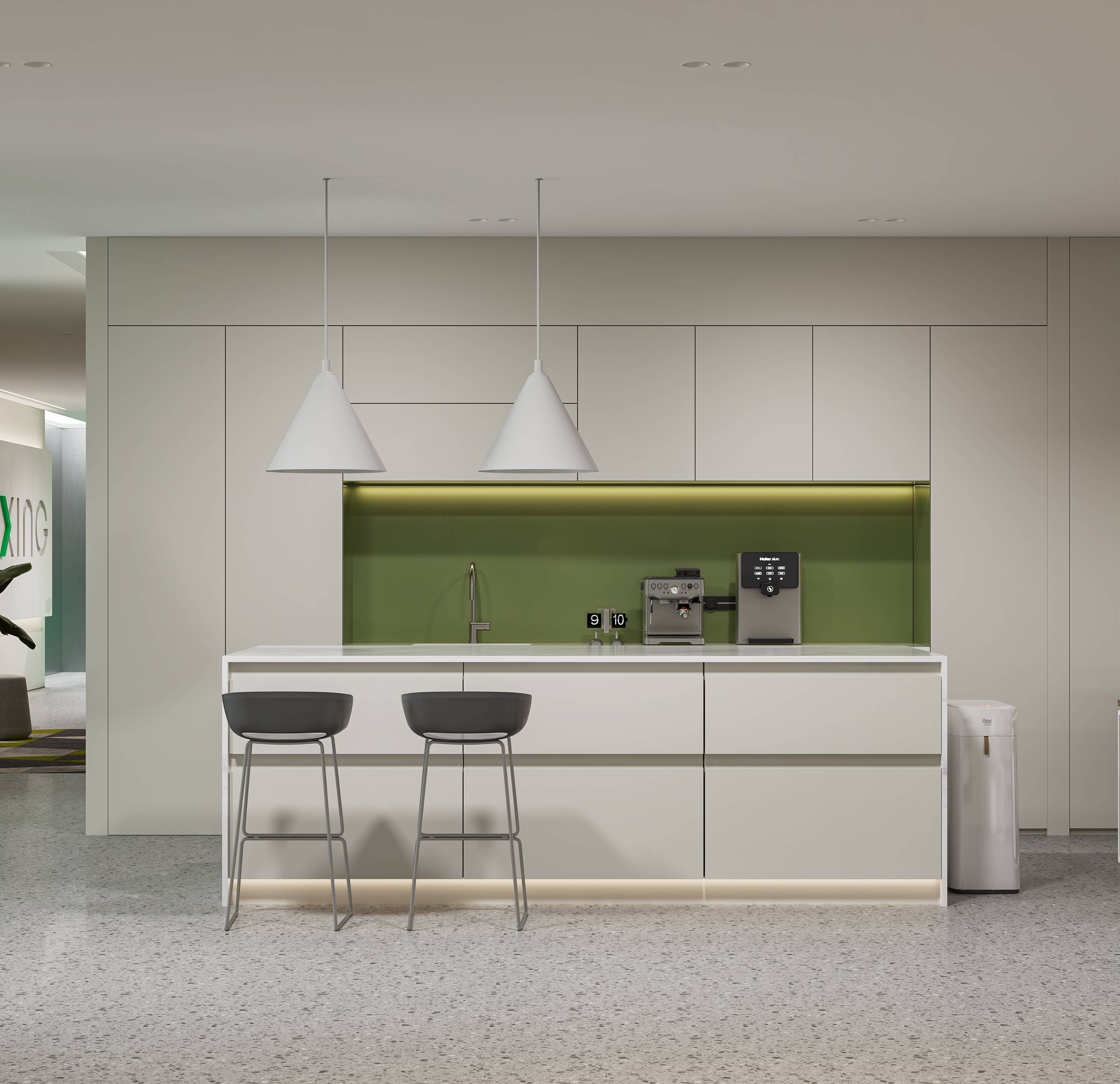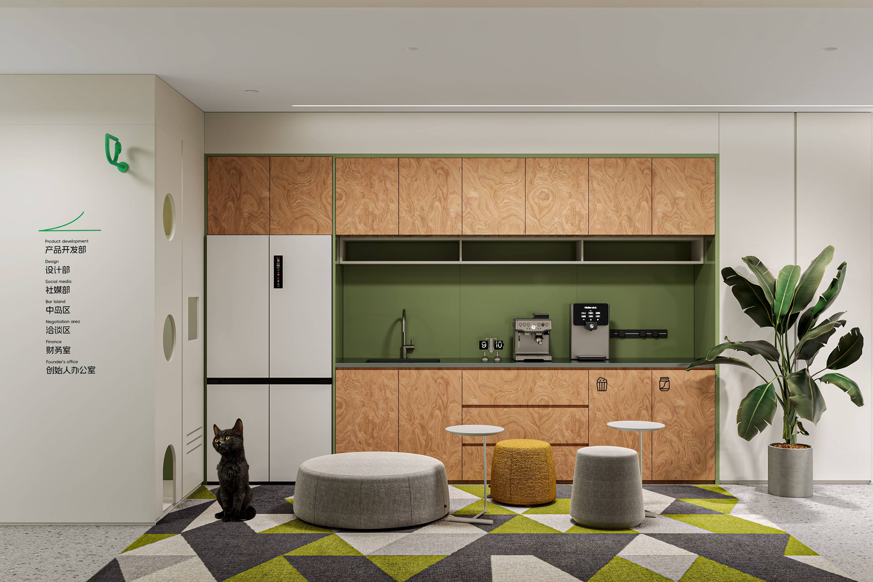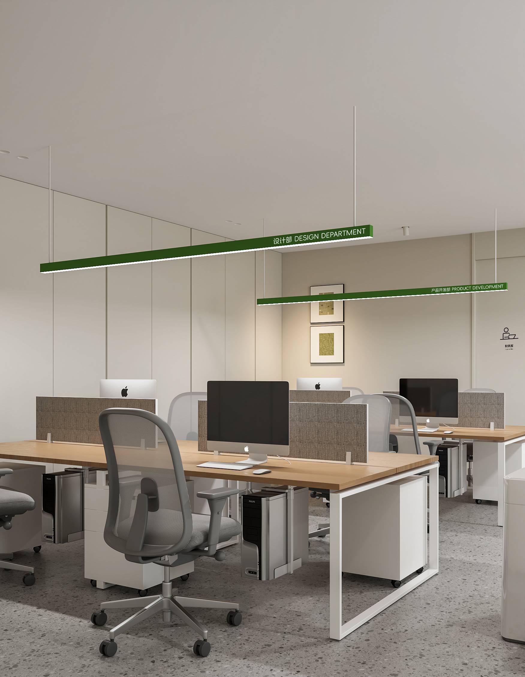 左侧办公区空间设计以简约为基调,通过有序布局与色彩点缀,打造高效且充满活力的工作环境。悬挂的绿色部门标识灯具,以鲜明色彩打破空间单调,注入活力元素,同时清晰划分功能区域,增强空间指引性。
