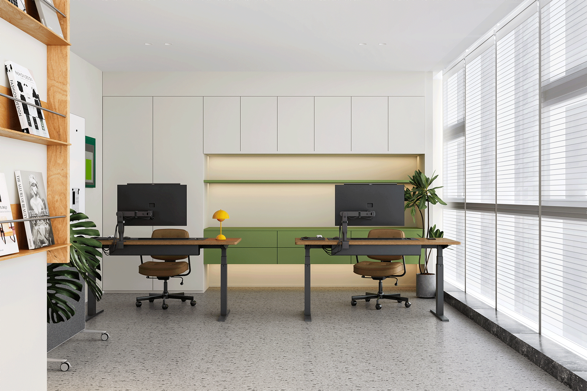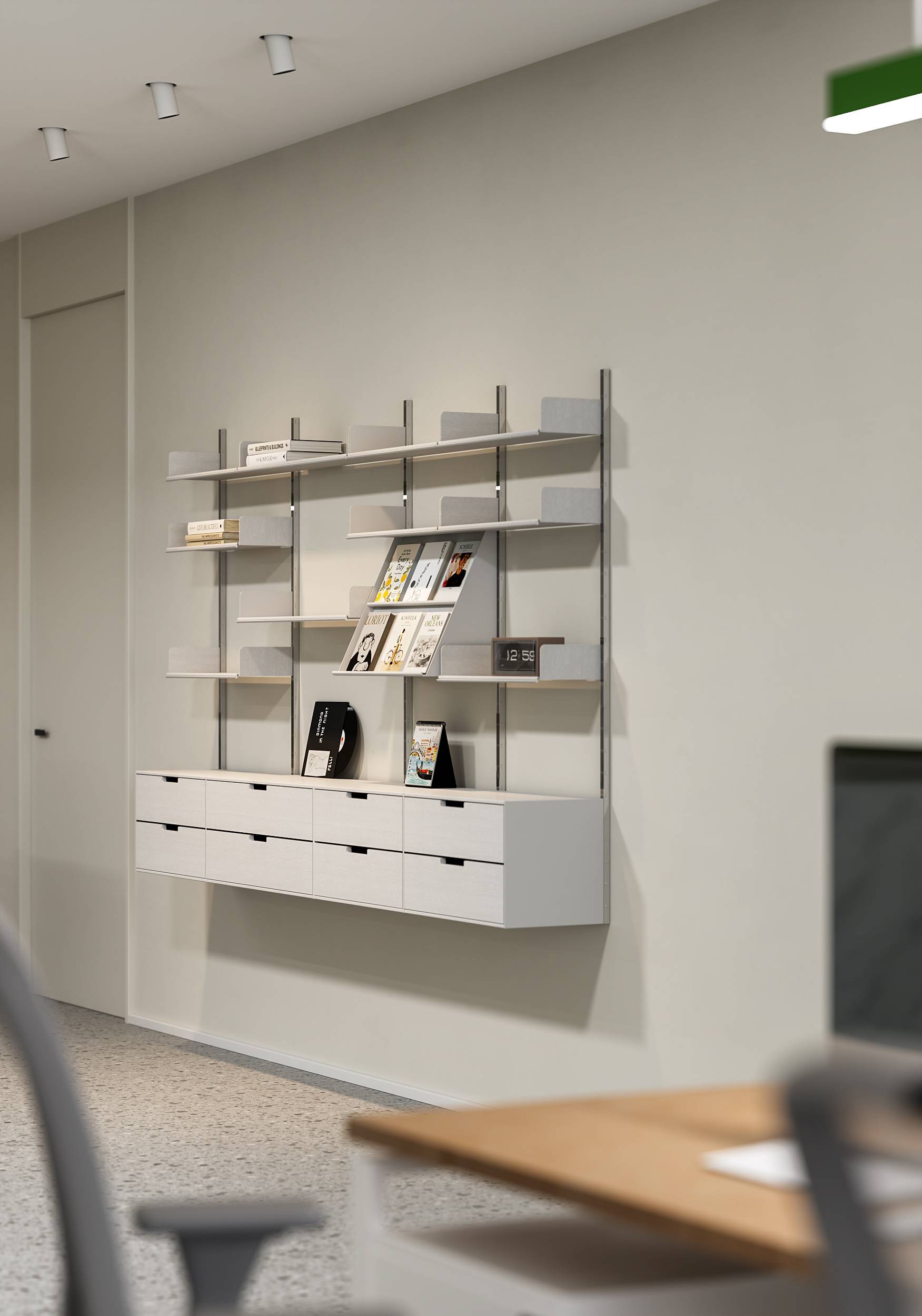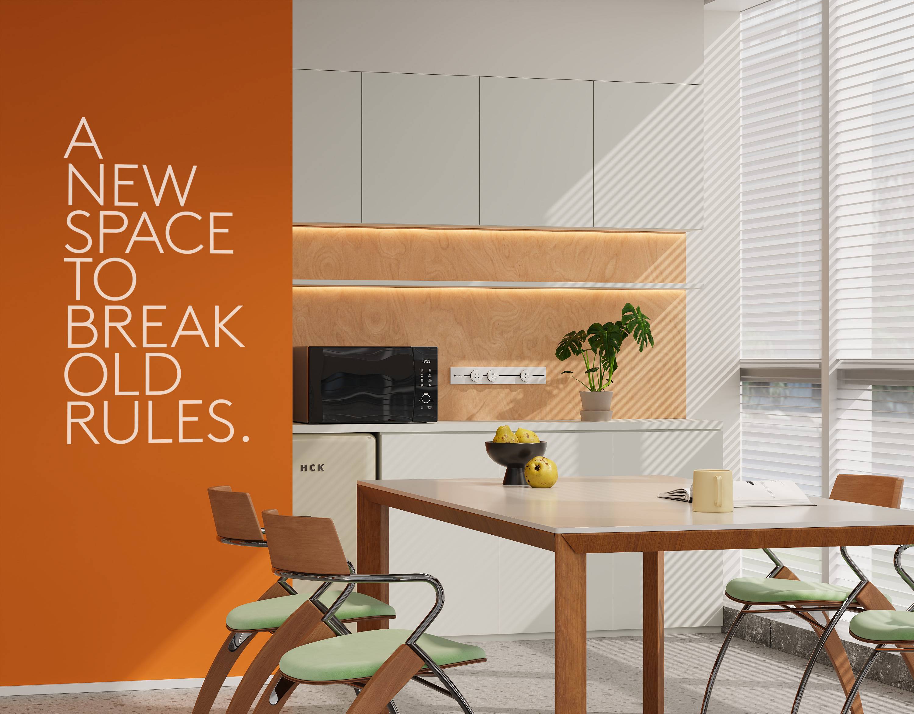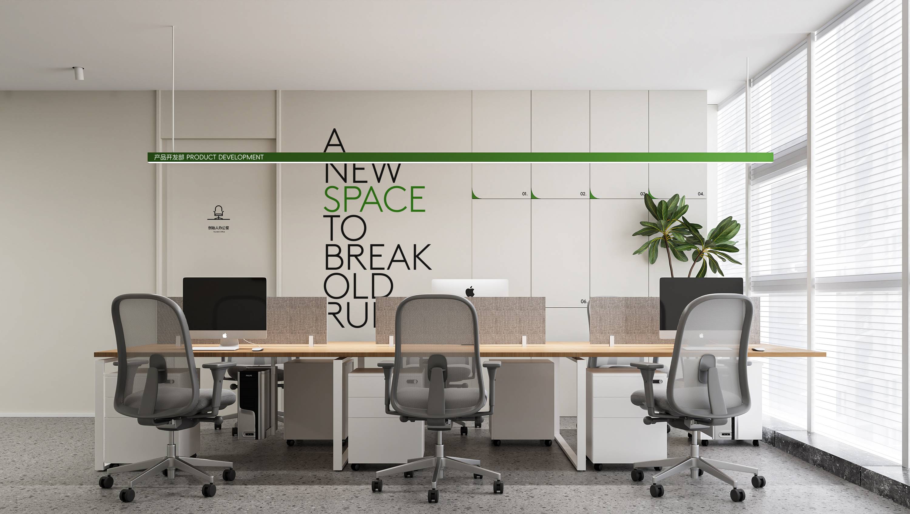 在色彩上,以米白色为底色,干净而温和,营造轻松舒适的办公环境。品牌专属的绿与橙作为点睛色,在明度对比中构建层次分明的视觉重心,既保持现代办公的专业调性,又传递出企业创新基因中的活力意象。
