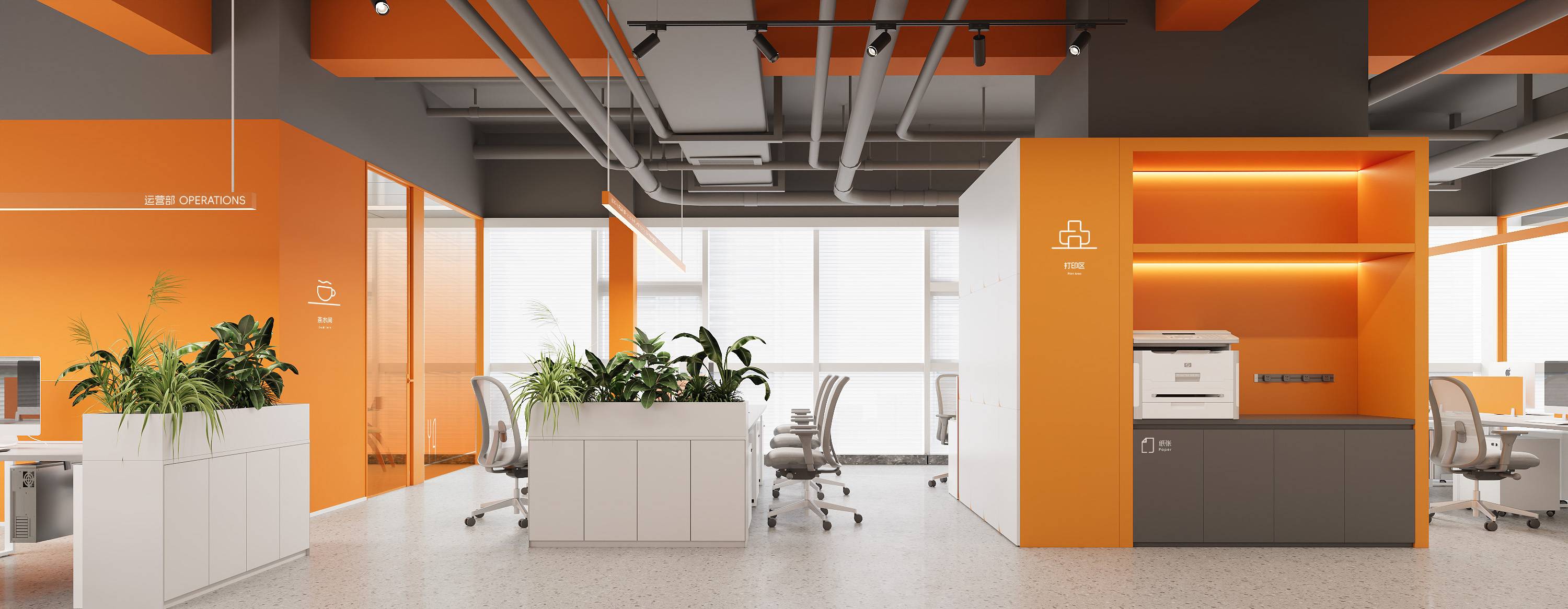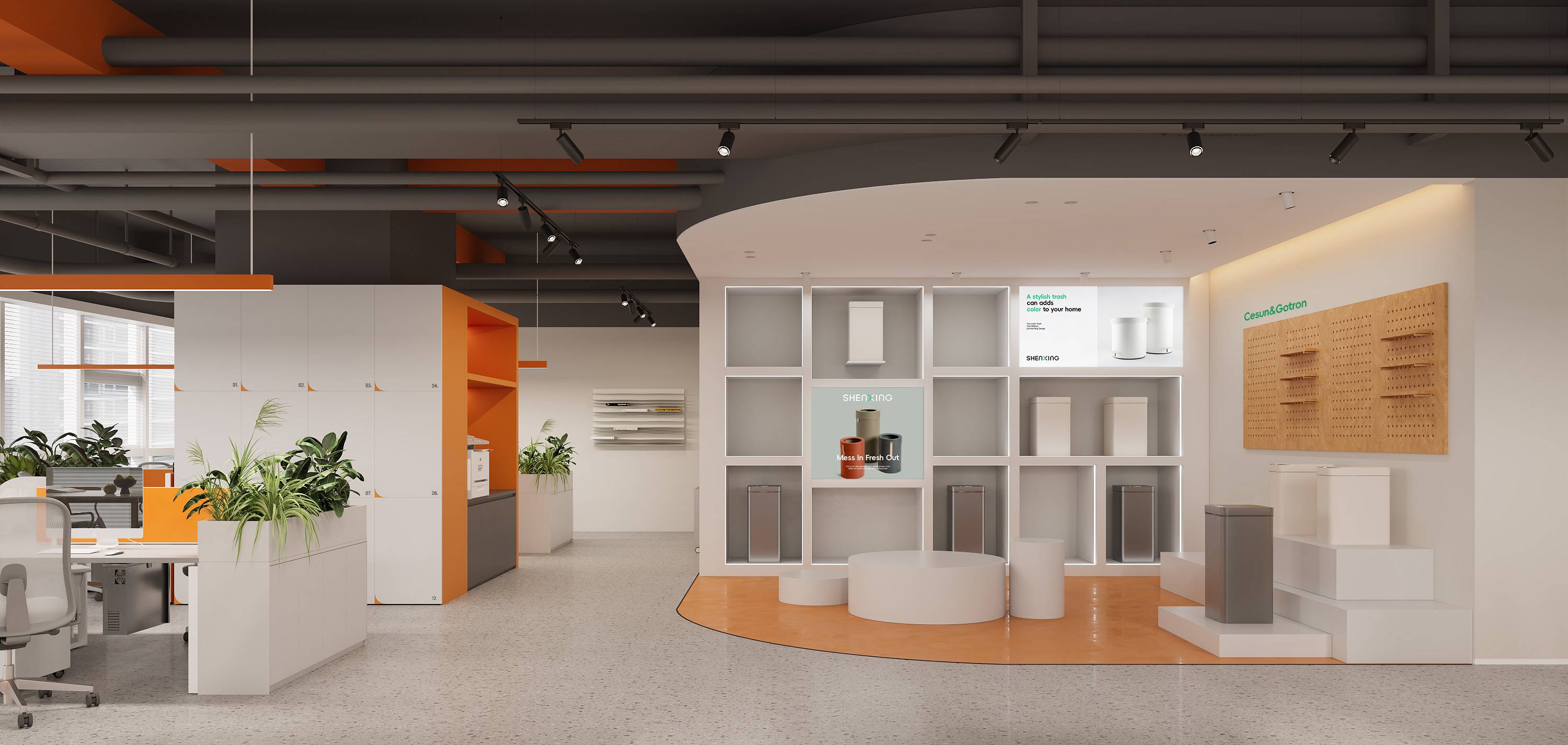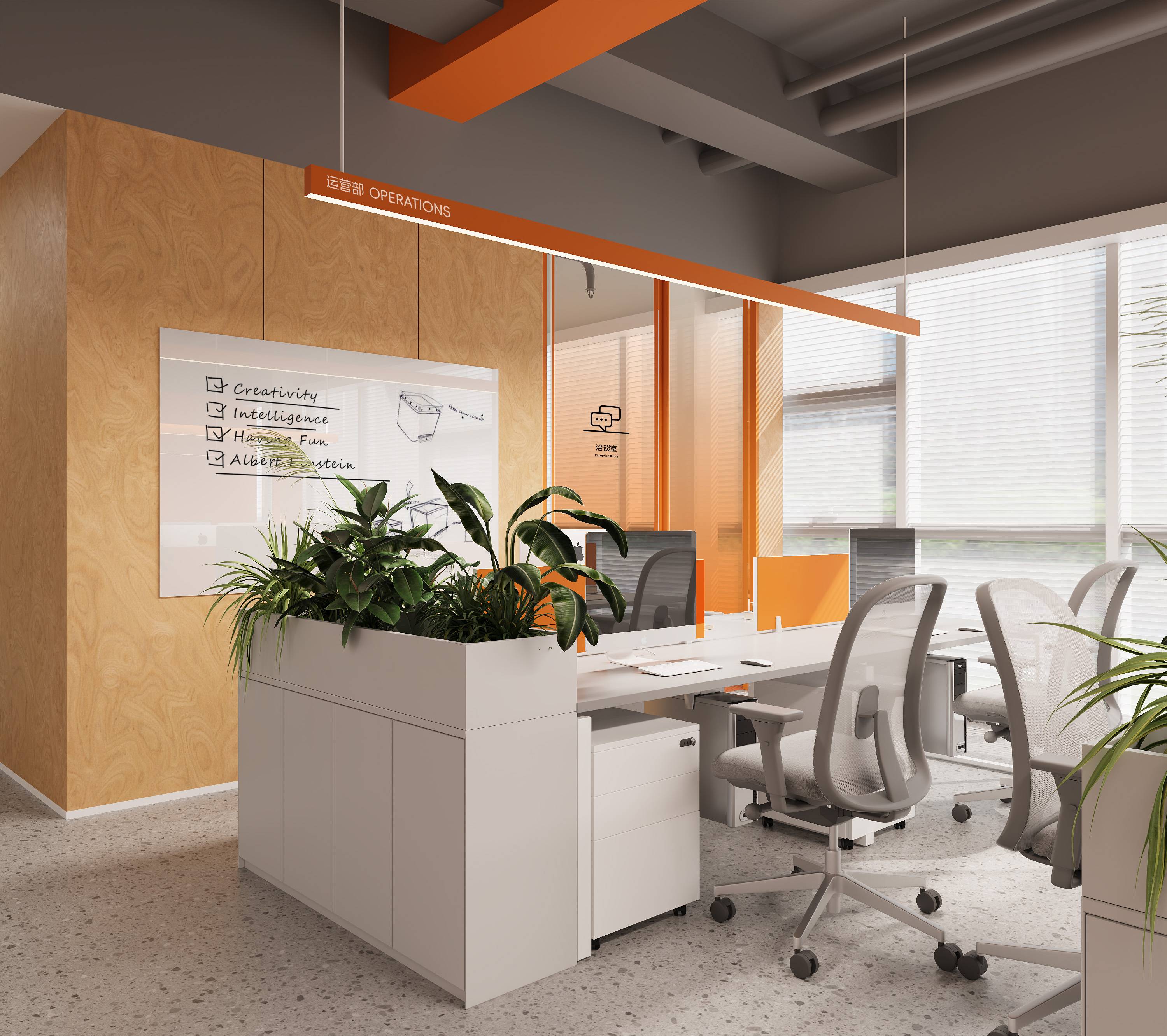 右侧办公空间以鲜明的橙色为主色调进行点缀,搭配白色、木色等基础色调,营造出活泼且专业的氛围。开放式的办公区域内,利用绿植巧妙分隔空间,既保证工作的专注性,又增添自然生机。