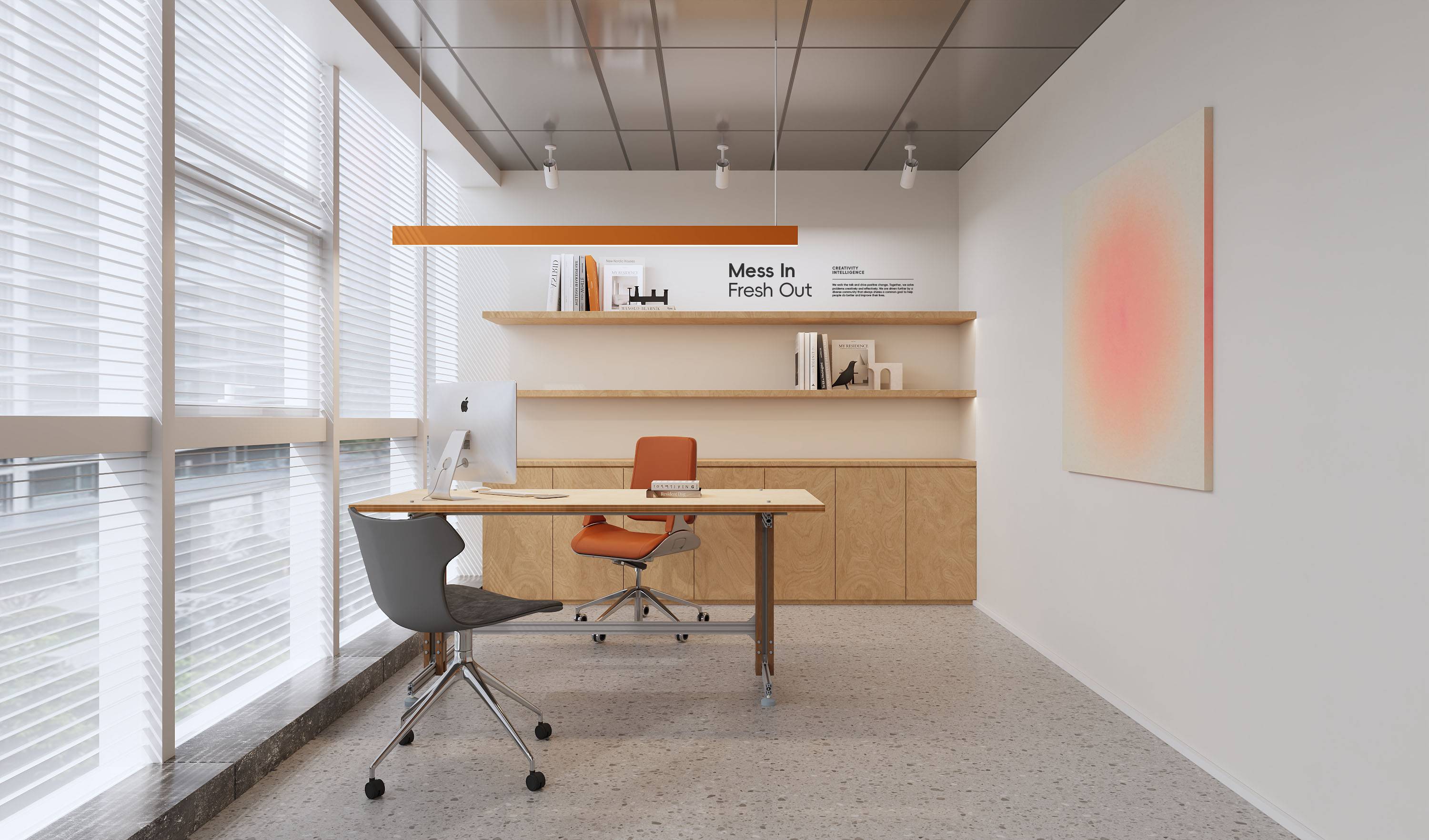 创始人办公室是一个兼具专业感与创意氛围的空间。开放式布局融合办公与休憩区域,大窗户引入充沛自然光,配合几株绿植,打造通透有序的工作场所。海洋板的融入增添自然温度,与简洁的线条、规整的柜体形成质感对话,传递出主理人沉稳而不失灵动的气质。