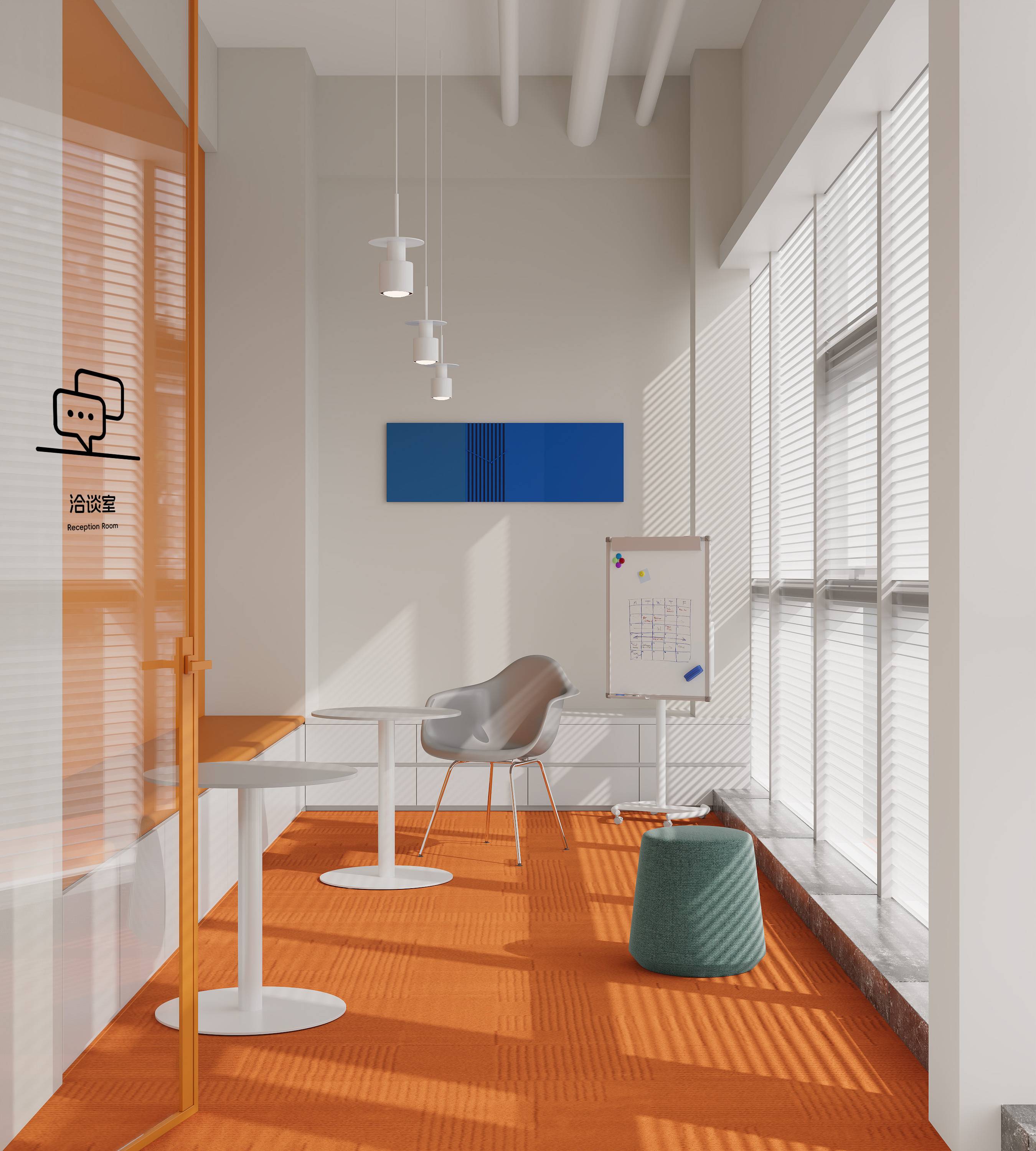 洽谈室地面采用橙色铺设,搭配白色桌椅与蓝色玻璃,营造出轻松且具设计感的交流环境。另设有用餐区,兼具实用性与休闲感,成为员工放松互动的温馨角落,尽显年轻活力与家居化的舒适体验。