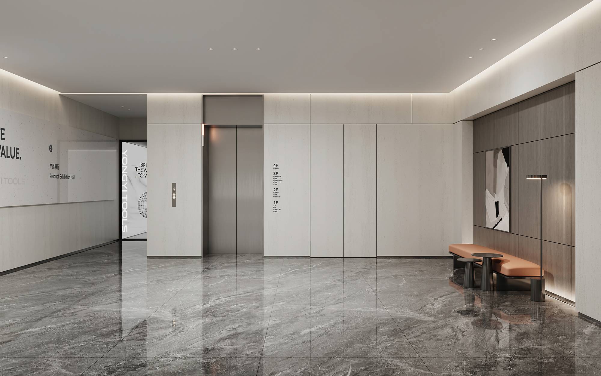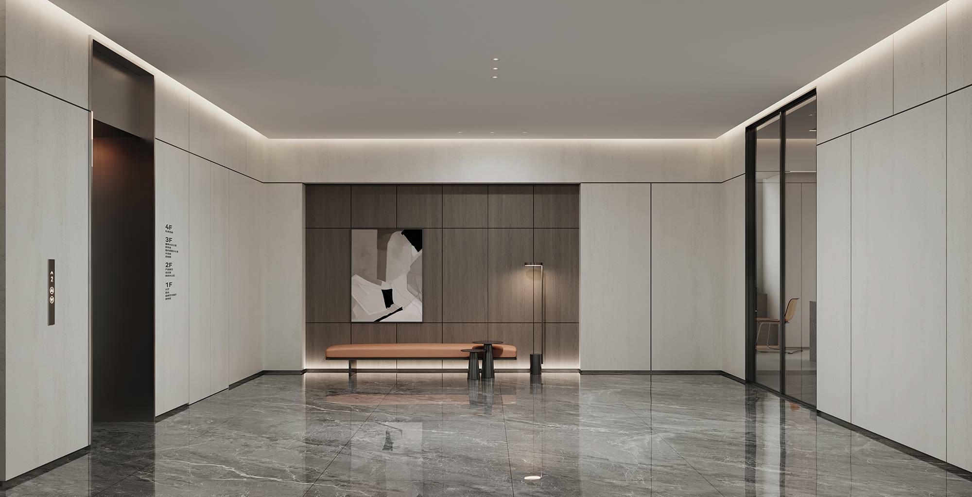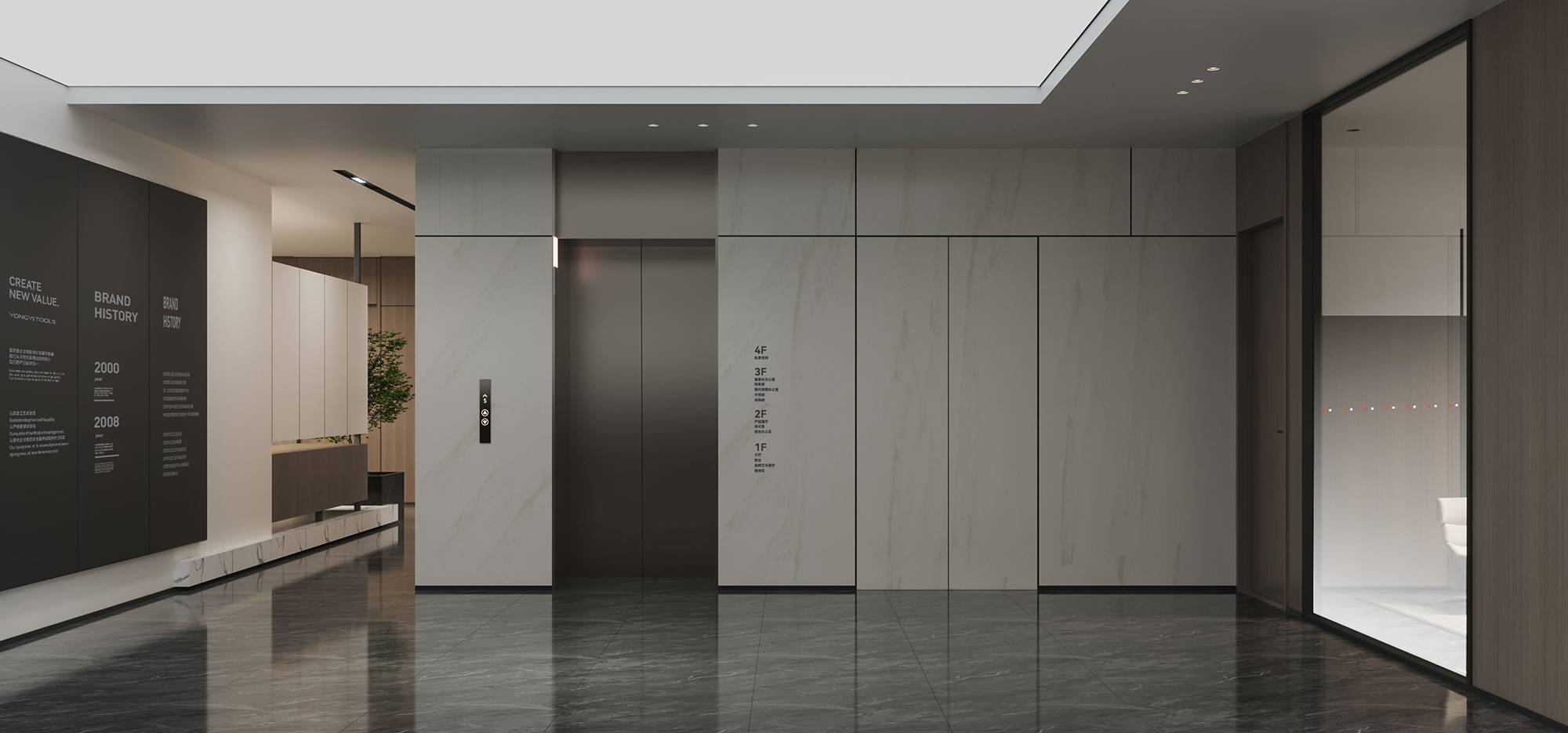 到达三层,从电梯走出,对比二层整体更显沉稳。三层电梯厅以灰色石材与黑色烤漆营造厚重感,并加入了企业软膜灯箱和文化墙,呈现一个具有人文气息的科技商务感空间。