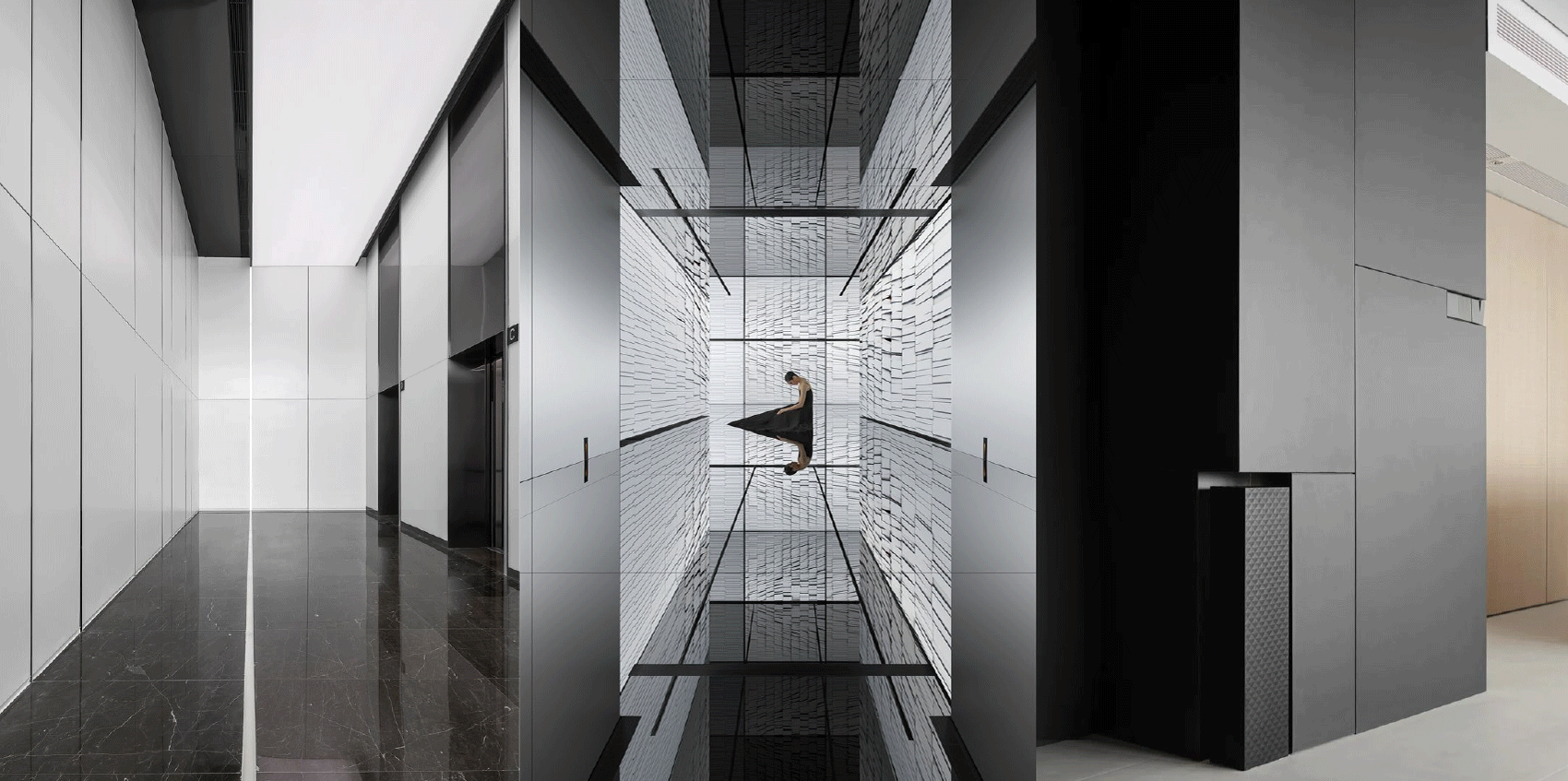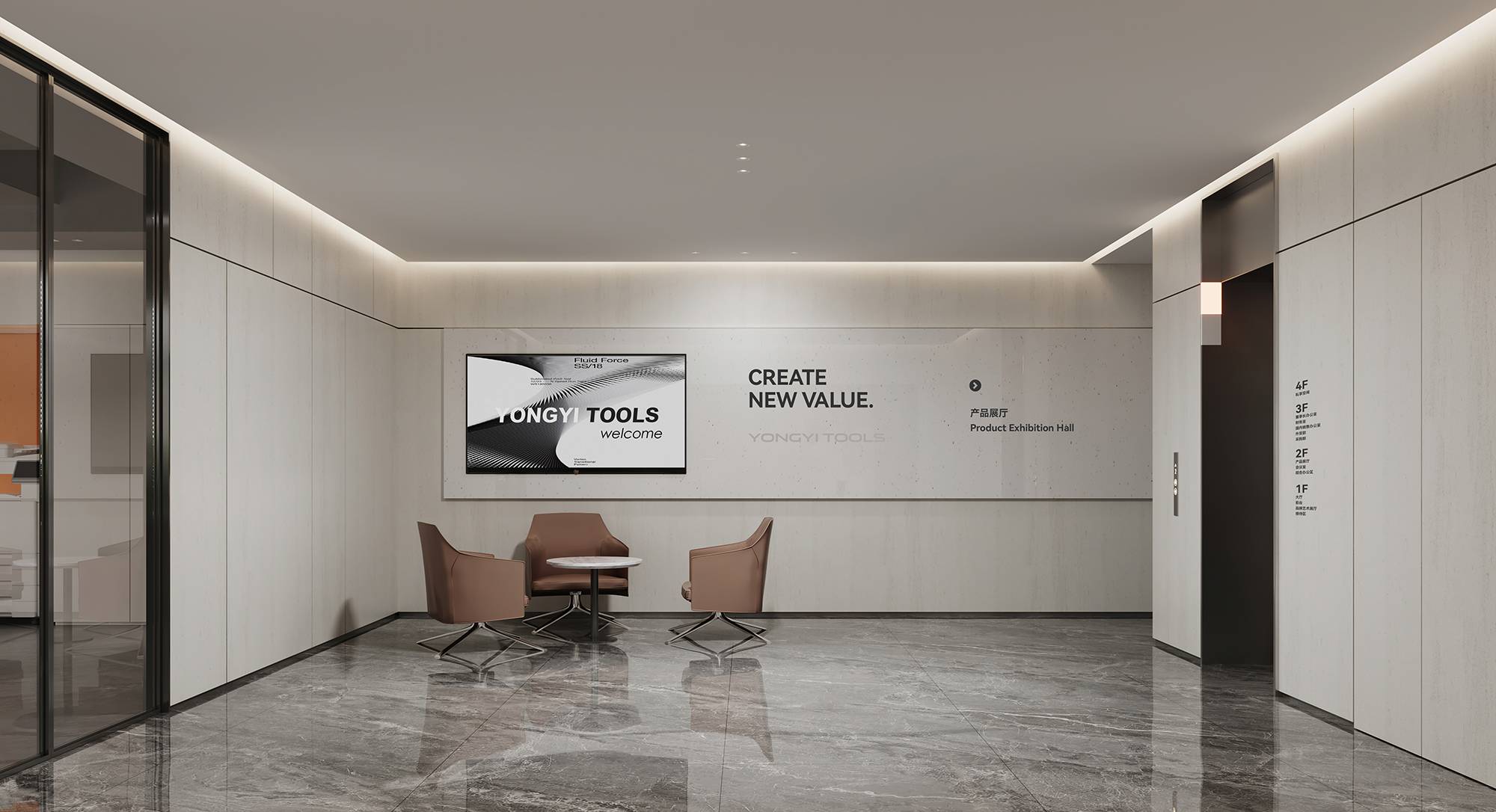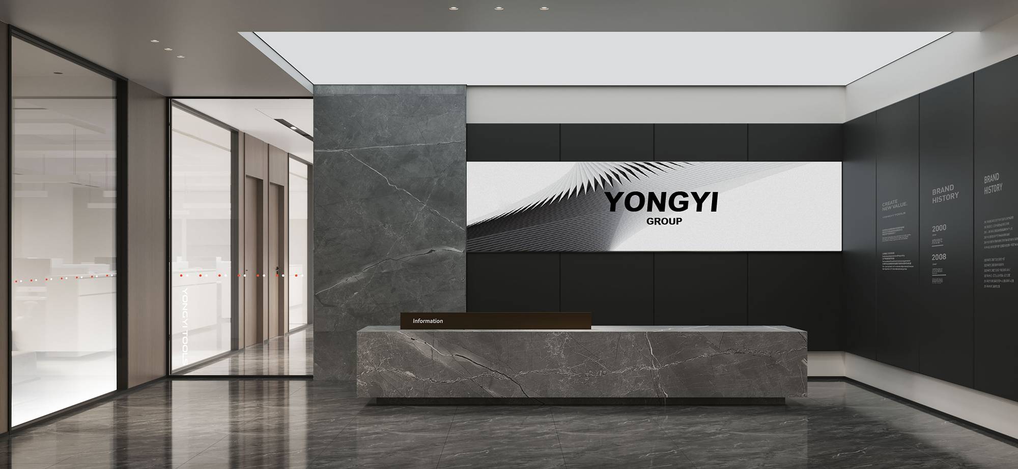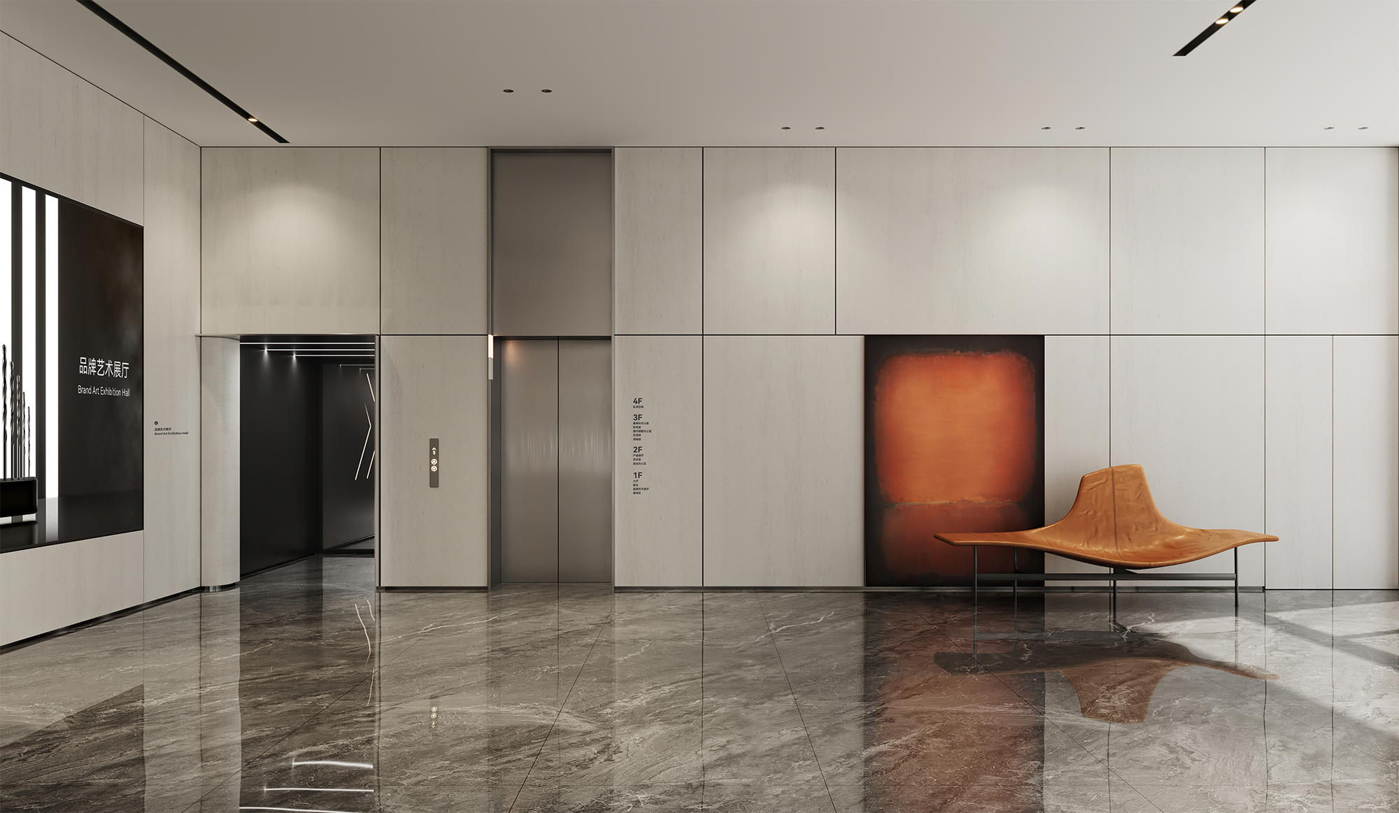 到达三层,从电梯走出,对比二层整体更显沉稳。三层电梯厅以灰色石材与黑色烤漆营造厚重感,并加入了企业软膜灯箱和文化墙,呈现一个具有人文气息的科技商务感空间。
