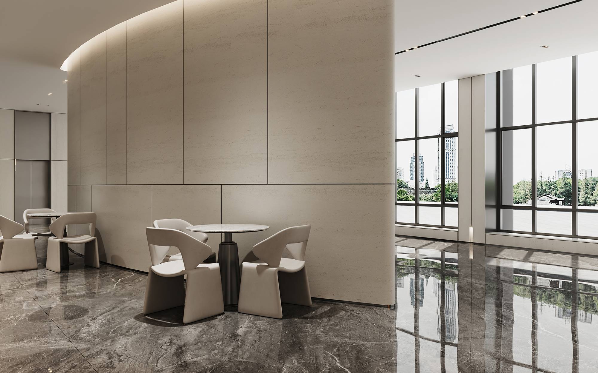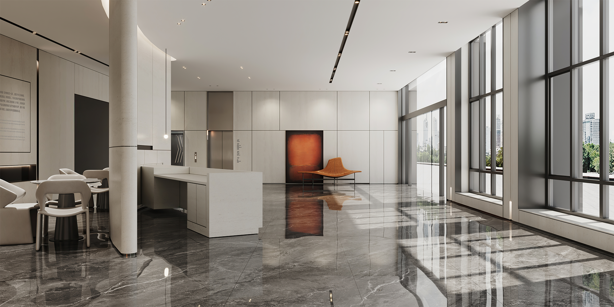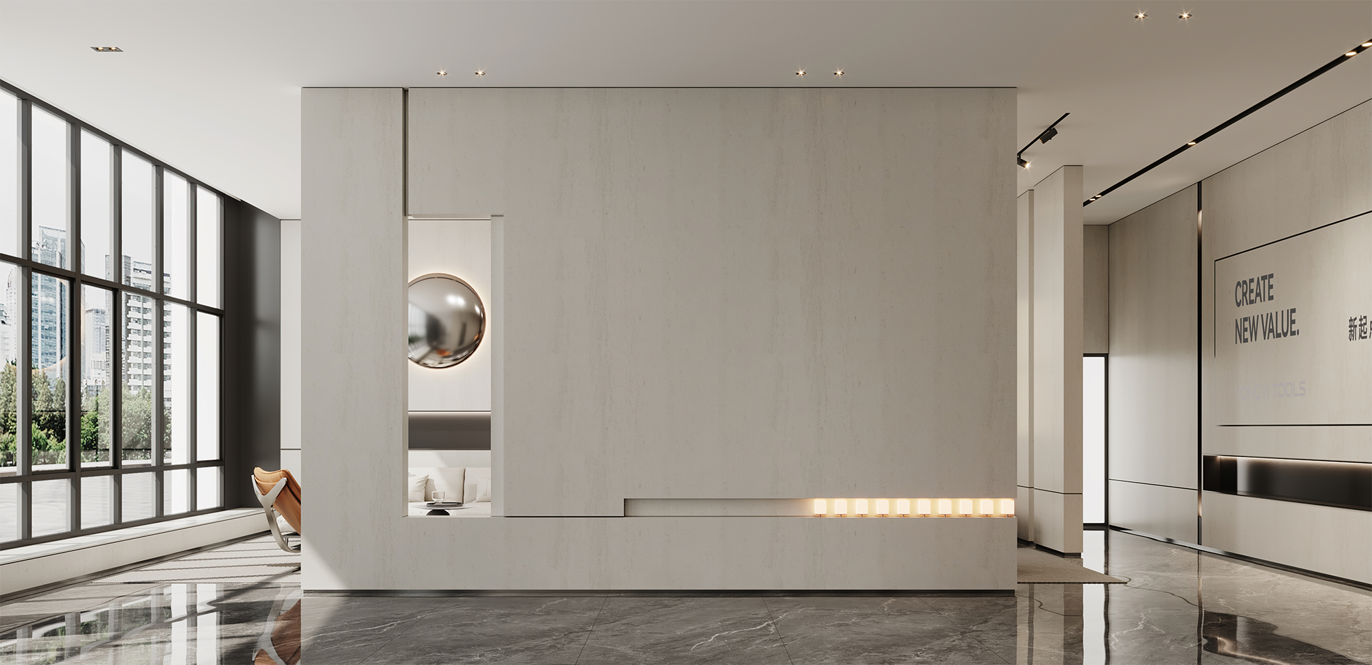 明亮通透的大厅以现代手法设计,加之科技、人文的注入,营造极具现代商务感与包容性的办公空间。接待区内,在整体柔和的基调上,跟随着光影的线条进行延展,空间借由形体、线条、材质的形式组合来表现,打造含蓄且温润的格调。
