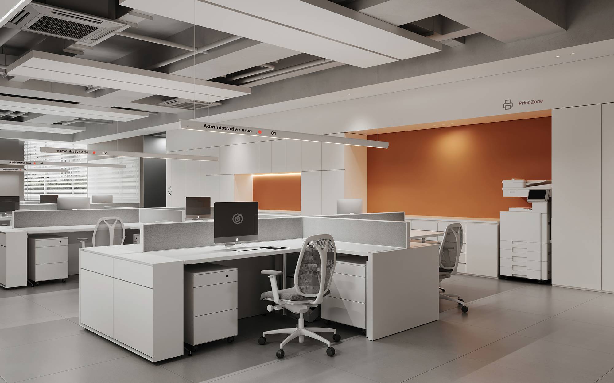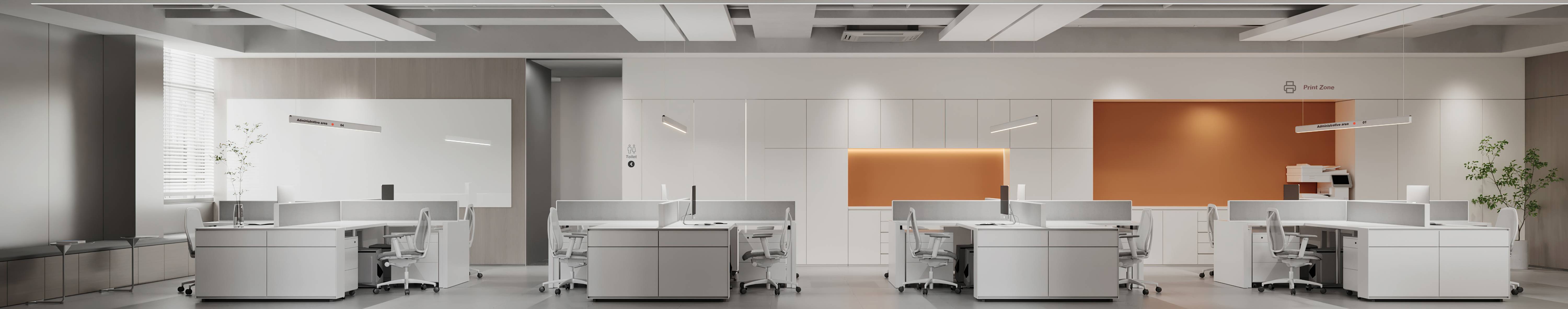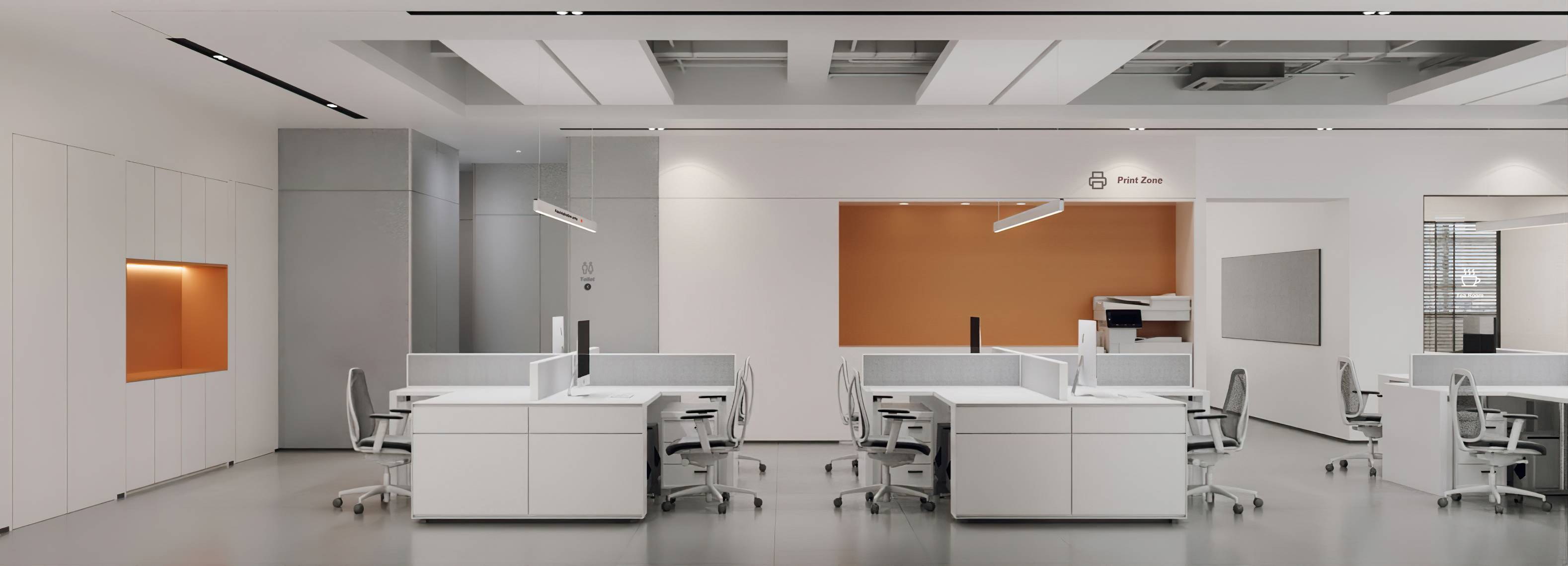 整个空间由柔和的色调构成,纯净的白色,轻盈而明亮,沉稳的咖色与灰色,平和而舒适,共同打造现代商务感空间。同时,缀入明亮的品牌橙色,打破了空间的平静,营造温暖、积极的氛围。