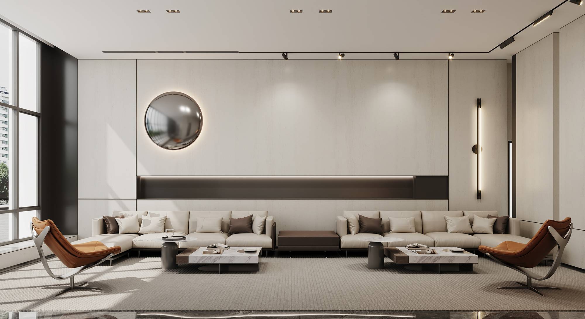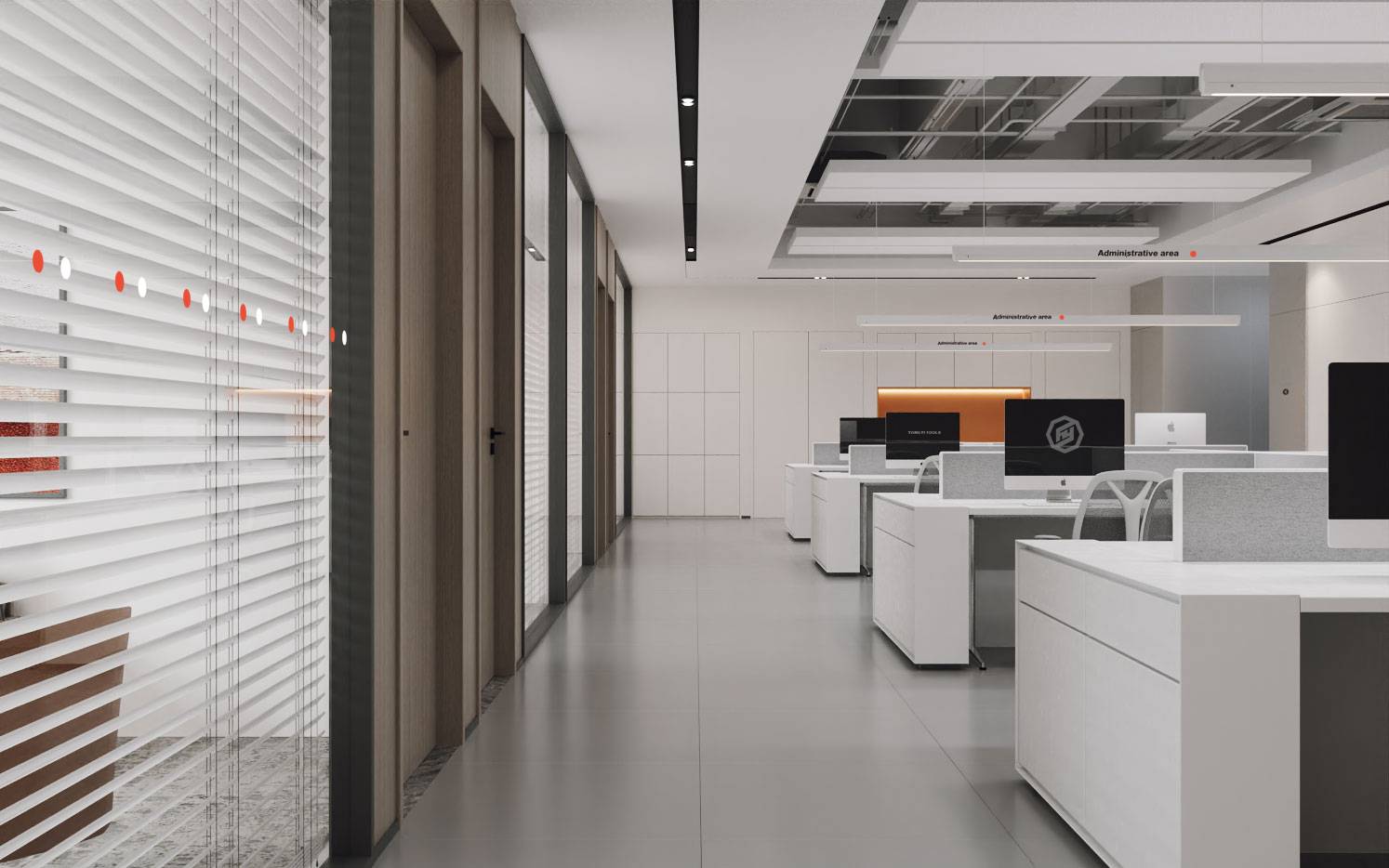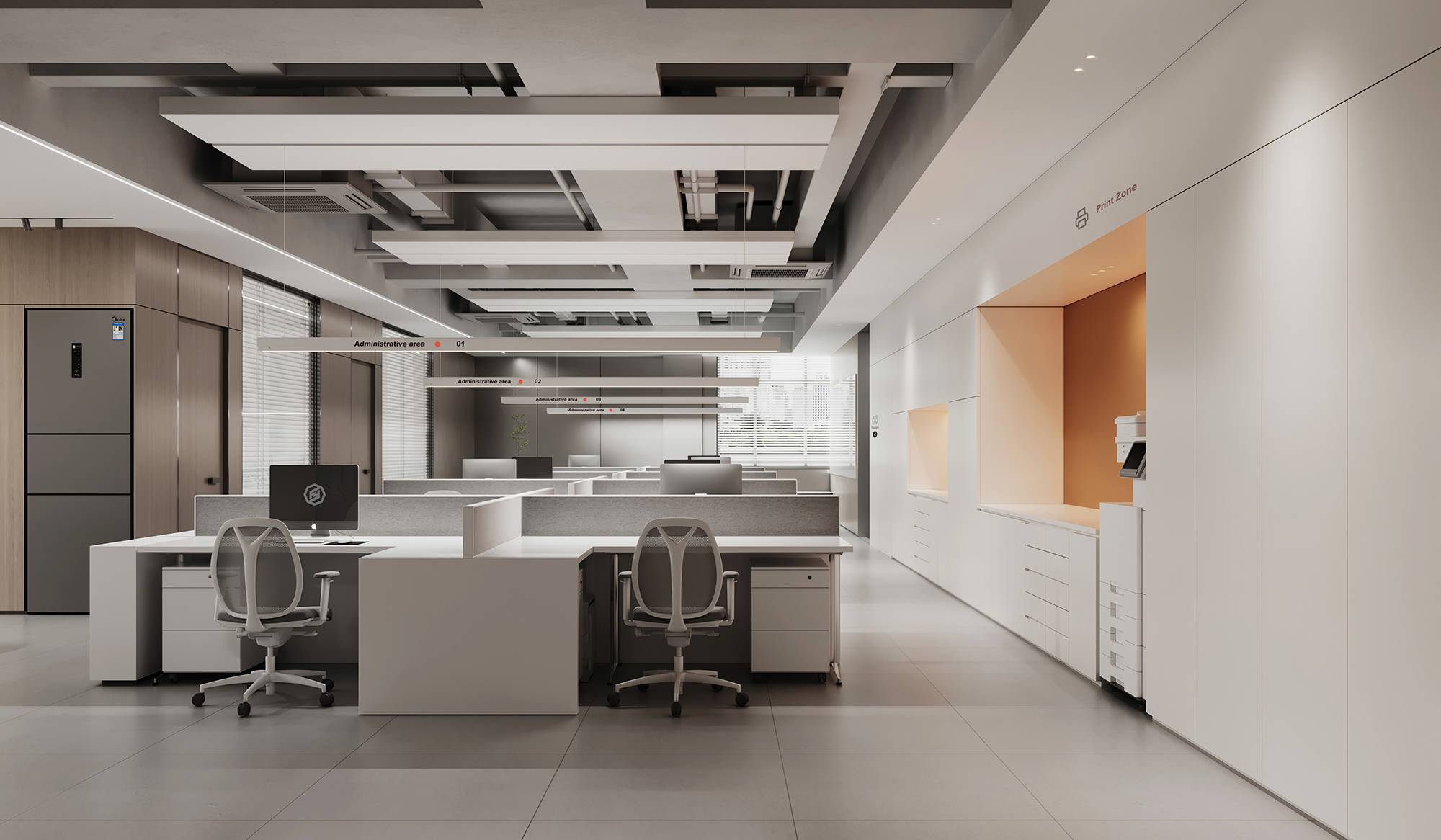 整个空间由柔和的色调构成,纯净的白色,轻盈而明亮,沉稳的咖色与灰色,平和而舒适,共同打造现代商务感空间。同时,缀入明亮的品牌橙色,打破了空间的平静,营造温暖、积极的氛围。