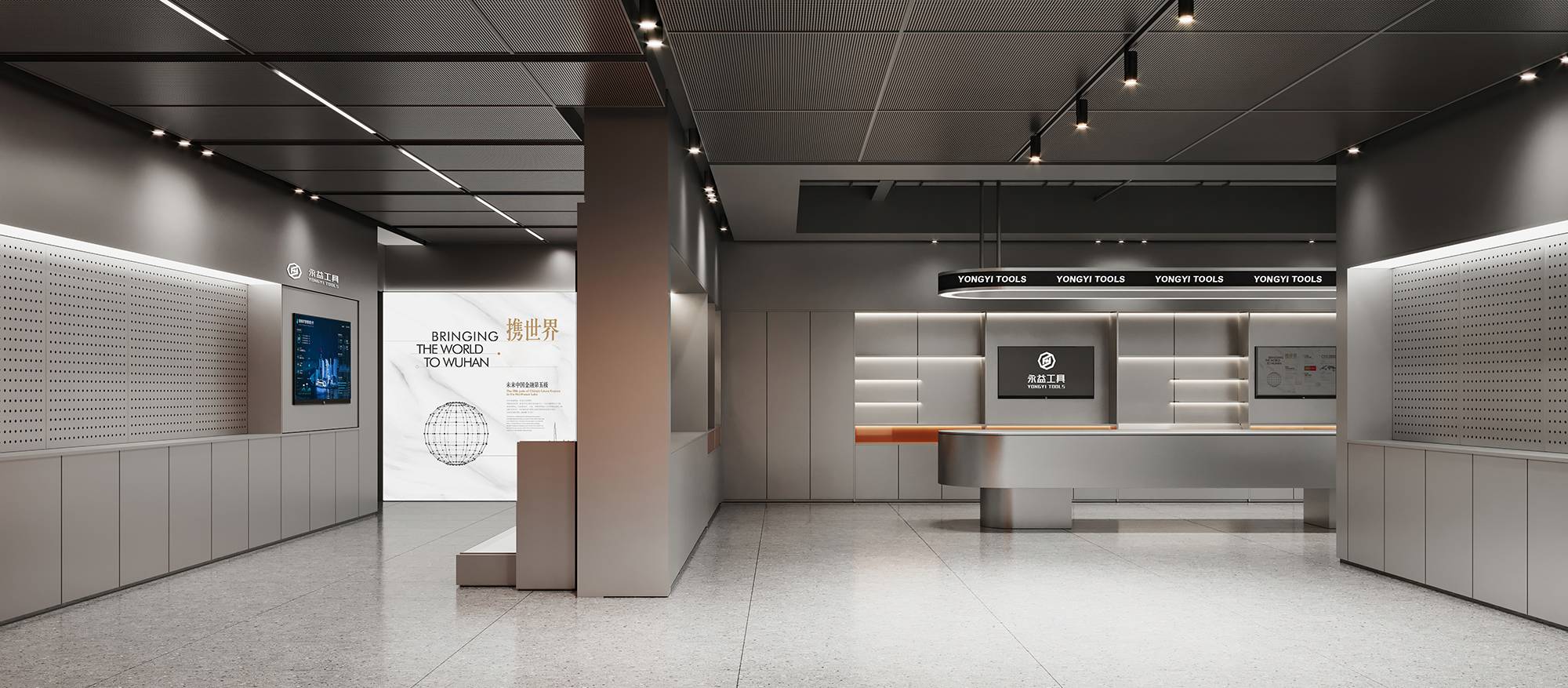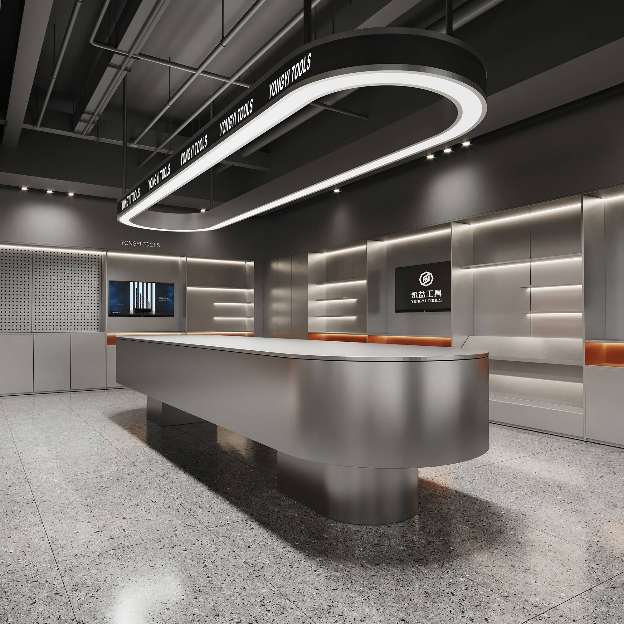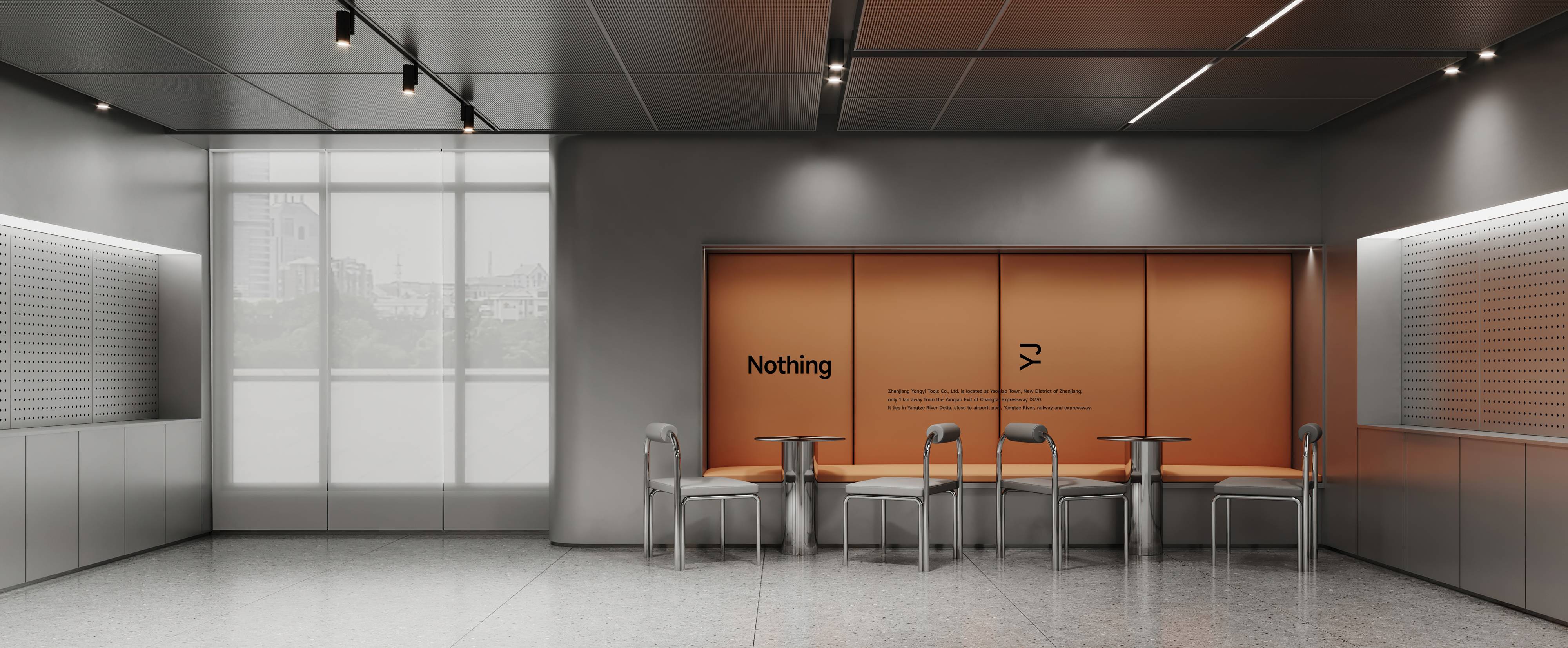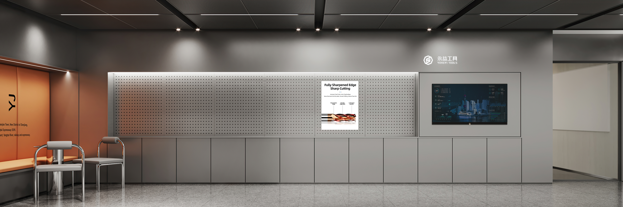 样品间延续一层展厅设计,科技感金属与温暖品牌橙在这里碰撞,并借助简洁的材质与形态,创造独特的视觉感受。同时,呼应着永益的思想表达,寓意着超前技术与人文温情的交织。
