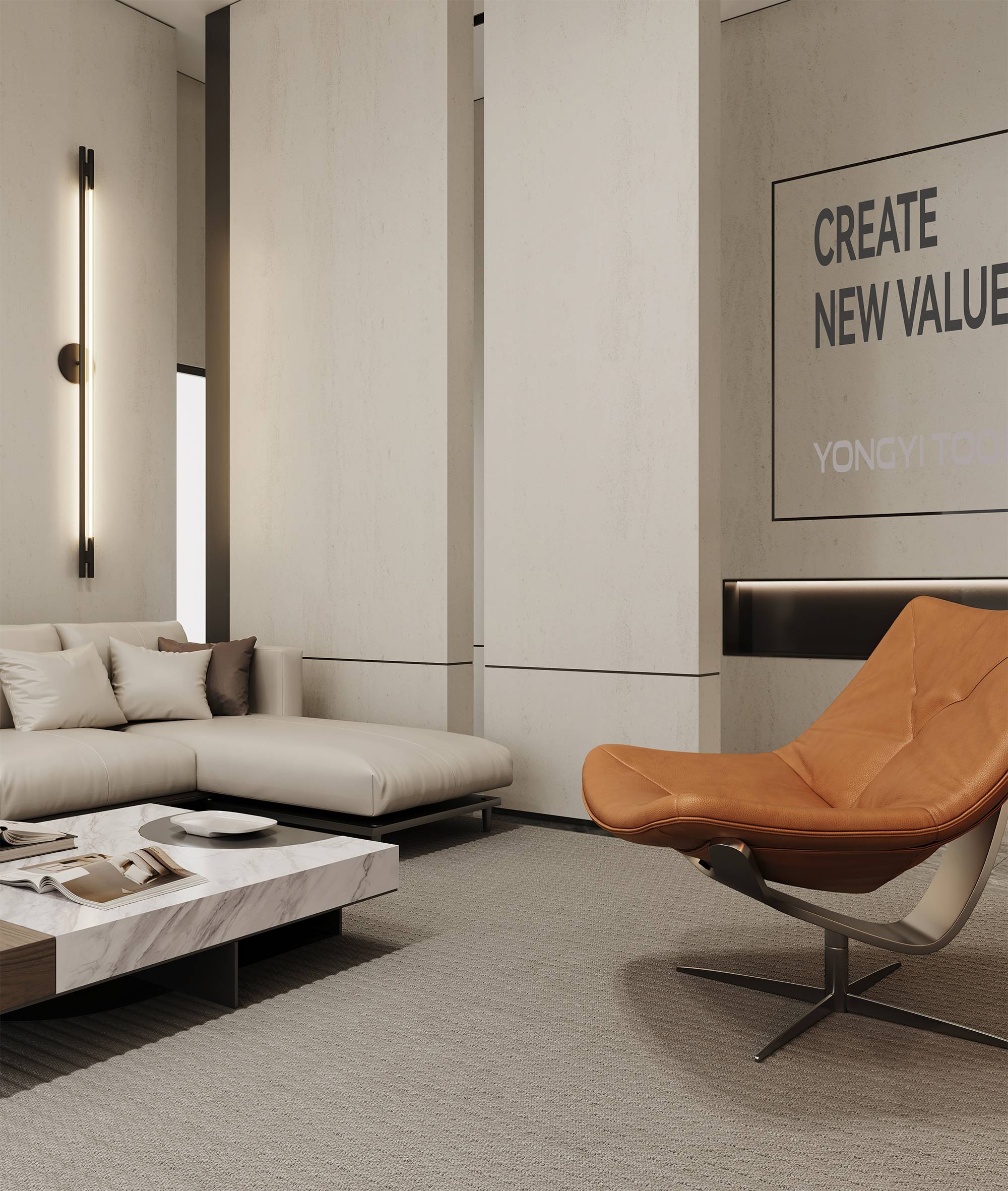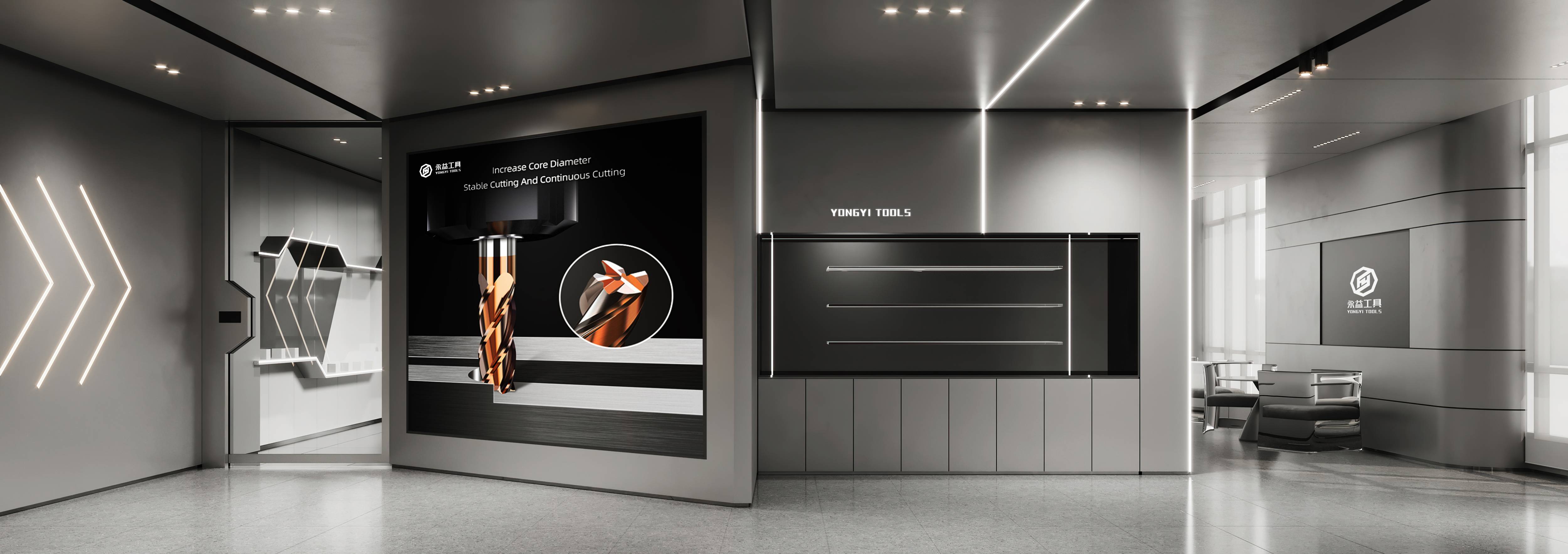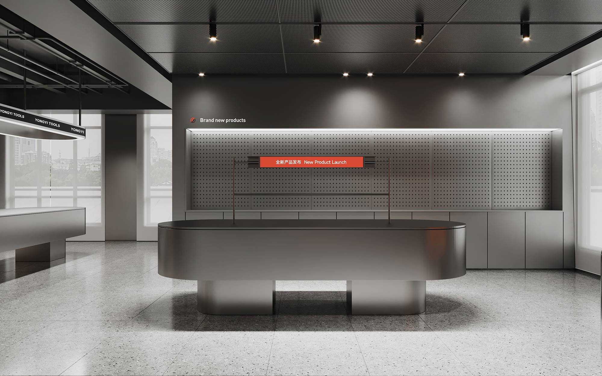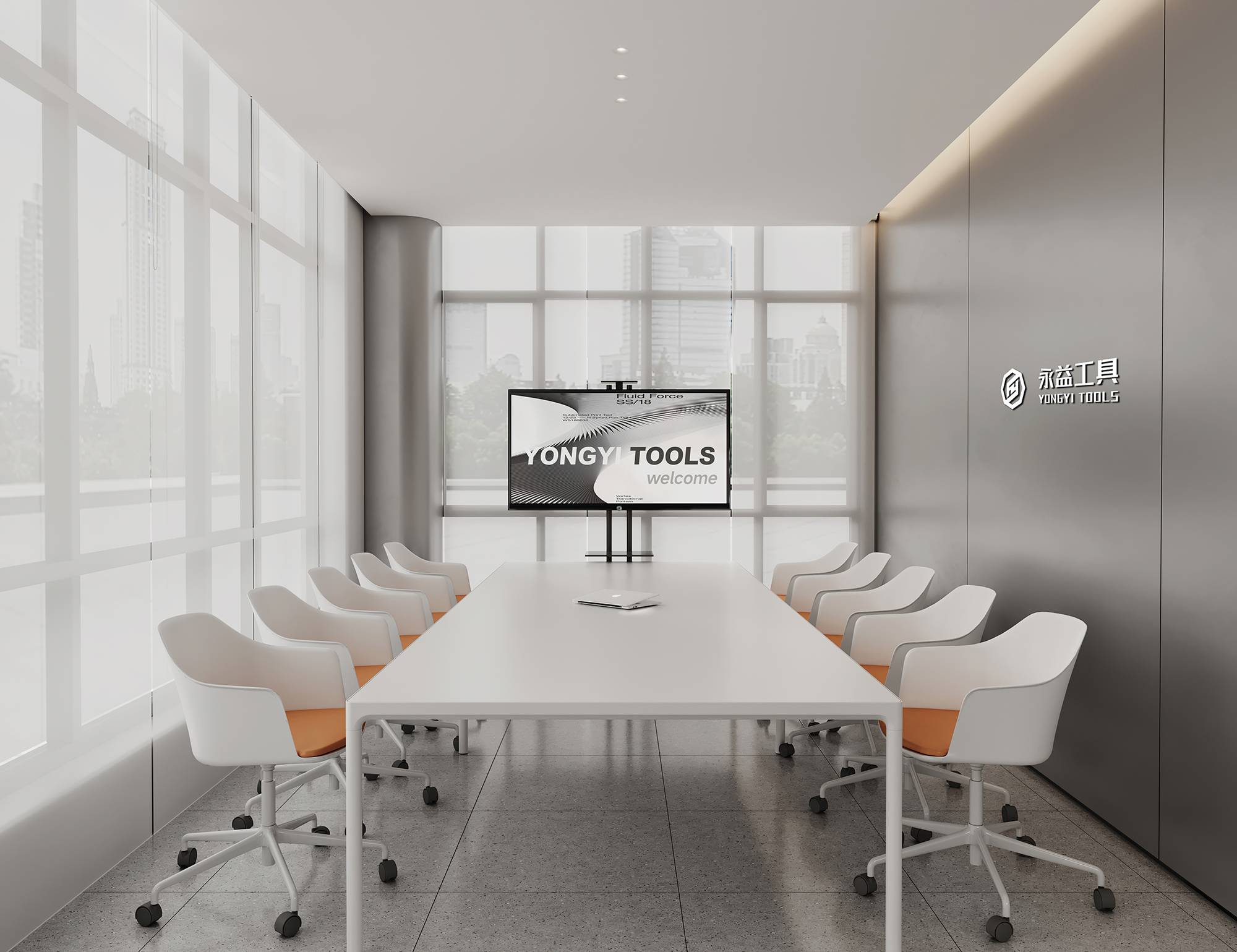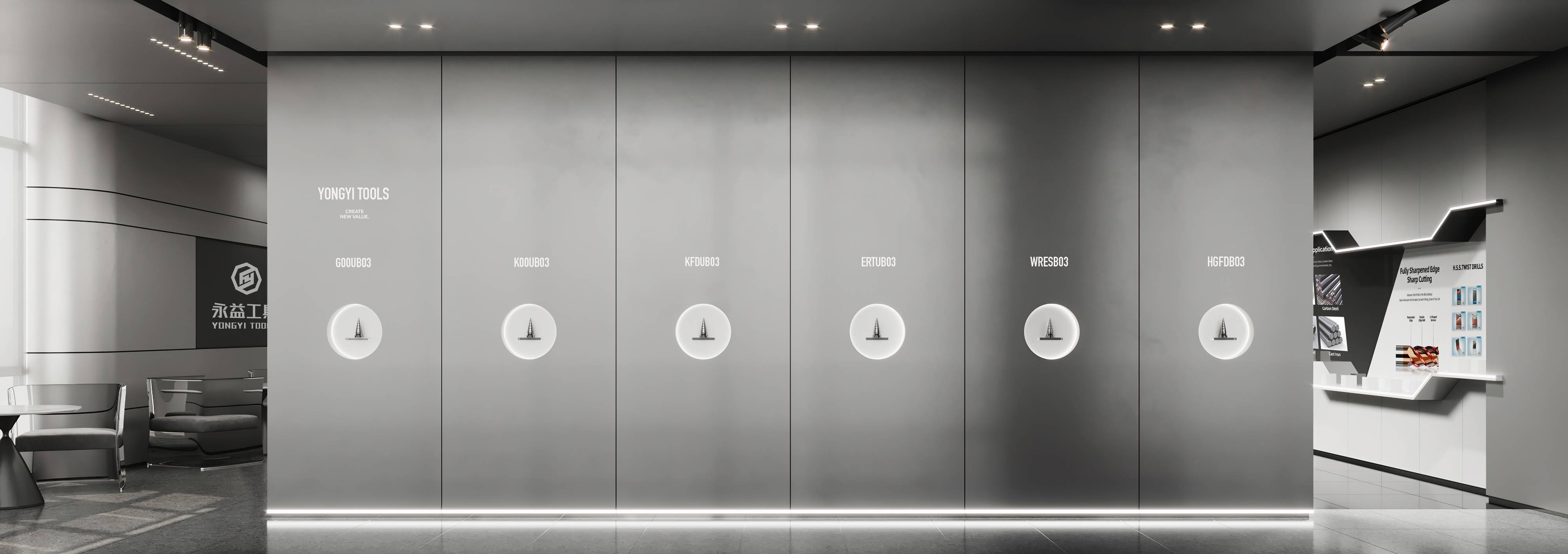 样品间延续一层展厅设计,科技感金属与温暖品牌橙在这里碰撞,并借助简洁的材质与形态,创造独特的视觉感受。同时,呼应着永益的思想表达,寓意着超前技术与人文温情的交织。