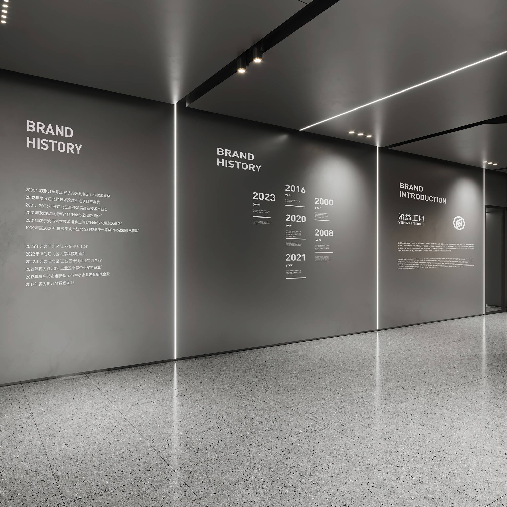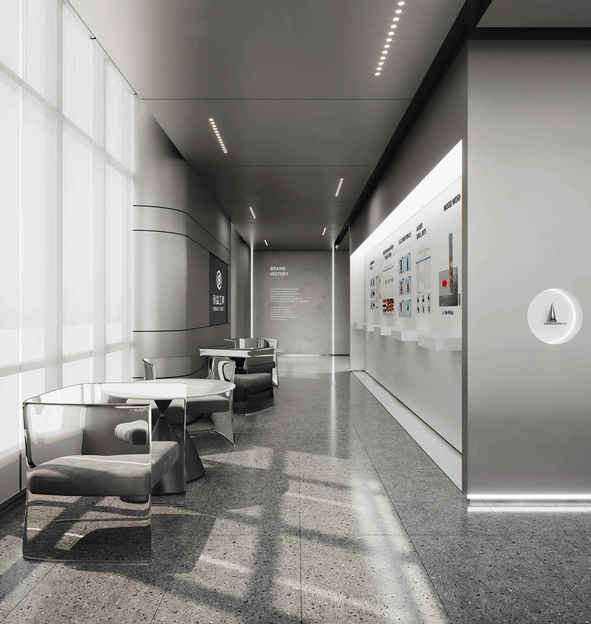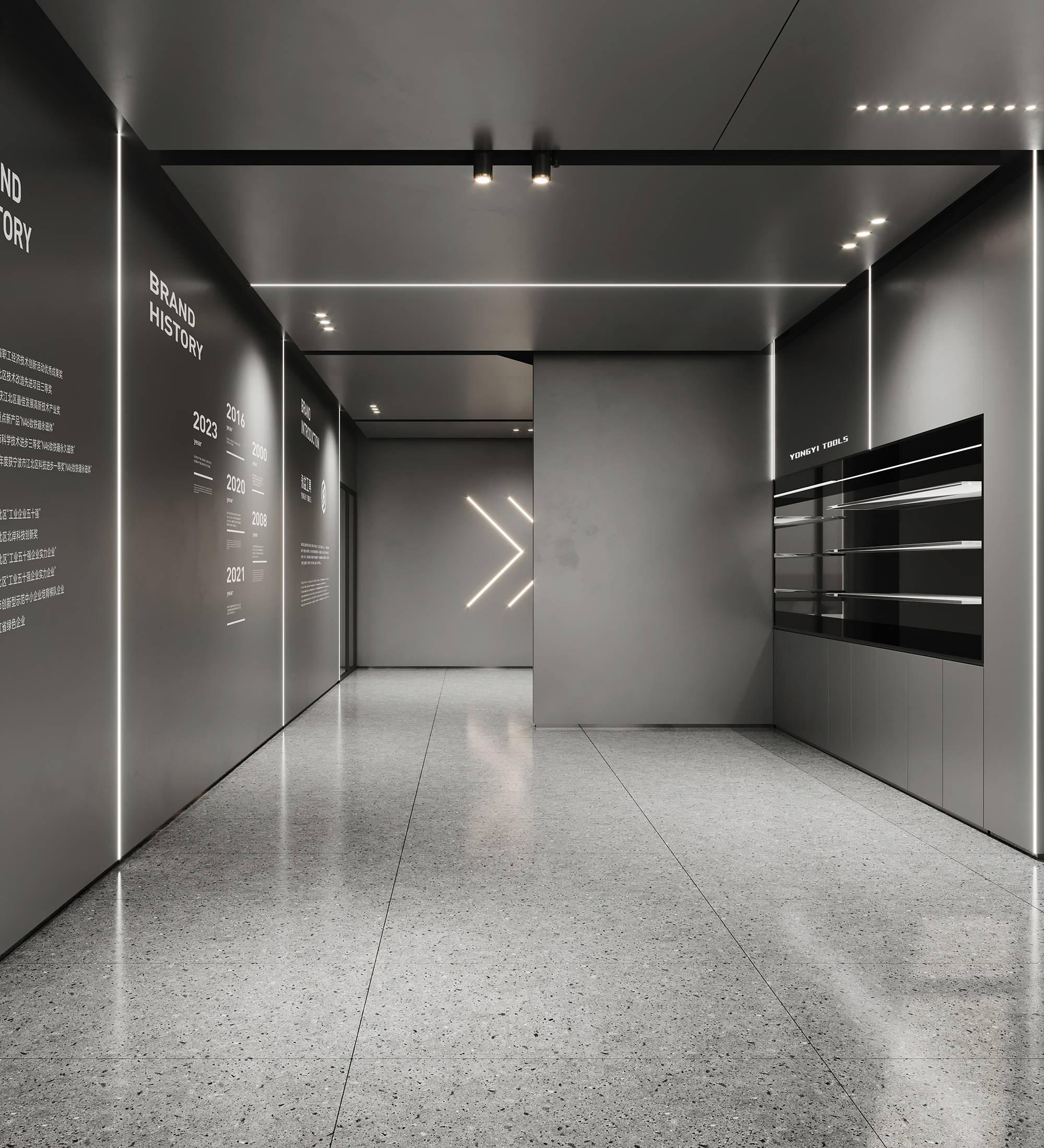 展厅区域以富有未来感的金属漆定调,利用内嵌式灯带构建科技感,并依据企业历程讲述,循序渐进地串联起空间。多样化的展陈手法为单一空间赋予丰富的层次,让穿梭其中的访客得到更好的探索体验。