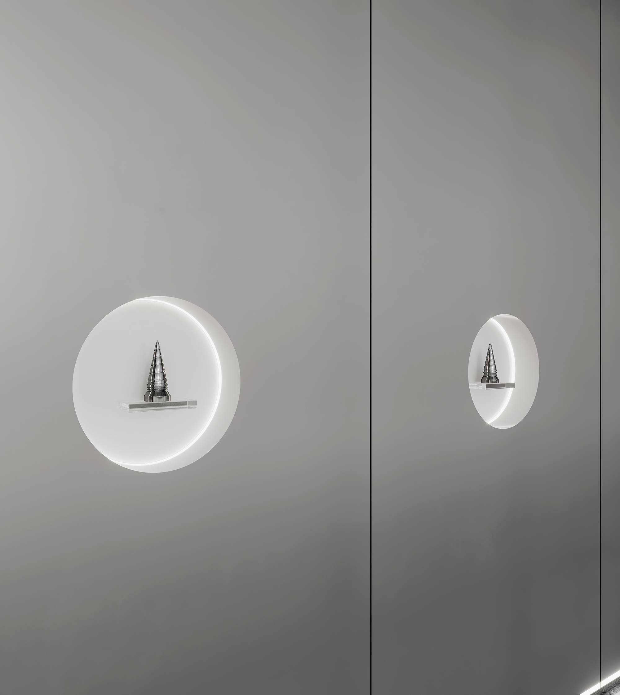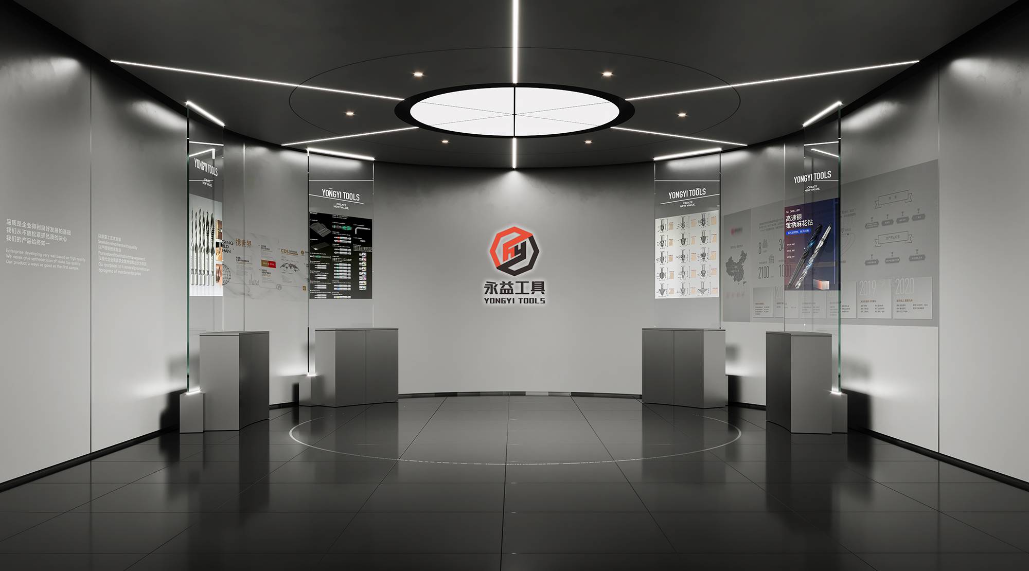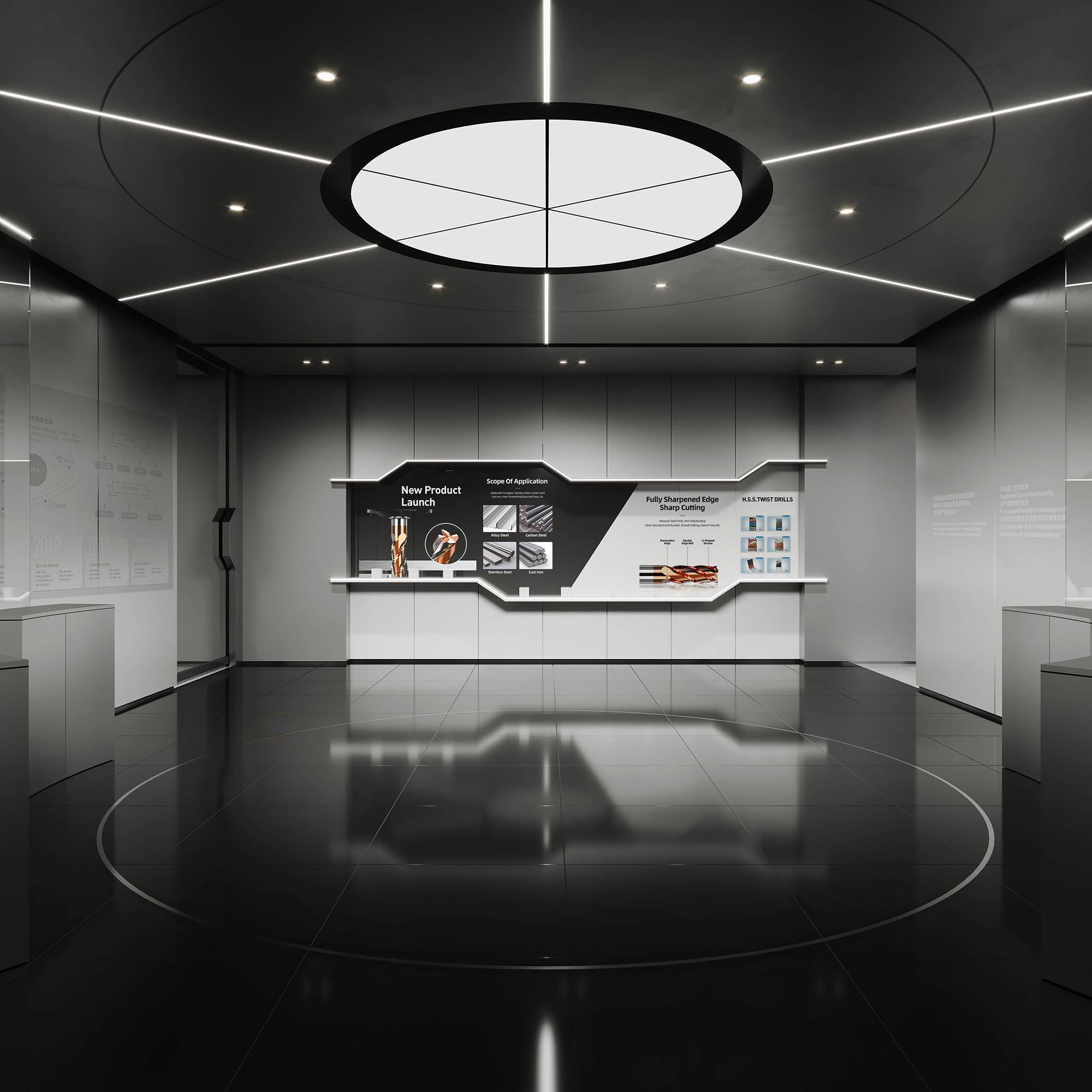 展厅区域以富有未来感的金属漆定调,利用内嵌式灯带构建科技感,并依据企业历程讲述,循序渐进地串联起空间。多样化的展陈手法为单一空间赋予丰富的层次,让穿梭其中的访客得到更好的探索体验。
