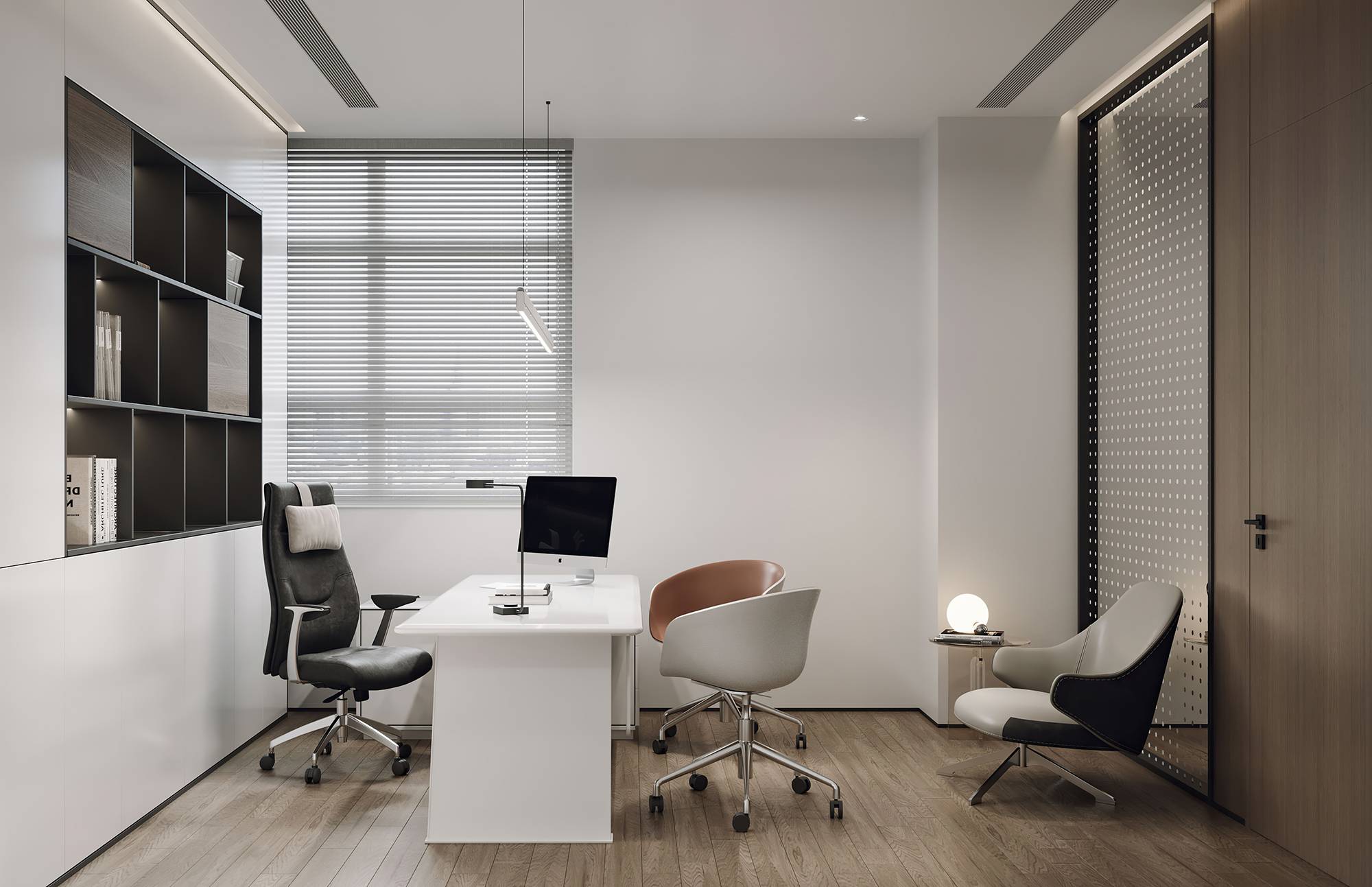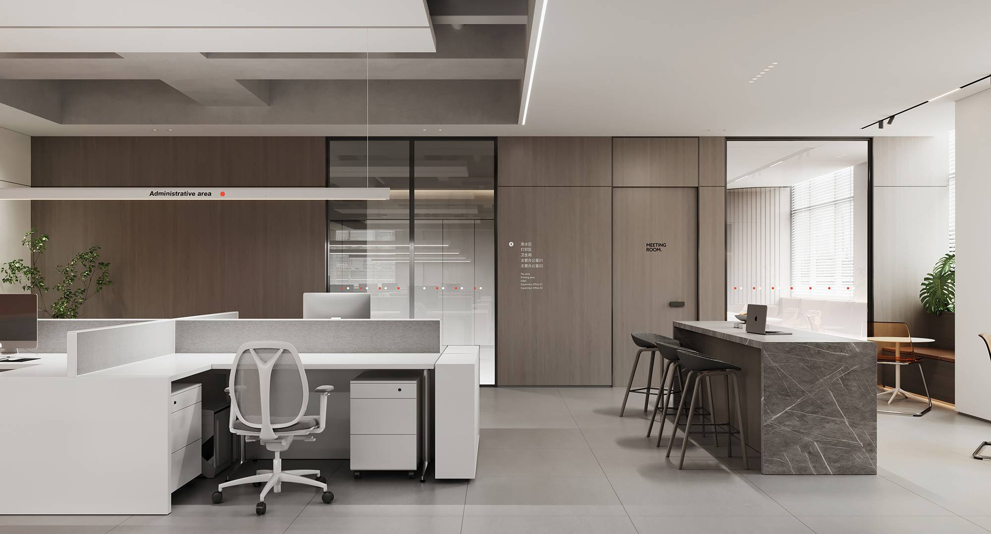 走出电梯来到二层,通过温润的材质与细节质感,创造静谧内敛的氛围感。办公空间内以开放式的设计,强调人与人之间的交流合作,鼓励没有界限感的思想碰撞。白灰木的空间之中,一抹橙色跃入眼前,打破平静,为空间注入活力,同时加深企业形象。另设有茶水吧台,实现在此进行工作到生活的轻松切换。
