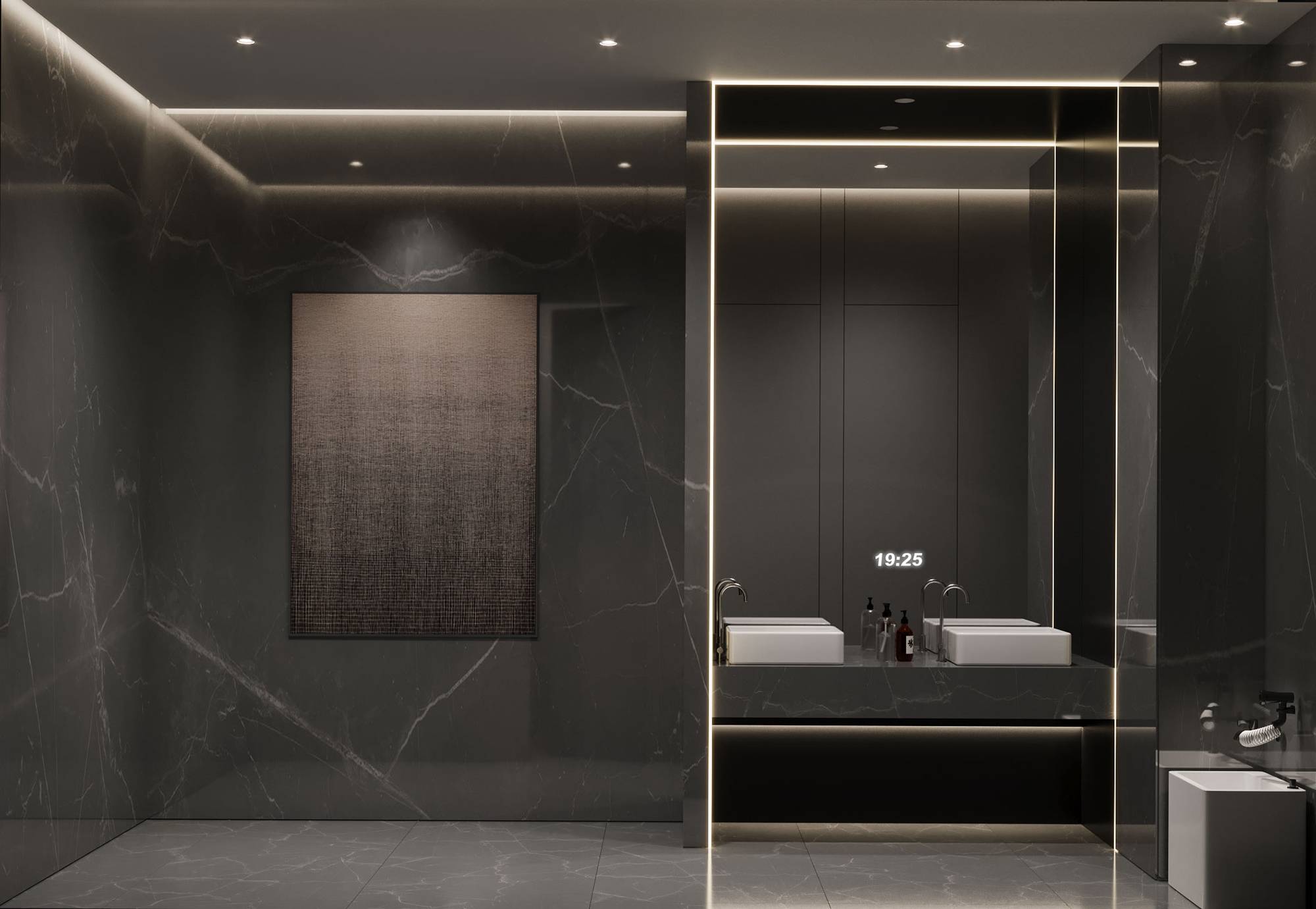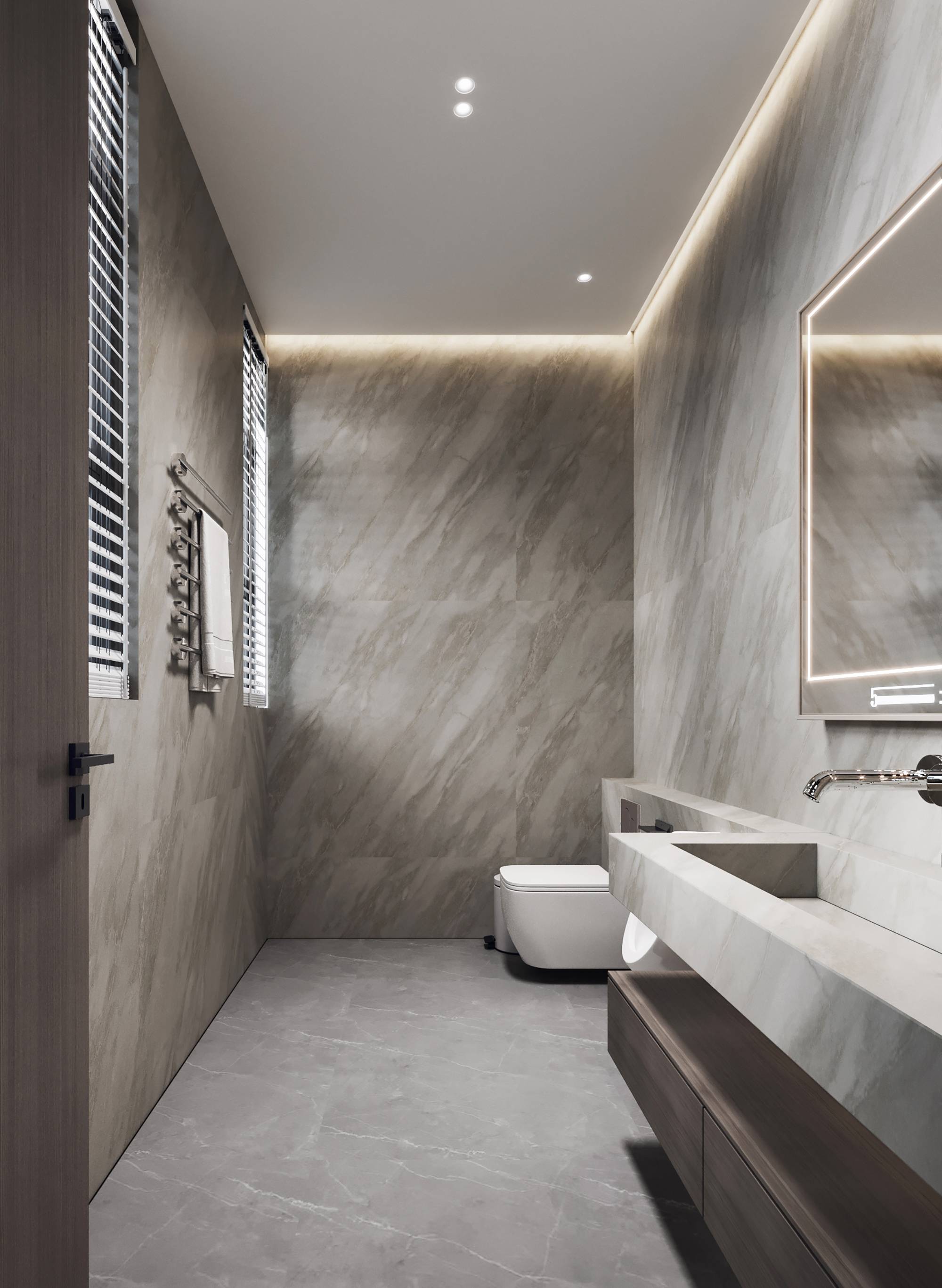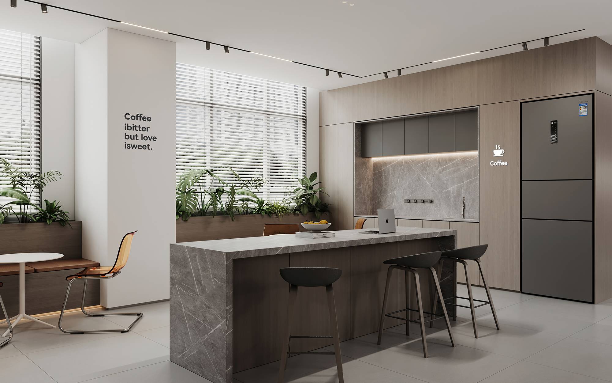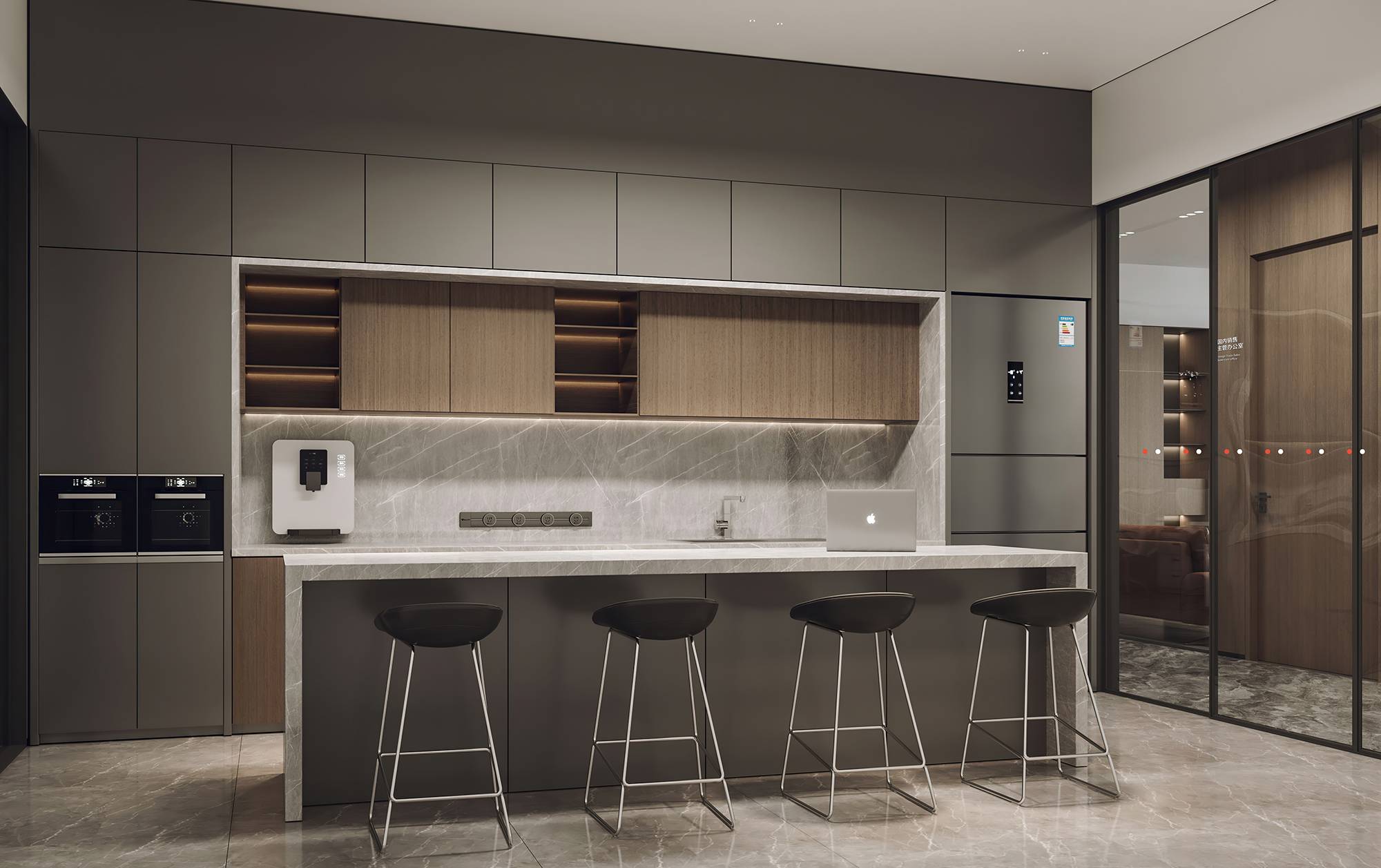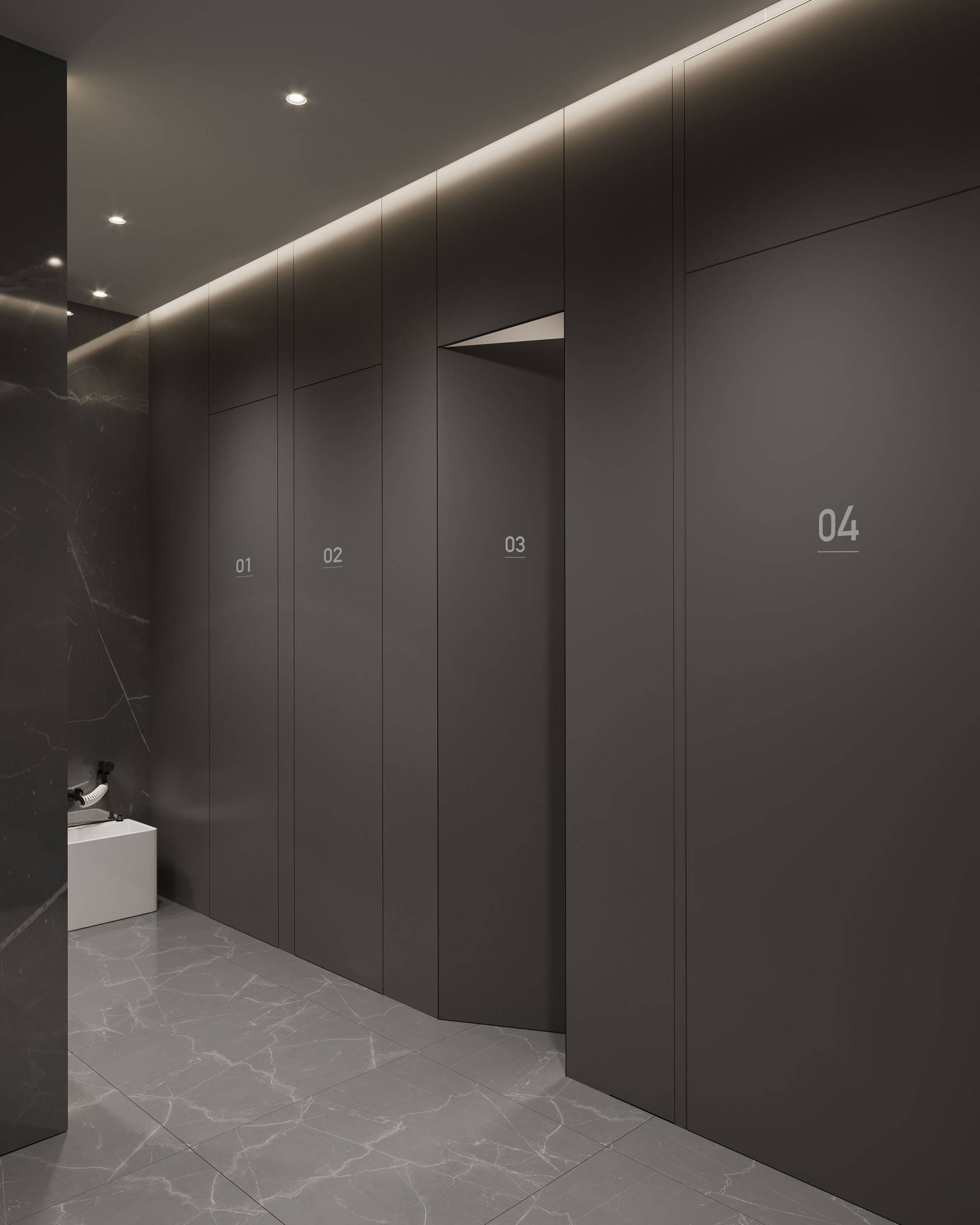 茶水间与卫生间各置于空间一隅,以银灰色调为主要呈现,呼应电梯厅的设计,形成一个连贯闭合空间,并兼具美学与功能。
