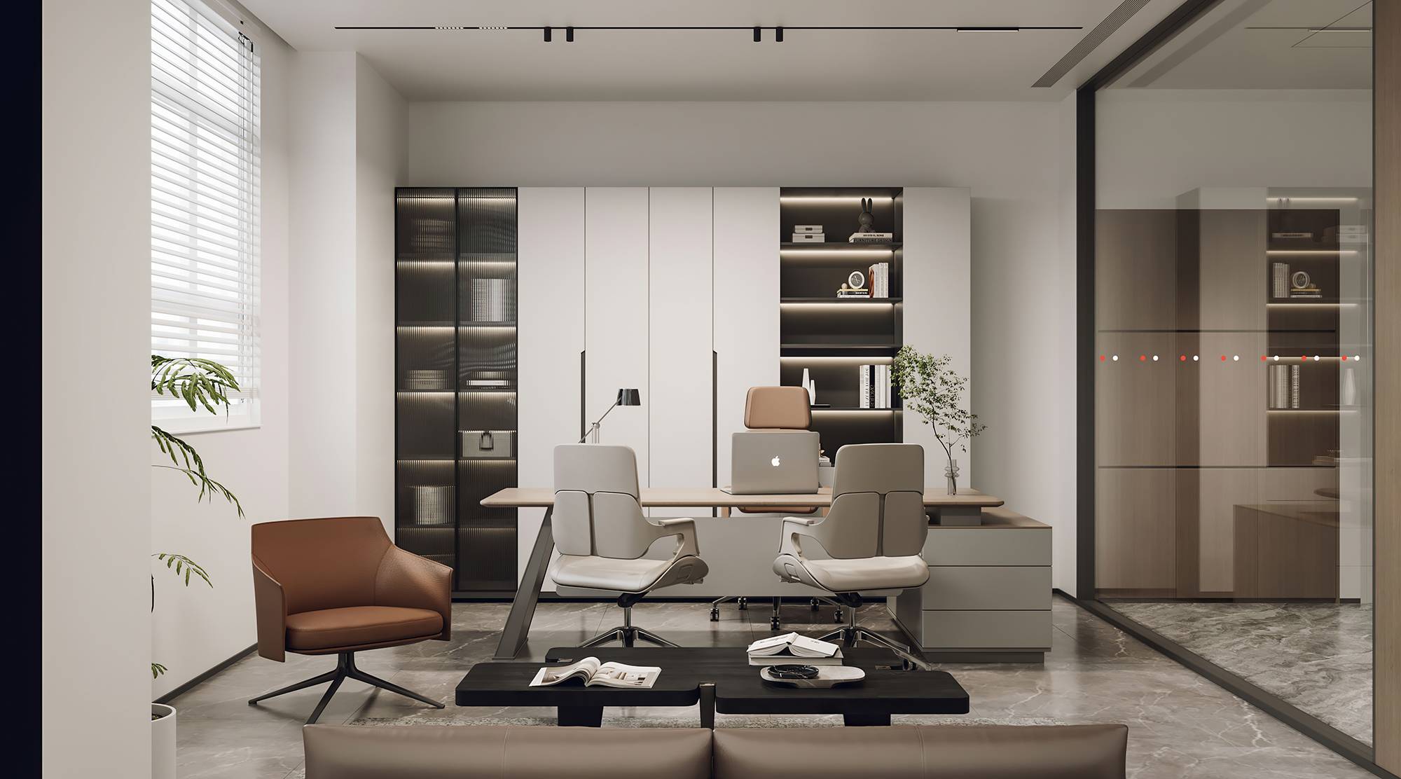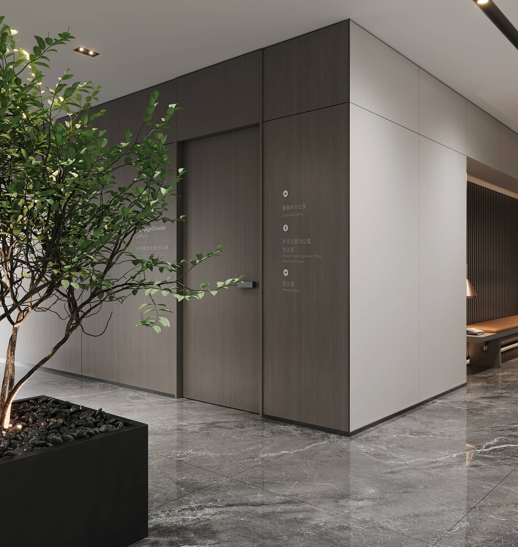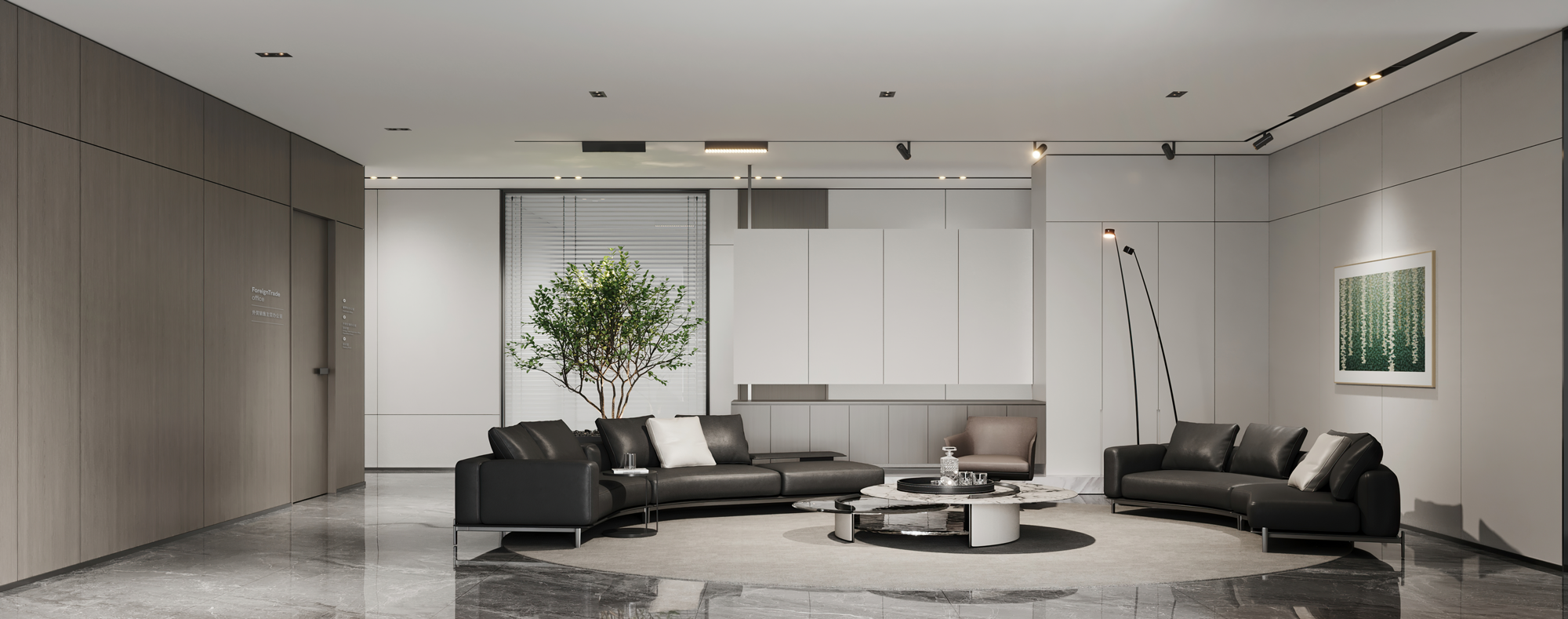 另设有商务接待区,以简洁舒适的风格形成休闲轻松的交谈氛围,让社交互动能够更和谐、愉悦,进一步增加人与人的紧密性,从而提升工作质量。过道处,温暖的光线与充满生机的绿植,共同营造一个闲适的落座区,以提供短暂的休憩。
